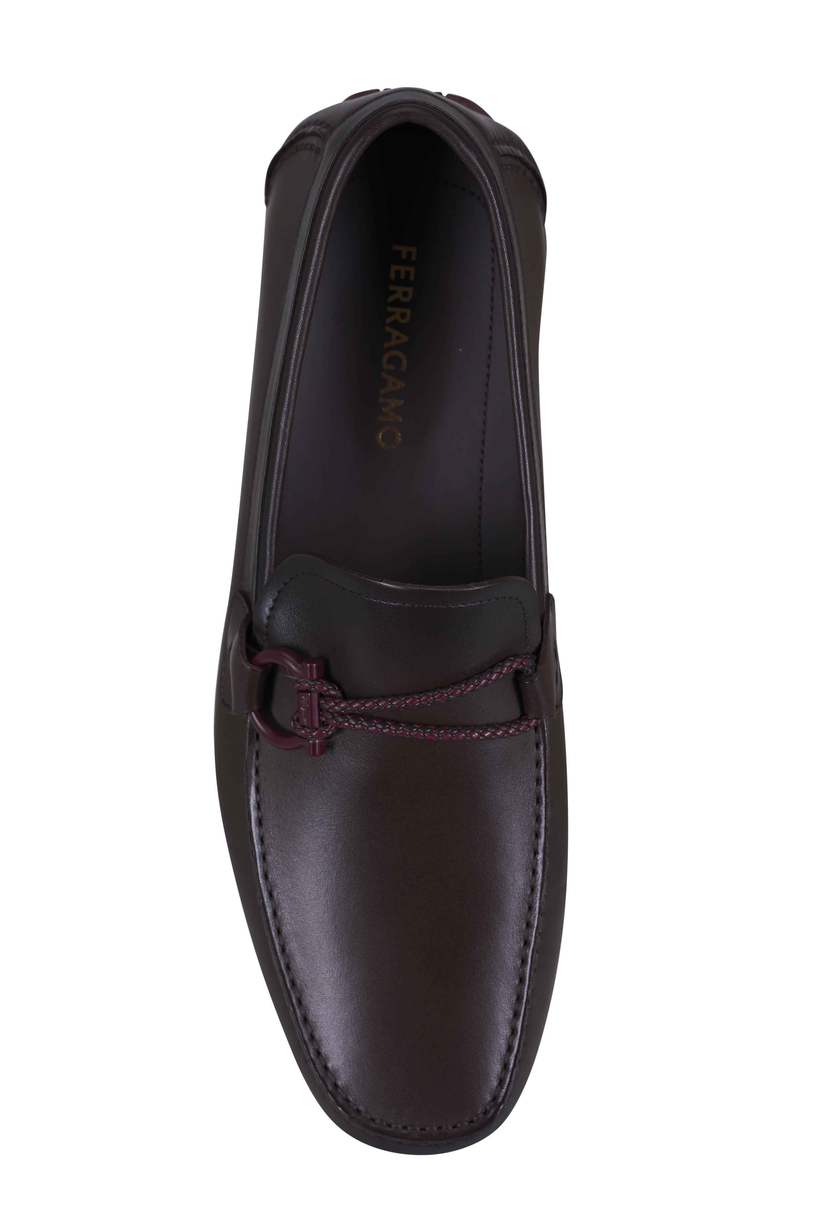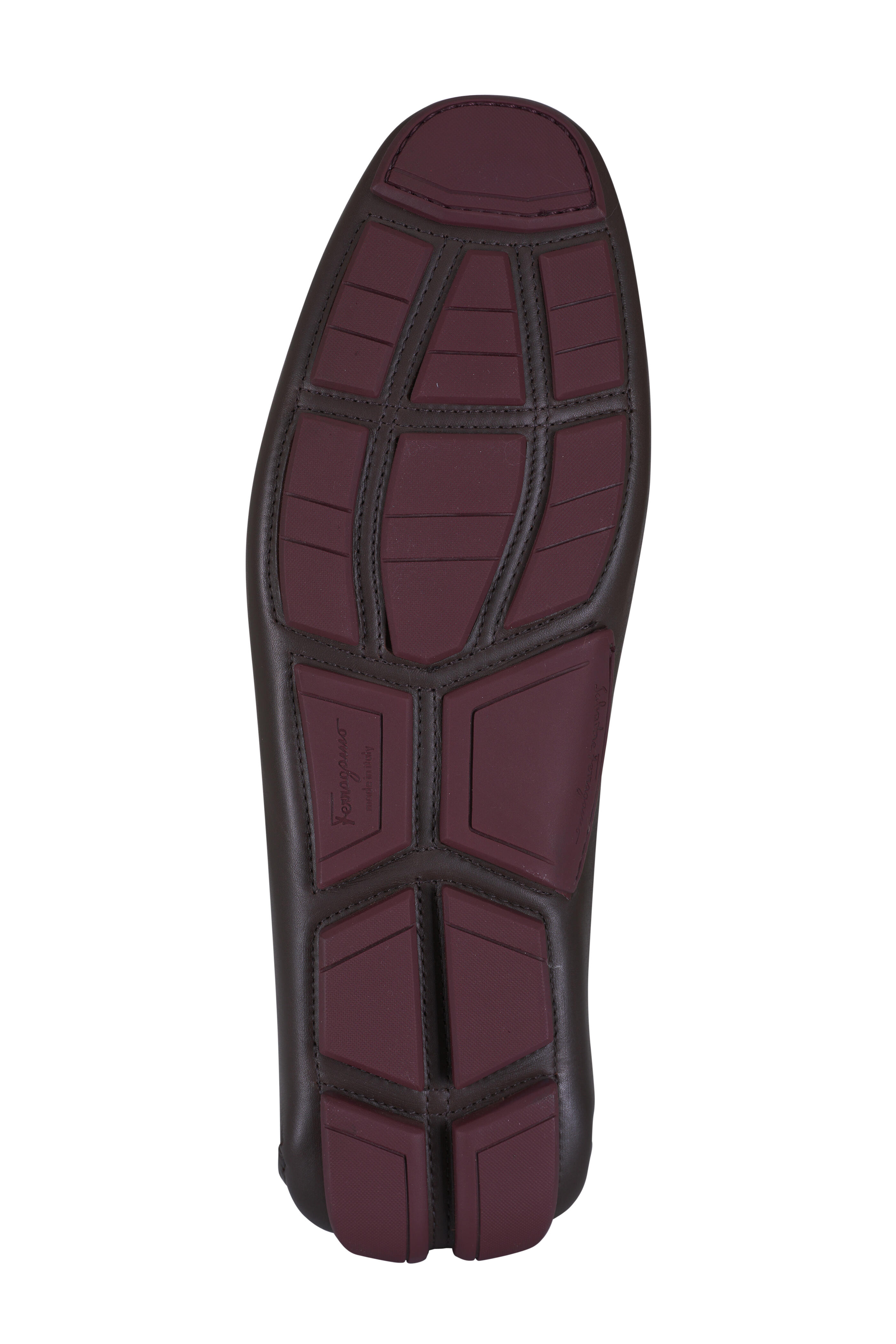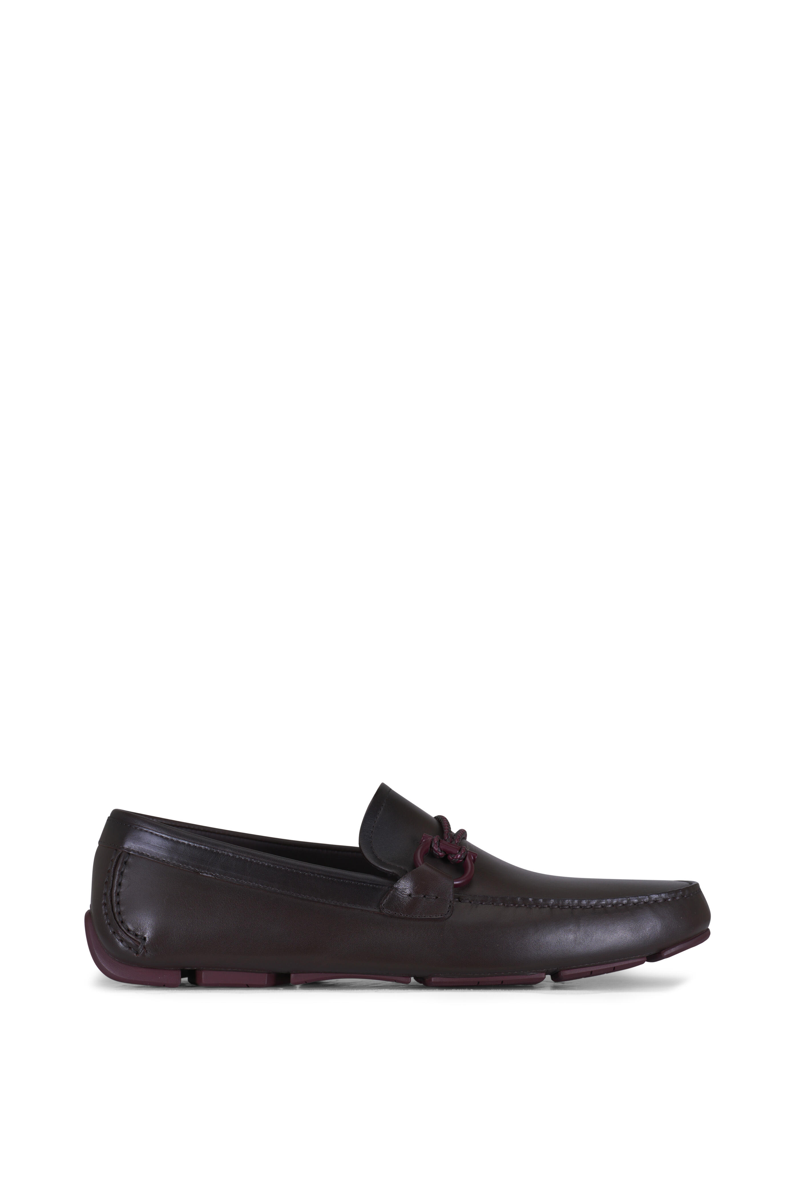 Leather upper. Moc toe. Signature logo at vamp. Slip on style. Leather lining and insole. Pebbled rubber sole. Made in Italy.