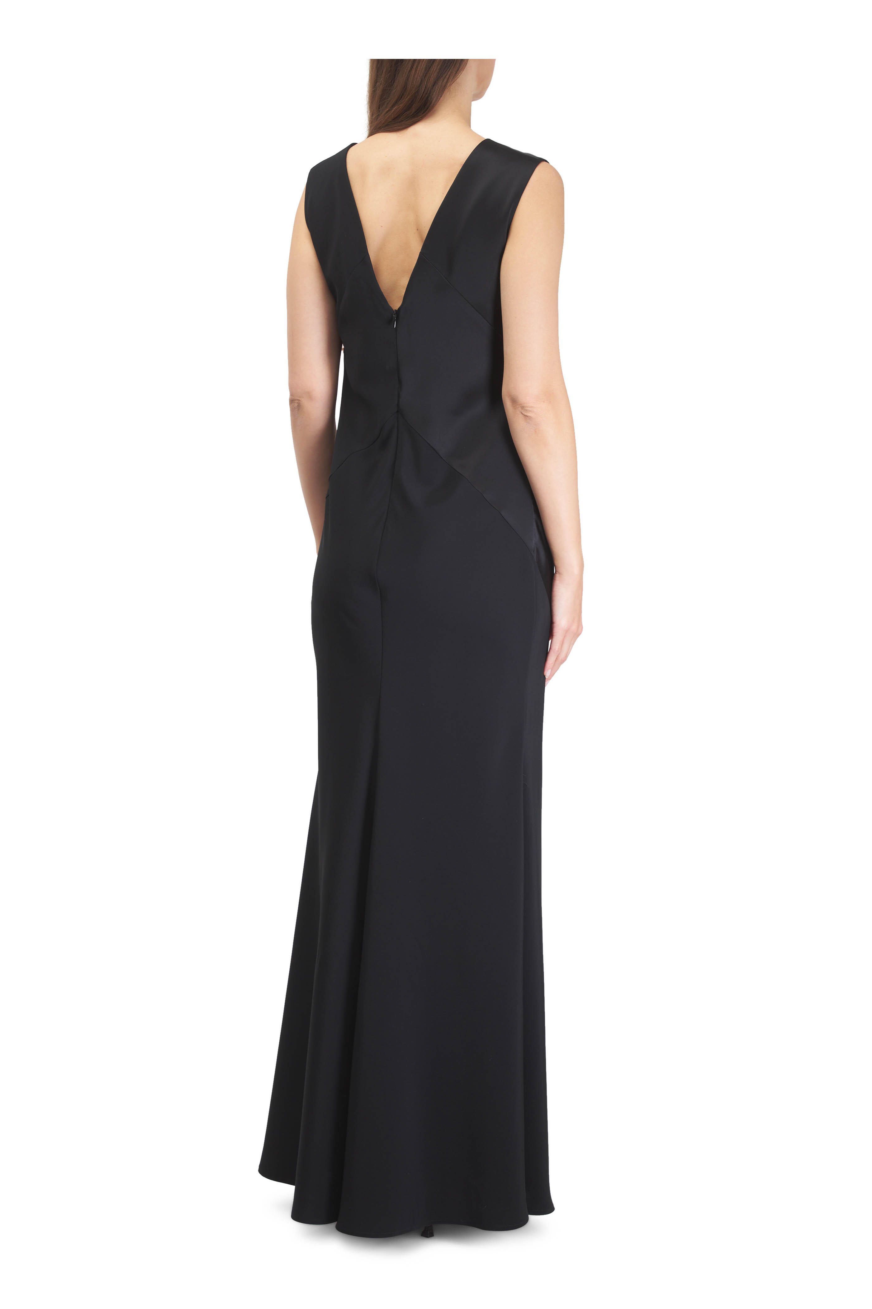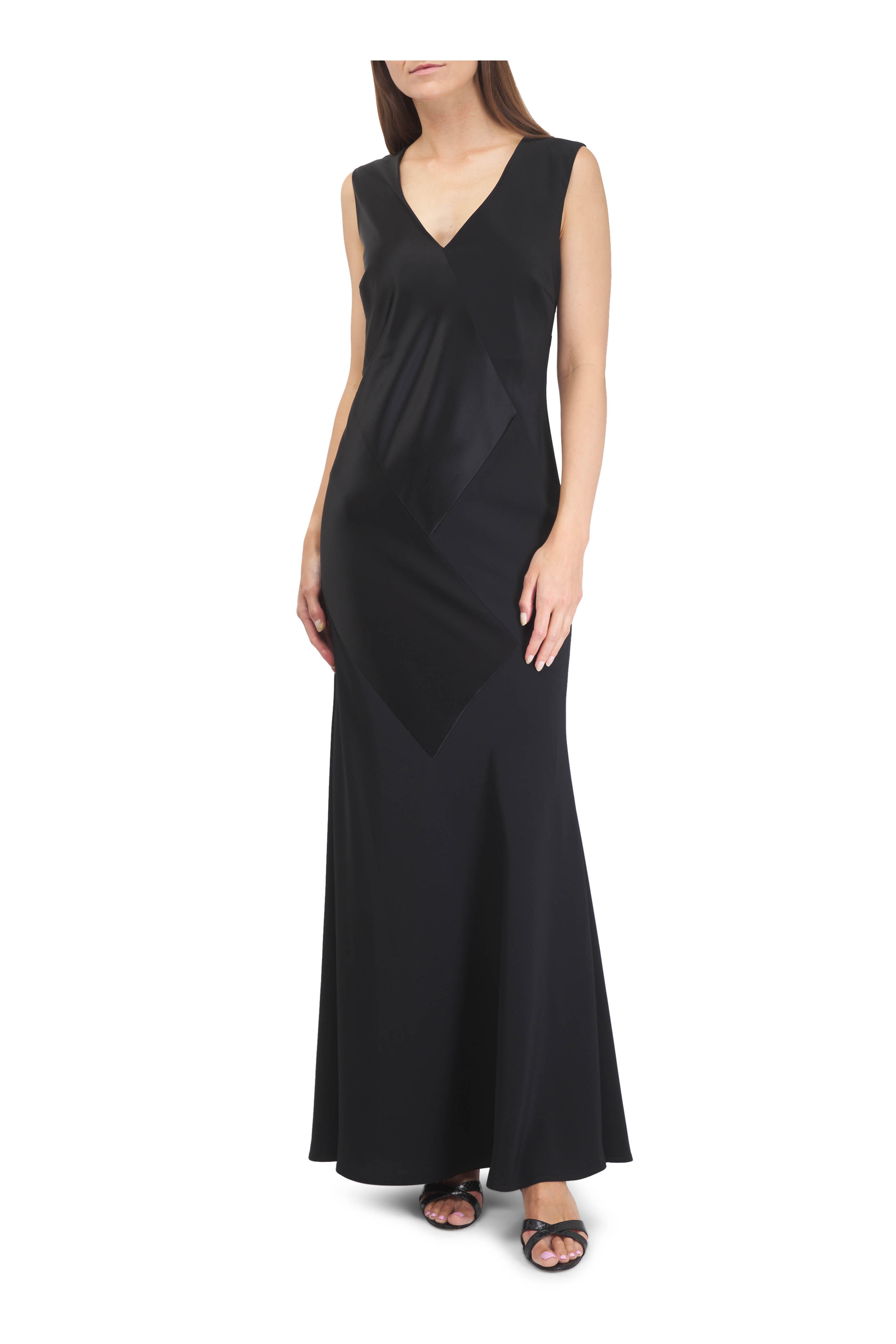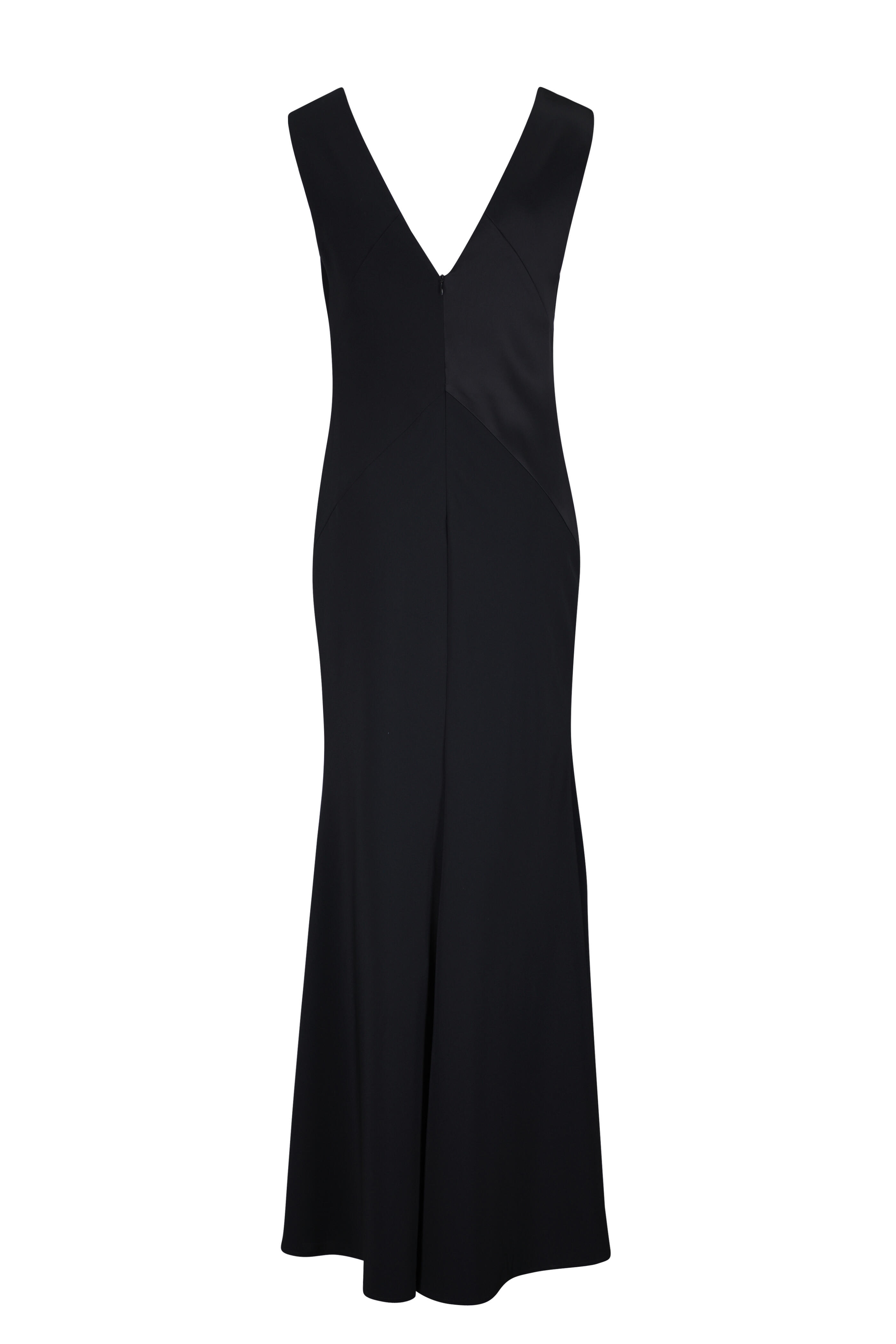 V-neckline. Concealed back zip. Made in Italy. Shoulder to hem 60" (size 6). 82% triacetate, 18% polyethylene; Lining: 92% silk, 8% elastane. Dry clean.
