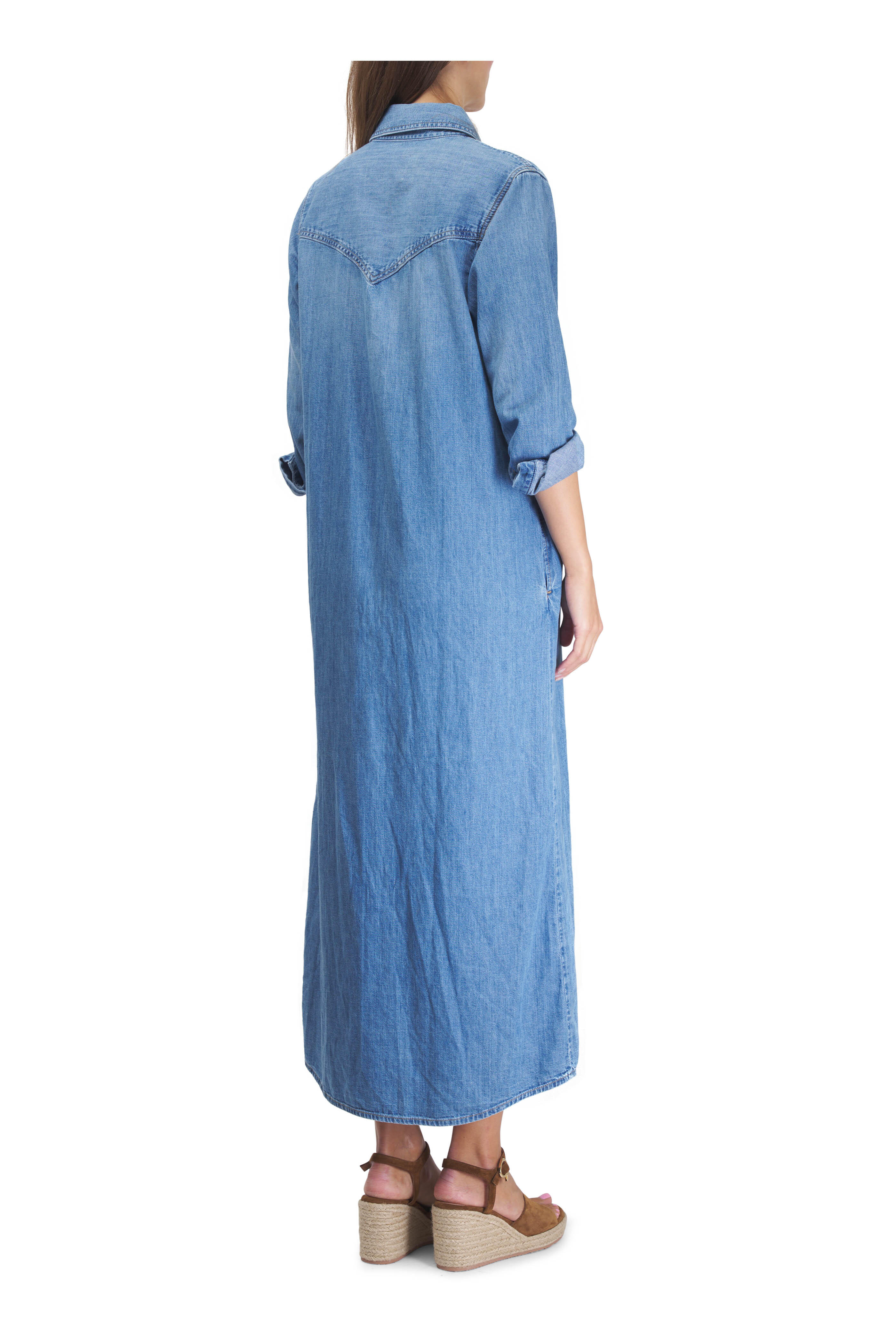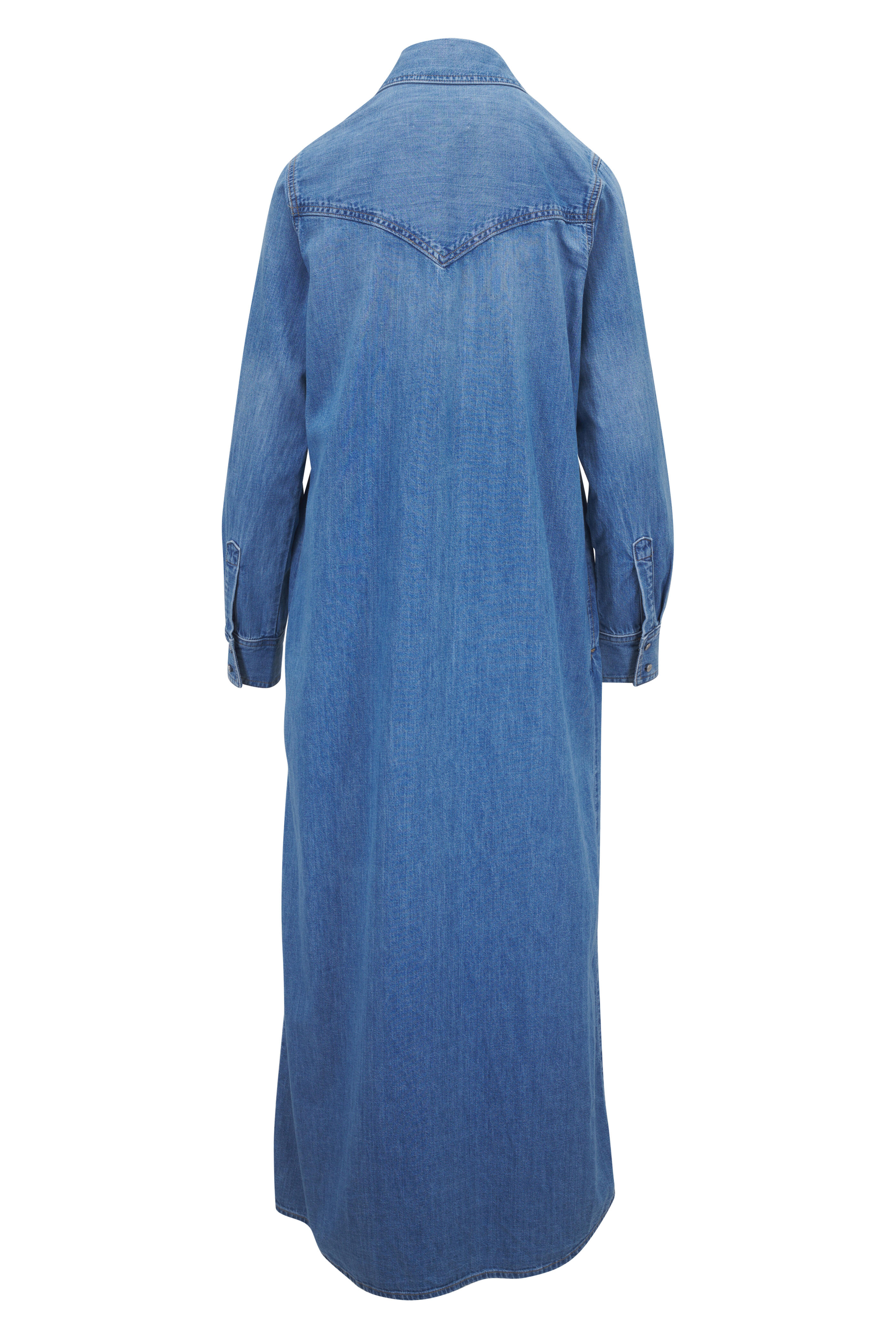Spread collar. Front button placket. Double button square cuffs. Straight hem. Made in the USA. Shoulder to hem 57" (size s). 100% cotton. Machine wash.