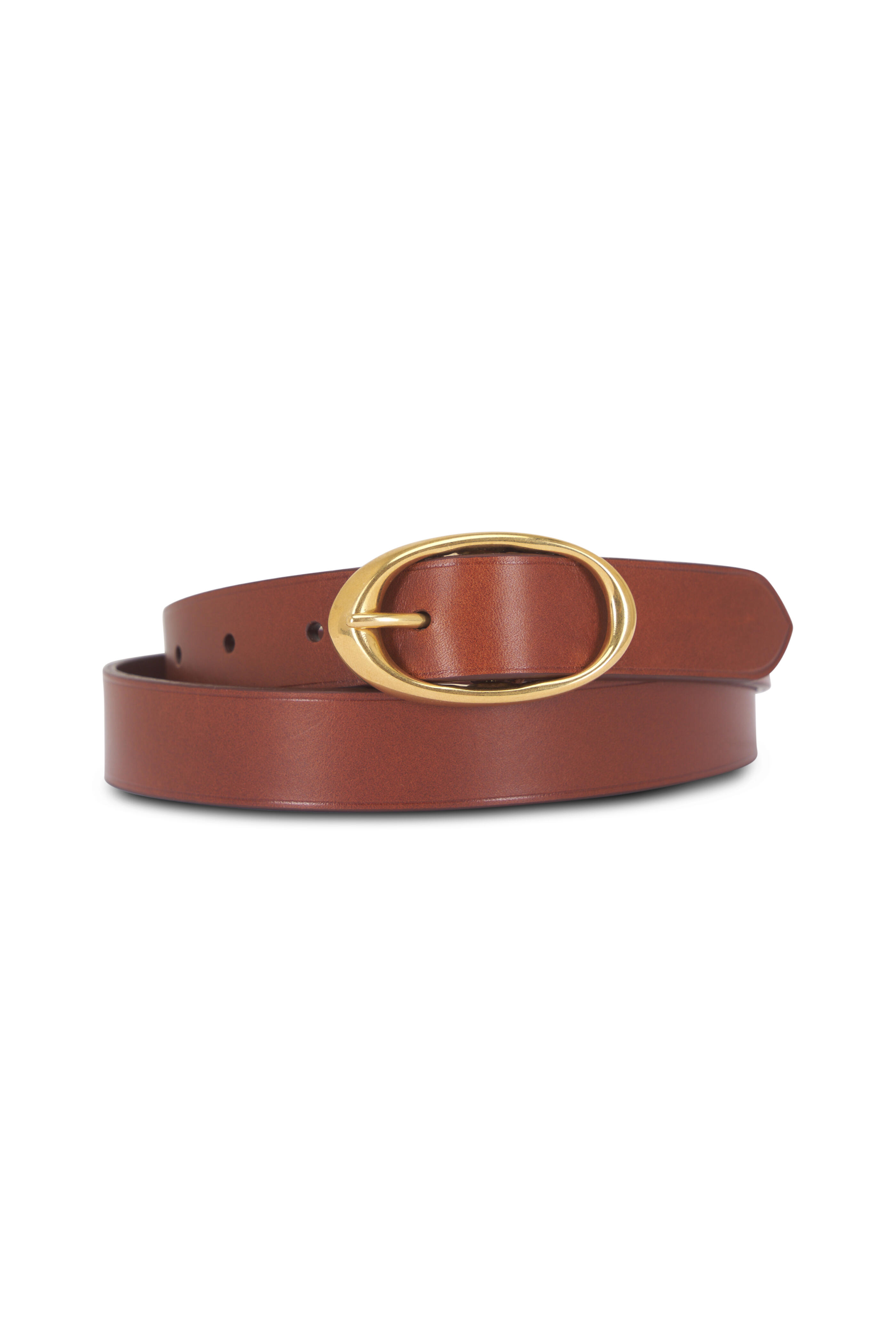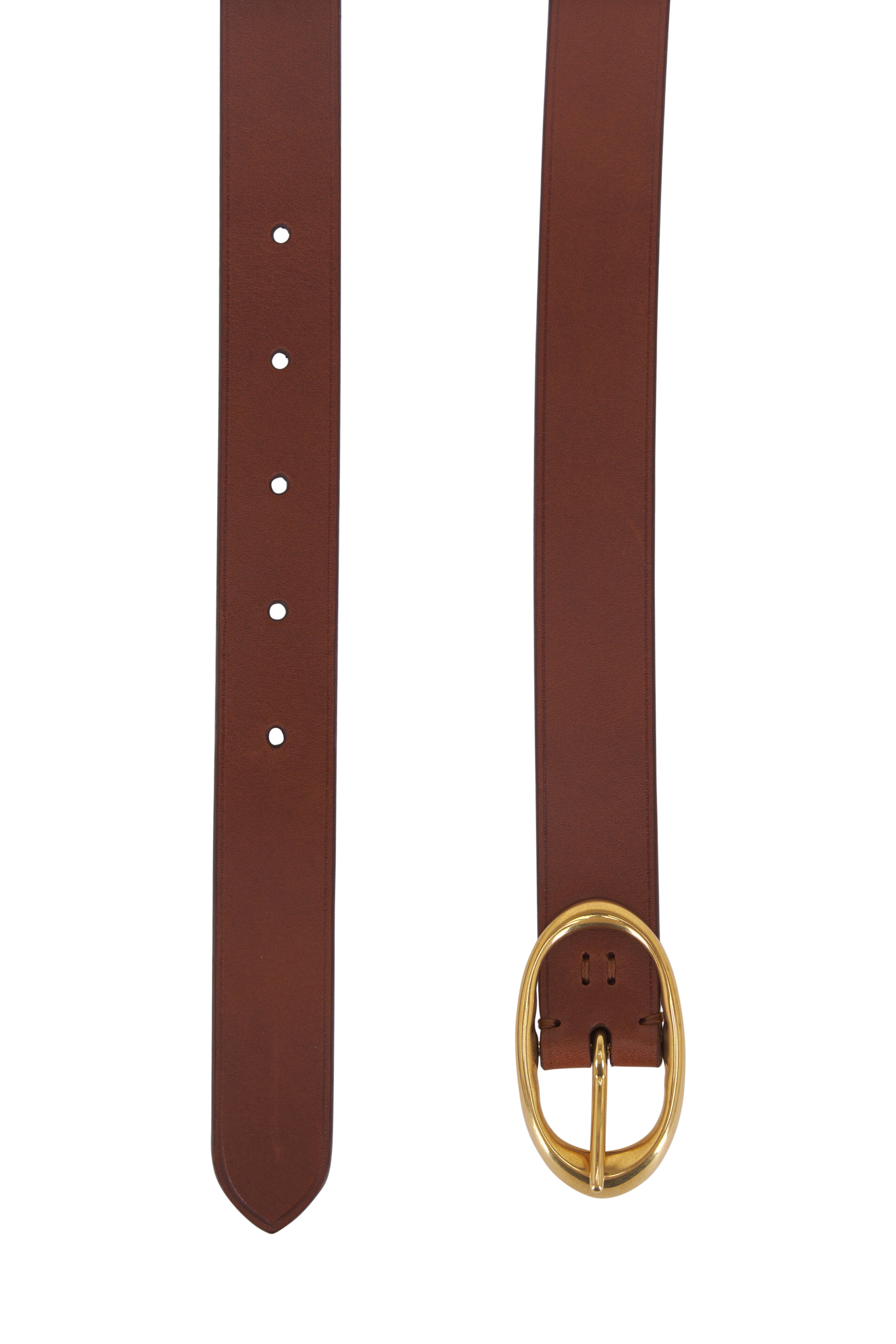 Leather. Gold round buckle. Tapered tip. Made in Italy. Color: Cognac. Width: 1''.