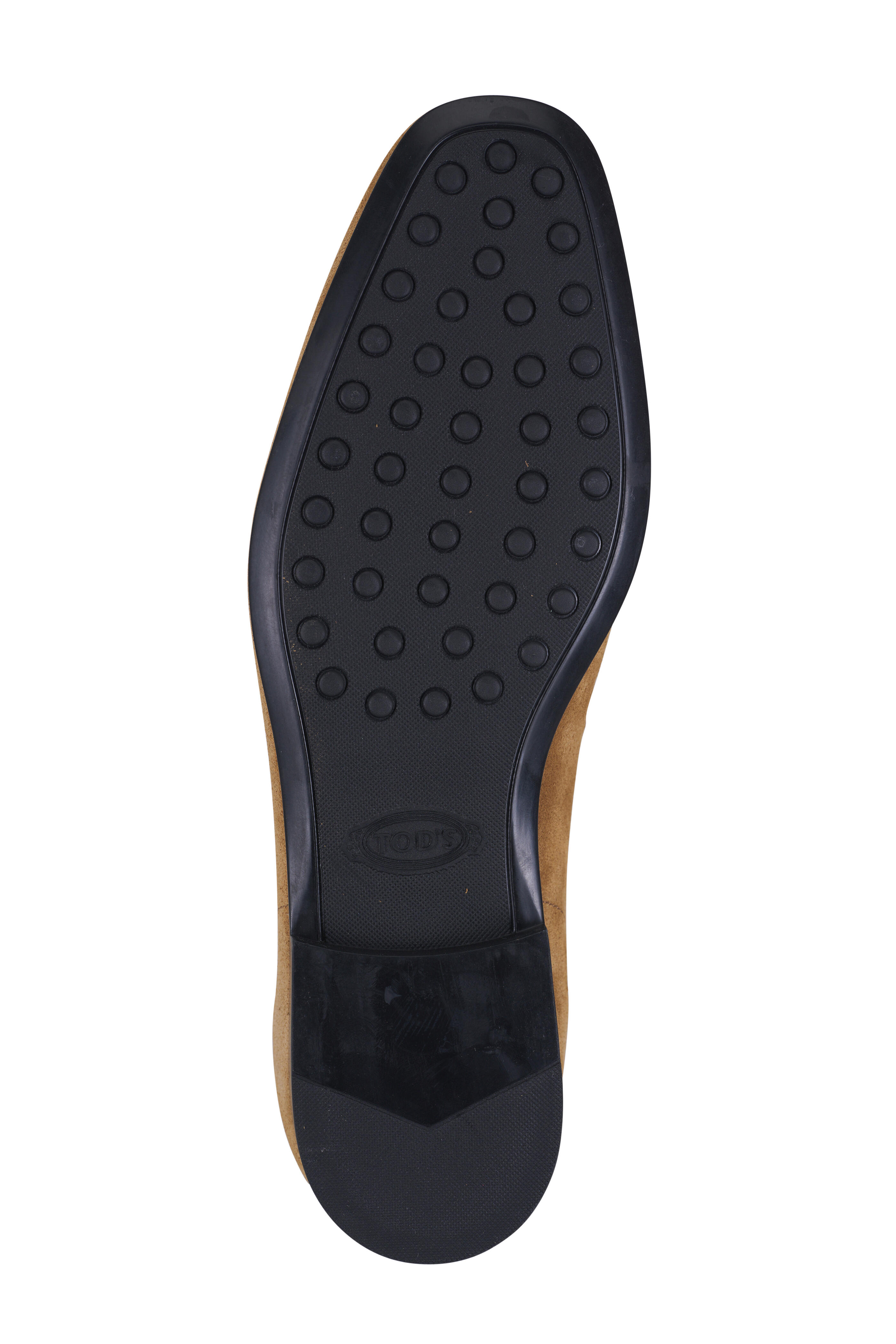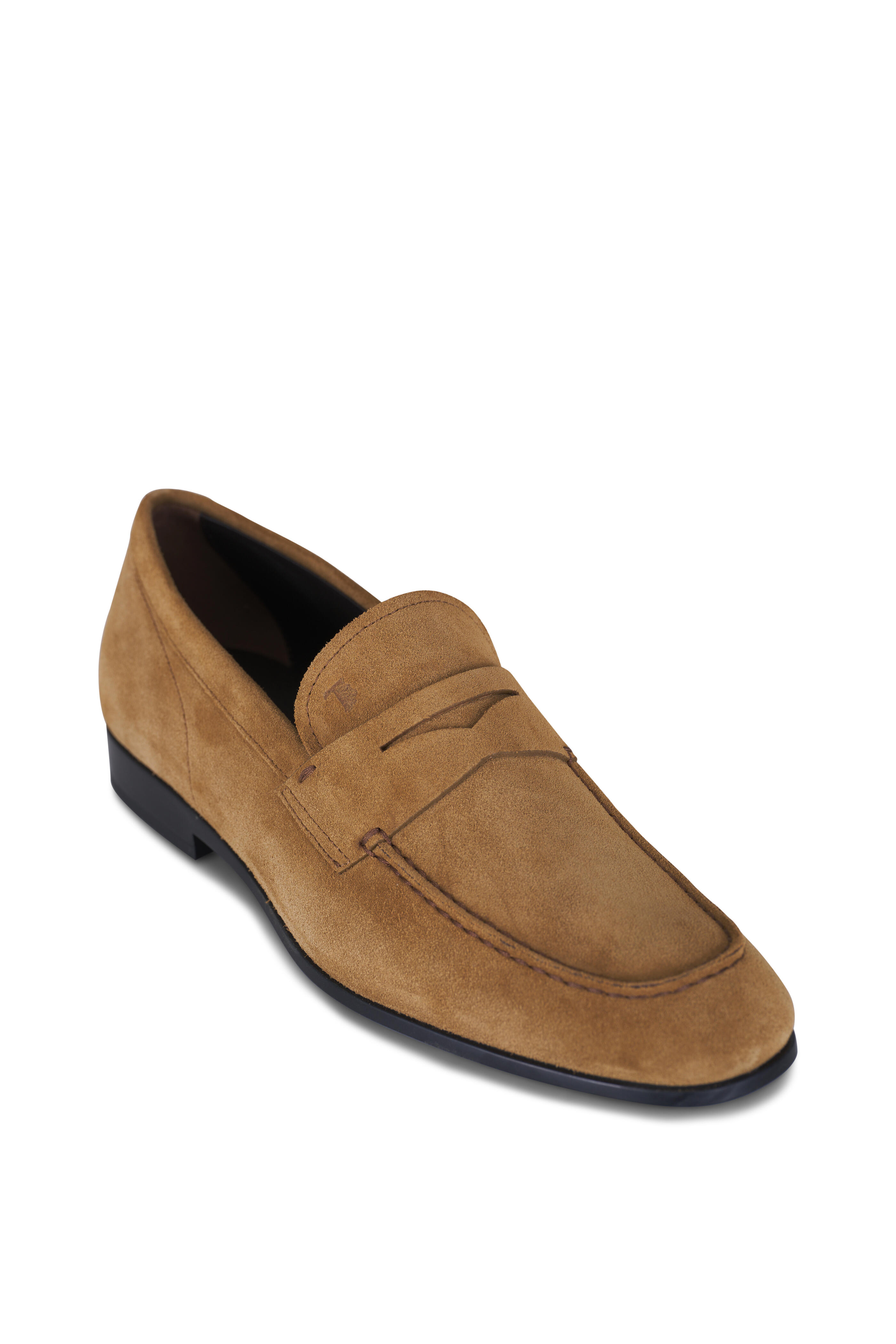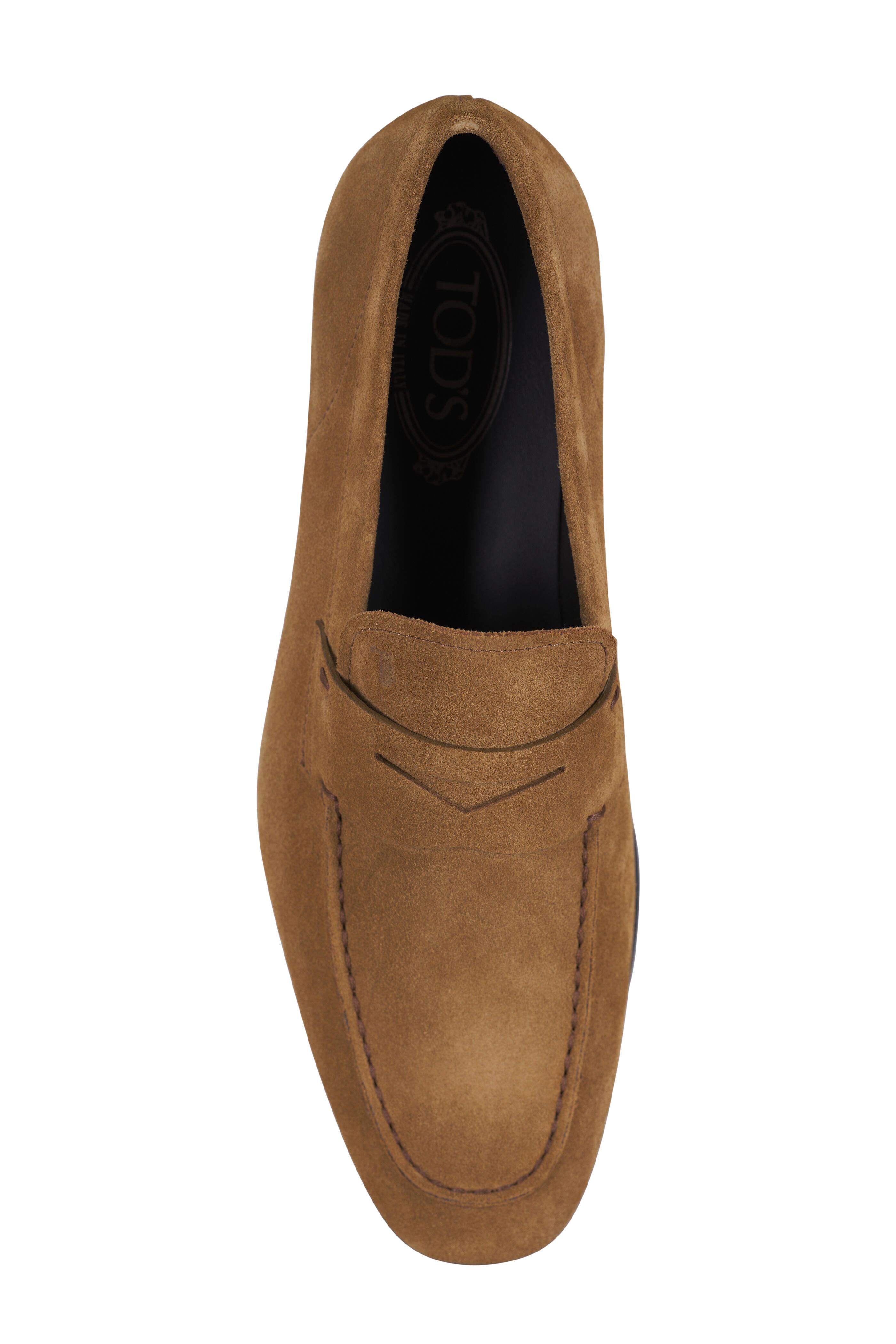 Suede upper. Almond toe. Tod's stamped monogram. Penny strap at vamp. Leather lining and insole. Pebbled rubber sole. Stacked heel. Made in Italy.
