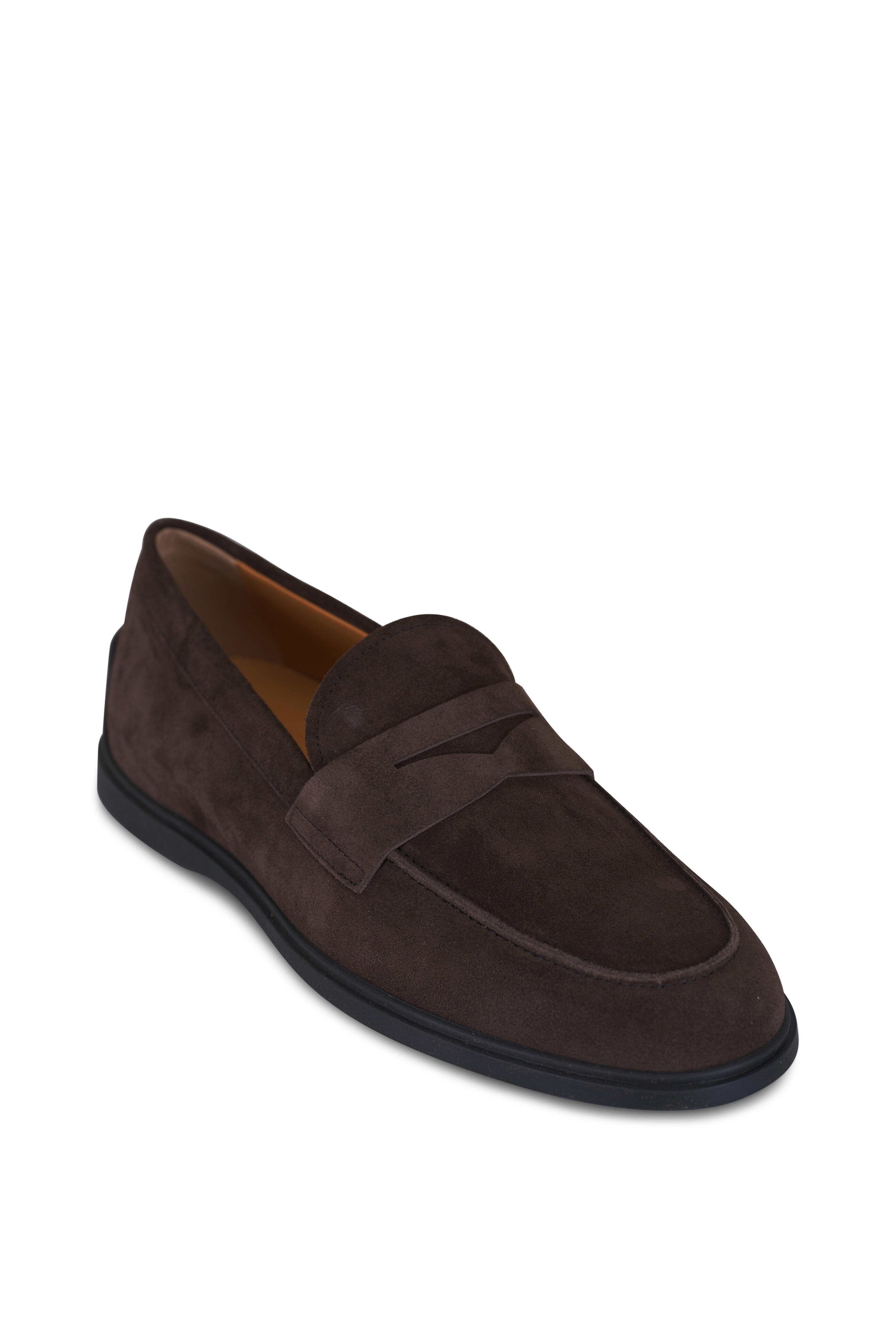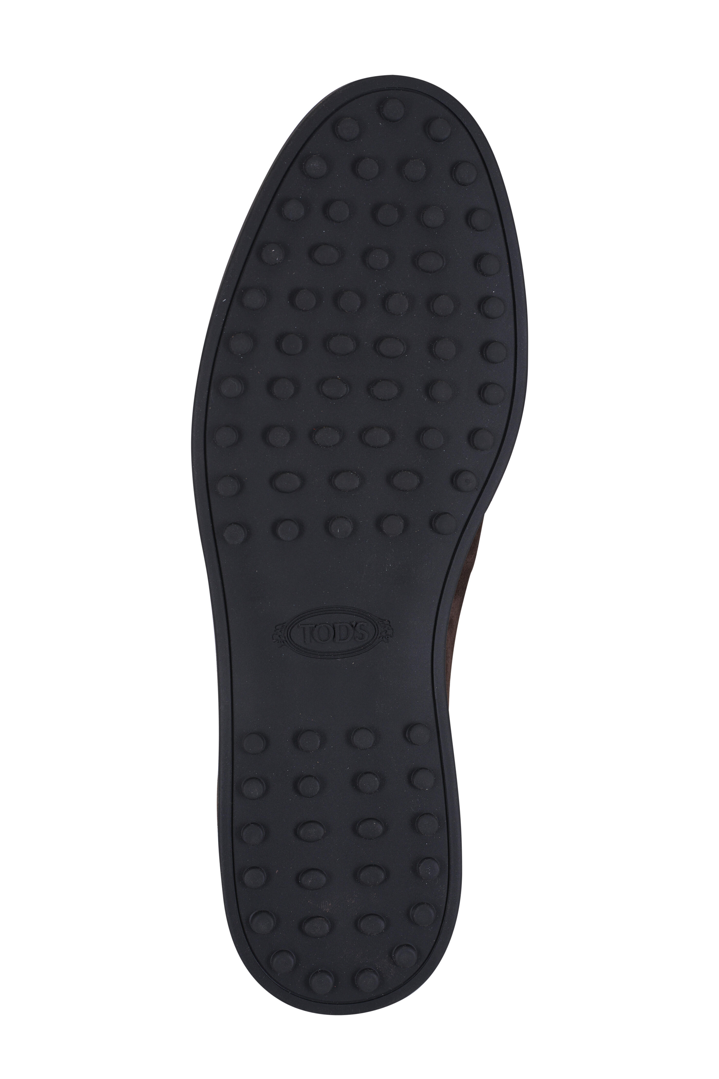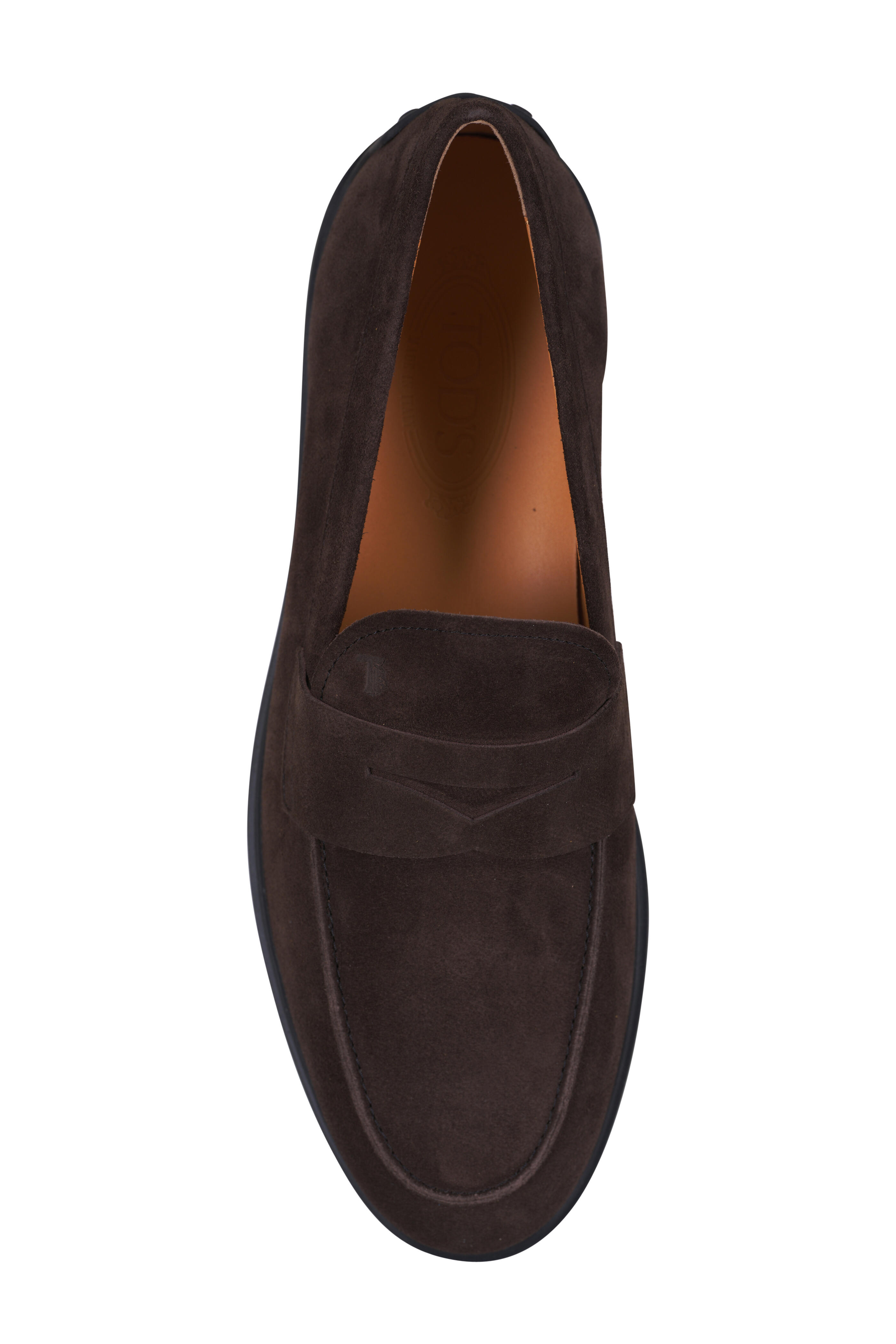Suede upper. Almond toe. Tod's hot-stamped monogram. Penny strap at vamp. Leather lining and insole. Rubber pebble sole. Made in Italy.
