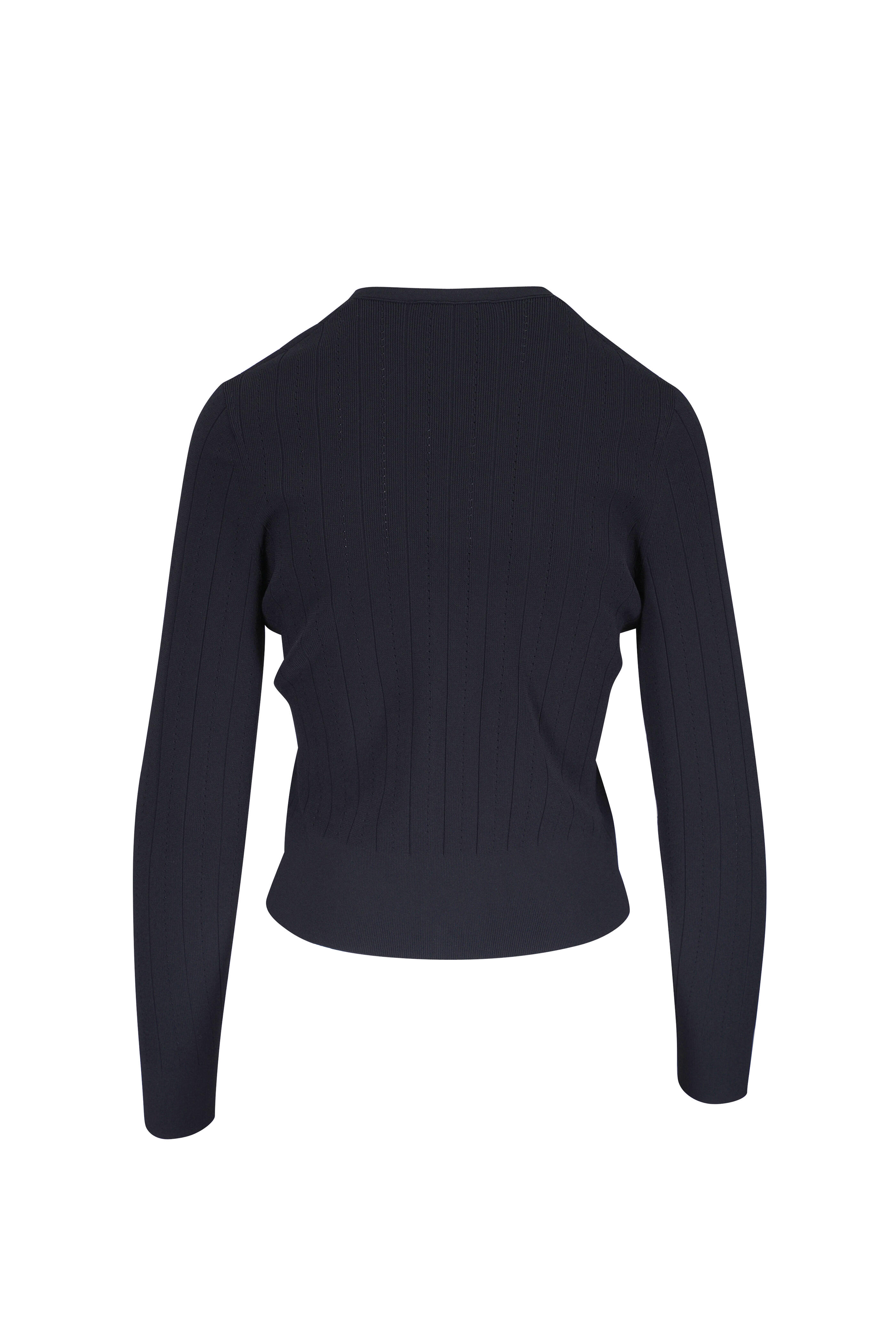 Crew neckline. Front fabric covered button placket. Ribbed trim. Straight hem. Imported. Shoulder to hem 21" (size s). 83% viscose, 17% polyester. Dry clean.