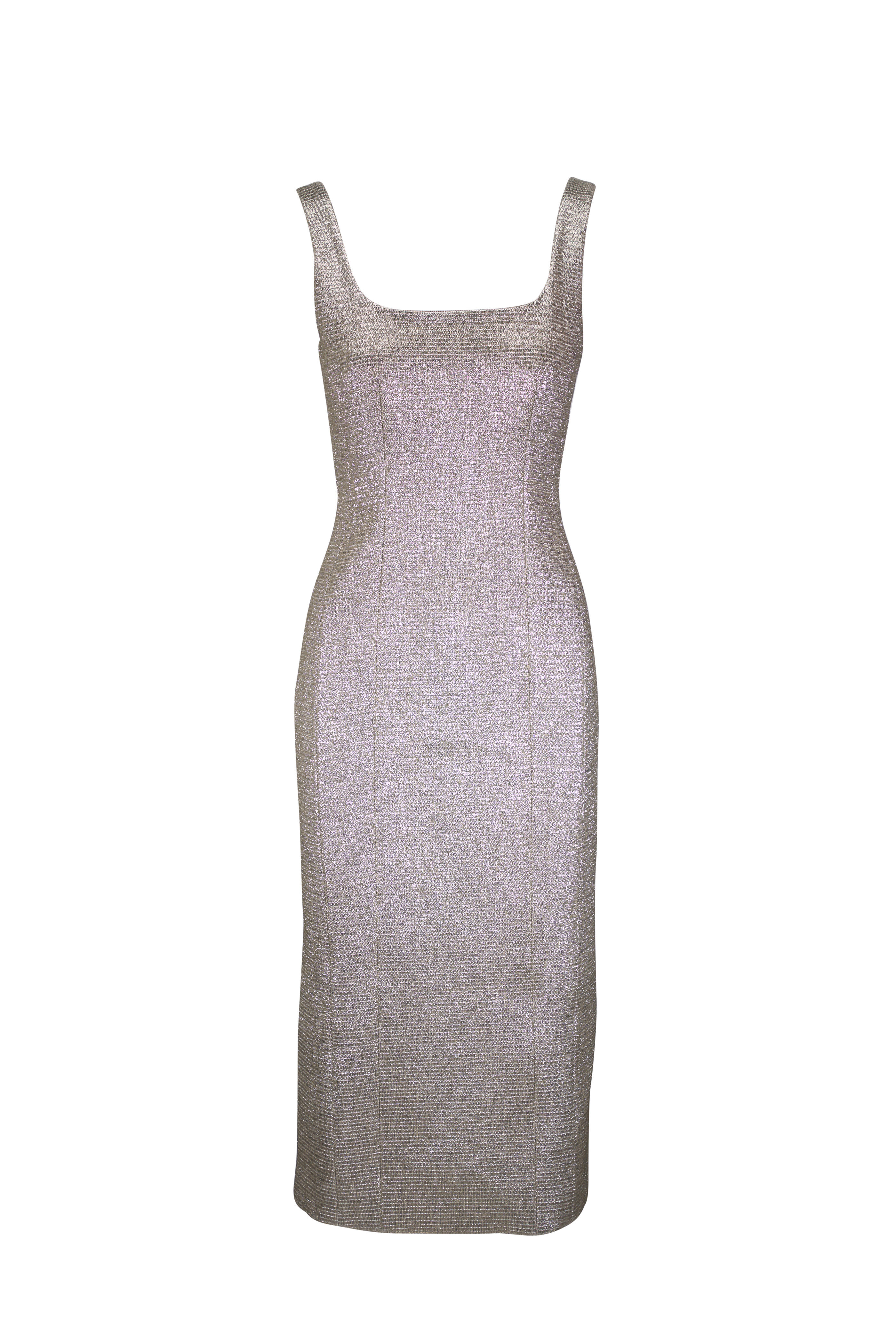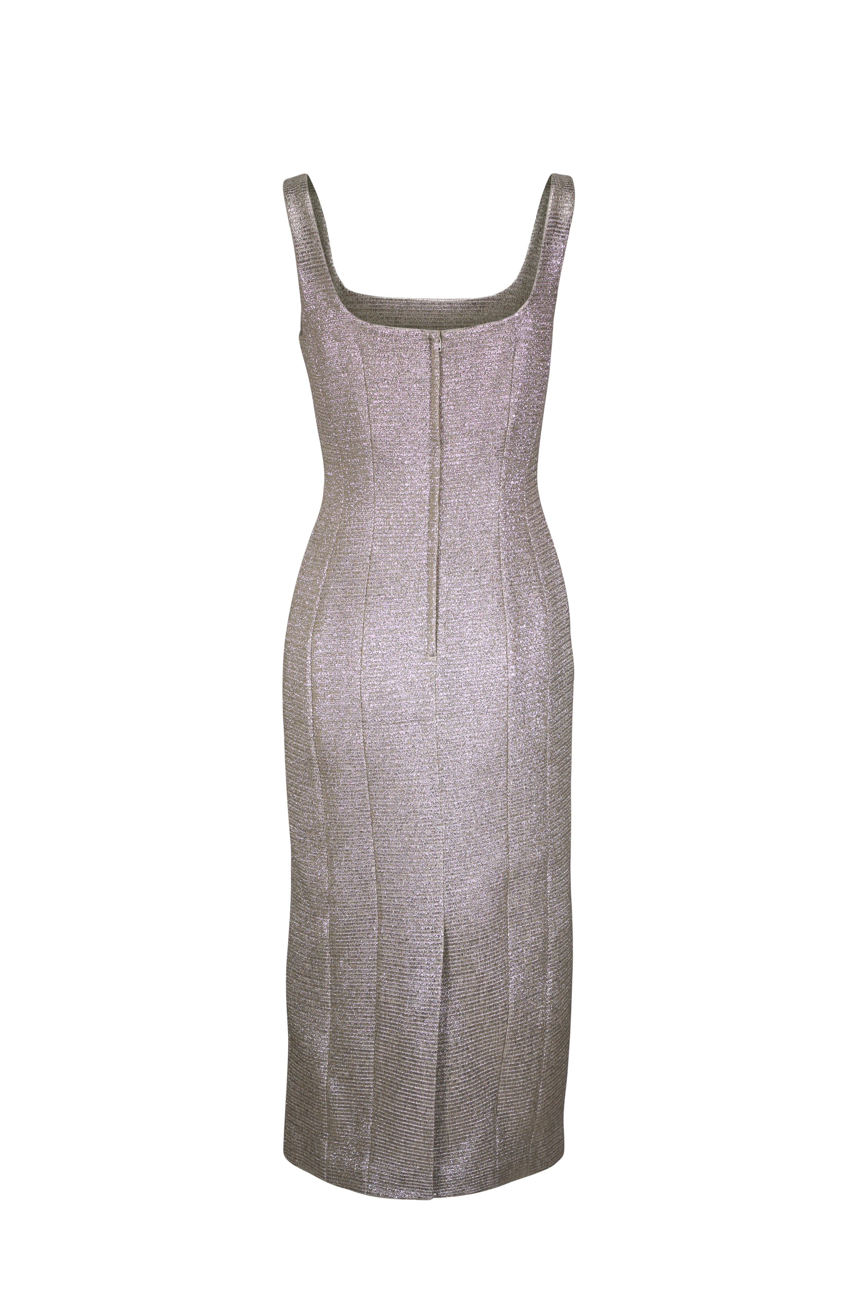 Scoop neckline. Concealed back zip. Back slit. Made in the USA. Approximately 49" shoulder to hem (measurements taken from size 4). 100% polyamide; contrasting fabric: 100% silk; lined. Dry clean.