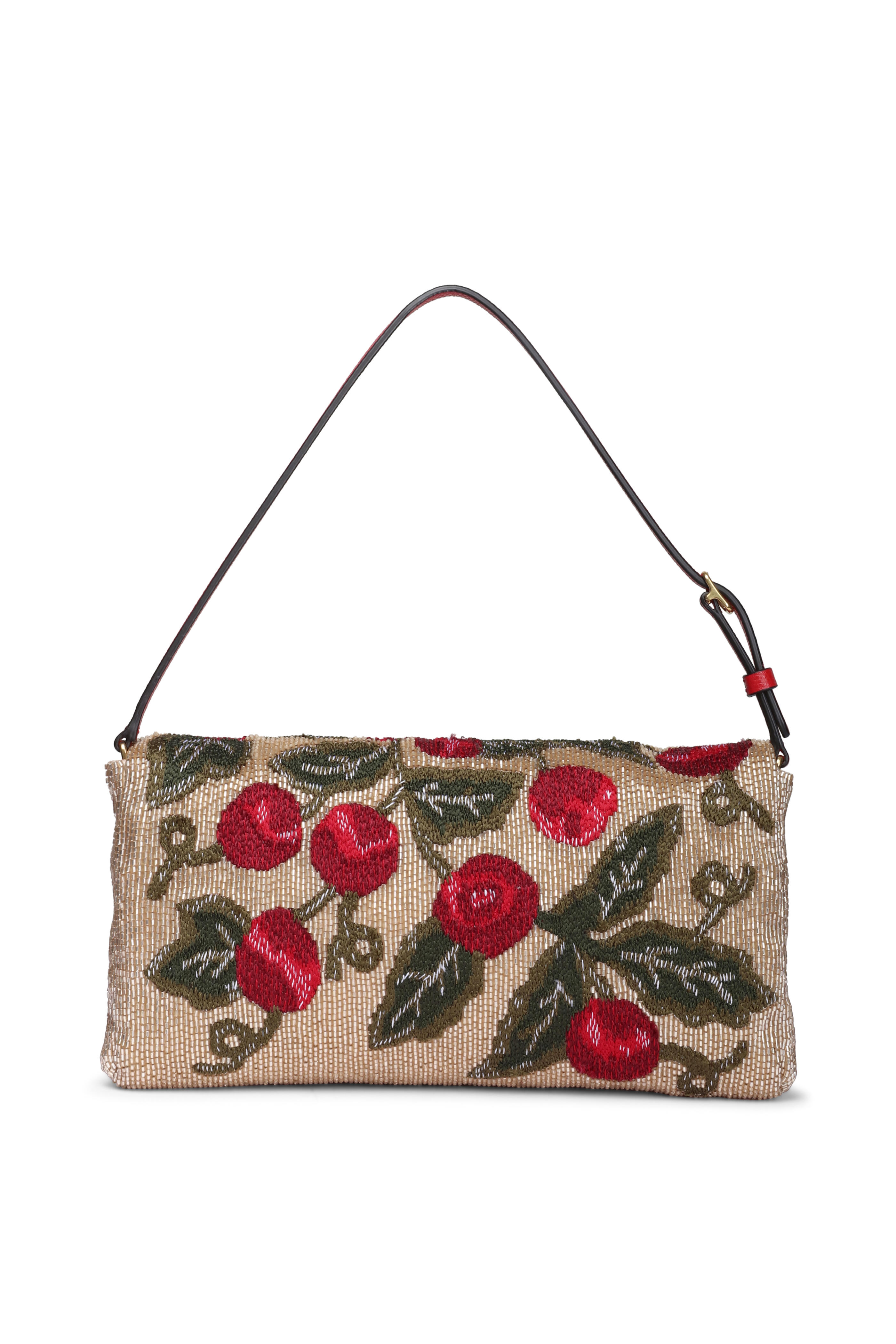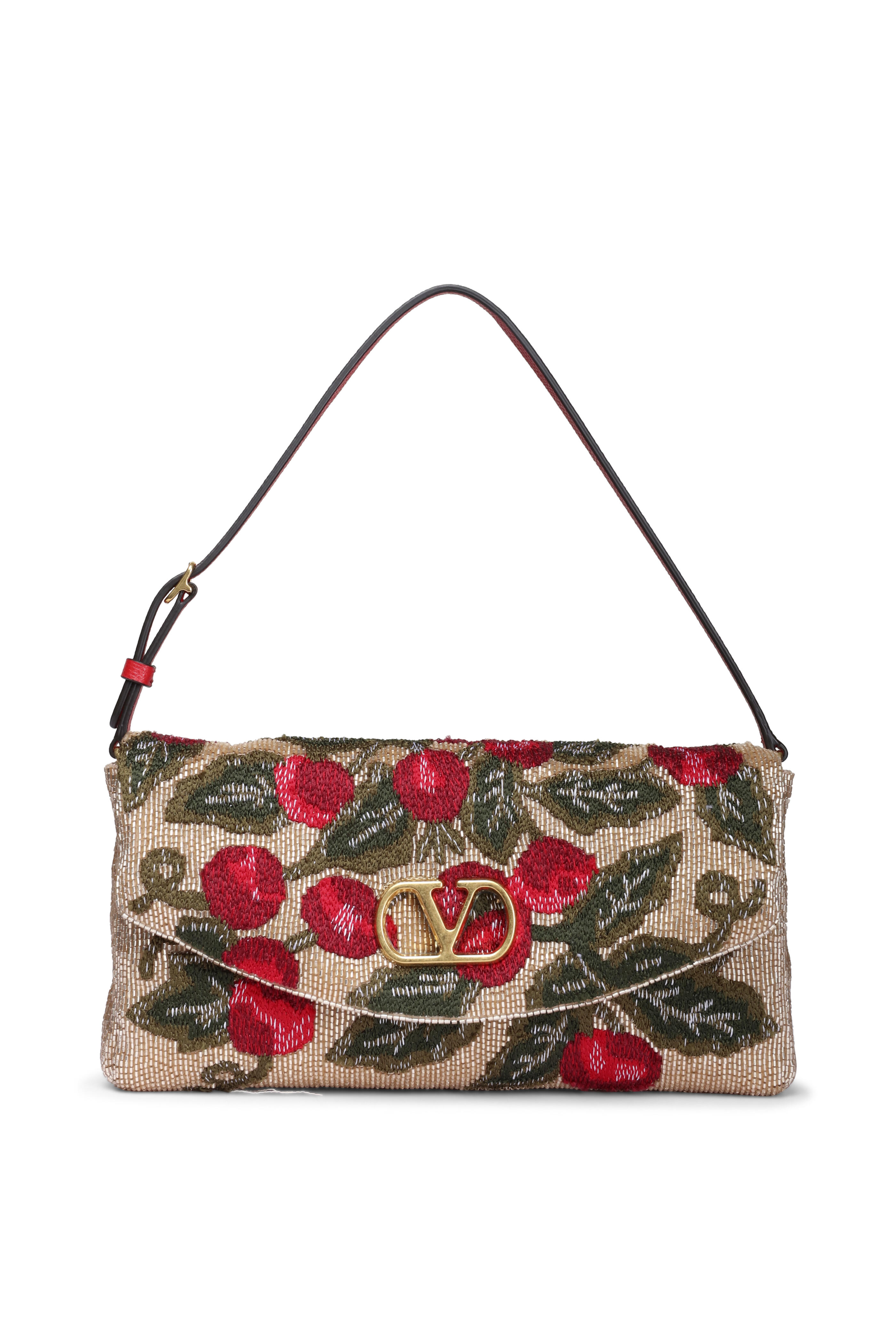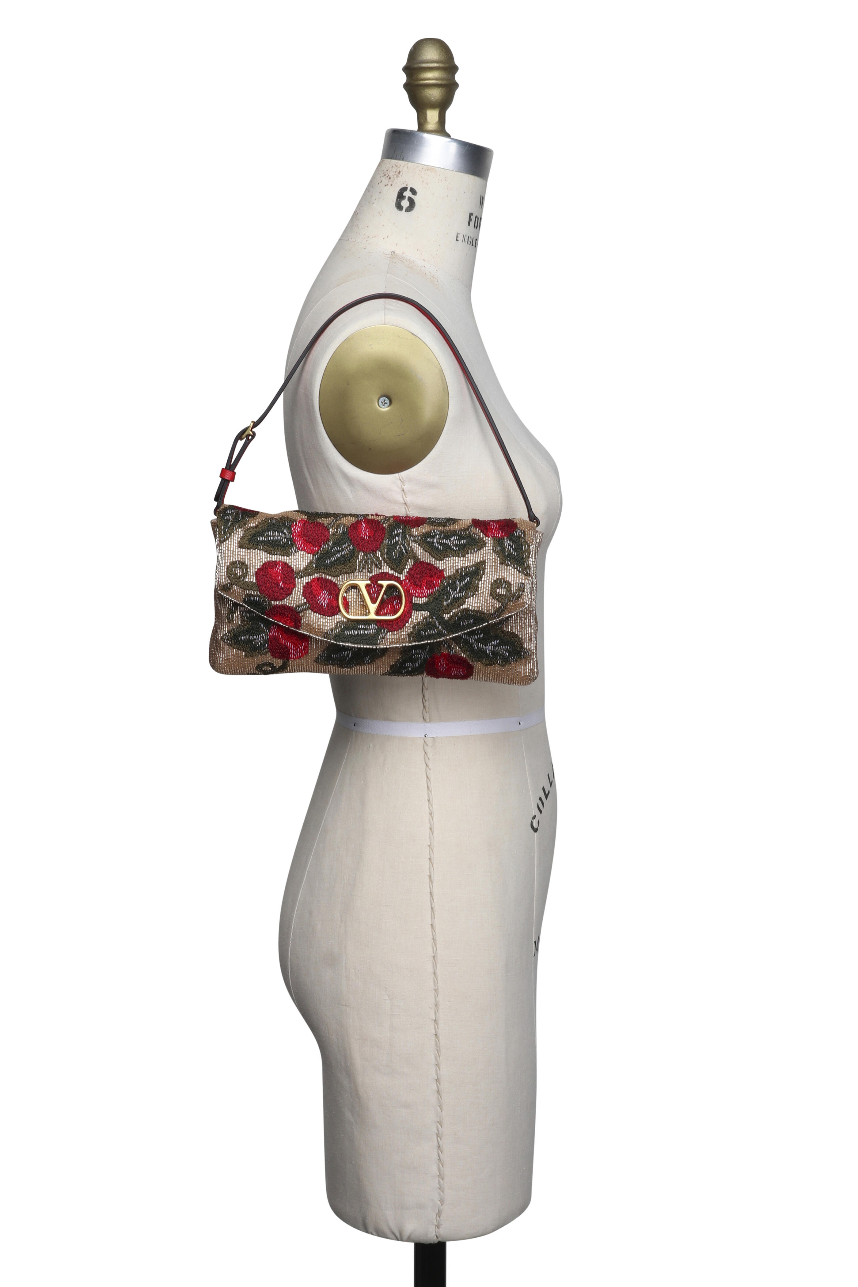 Beaded and fabric outer. Satin lining. Fold over flap. Magnetic closure. Adjustable red leather shoulder strap. Embroidered with Cherryfic cross stitch pattern. Metallic VLogo Signature feature. Antique brass hardware. Interior wall pocket. Made in Italy. Approx.: 4.07” H x 9.3” W x 1.2” D.