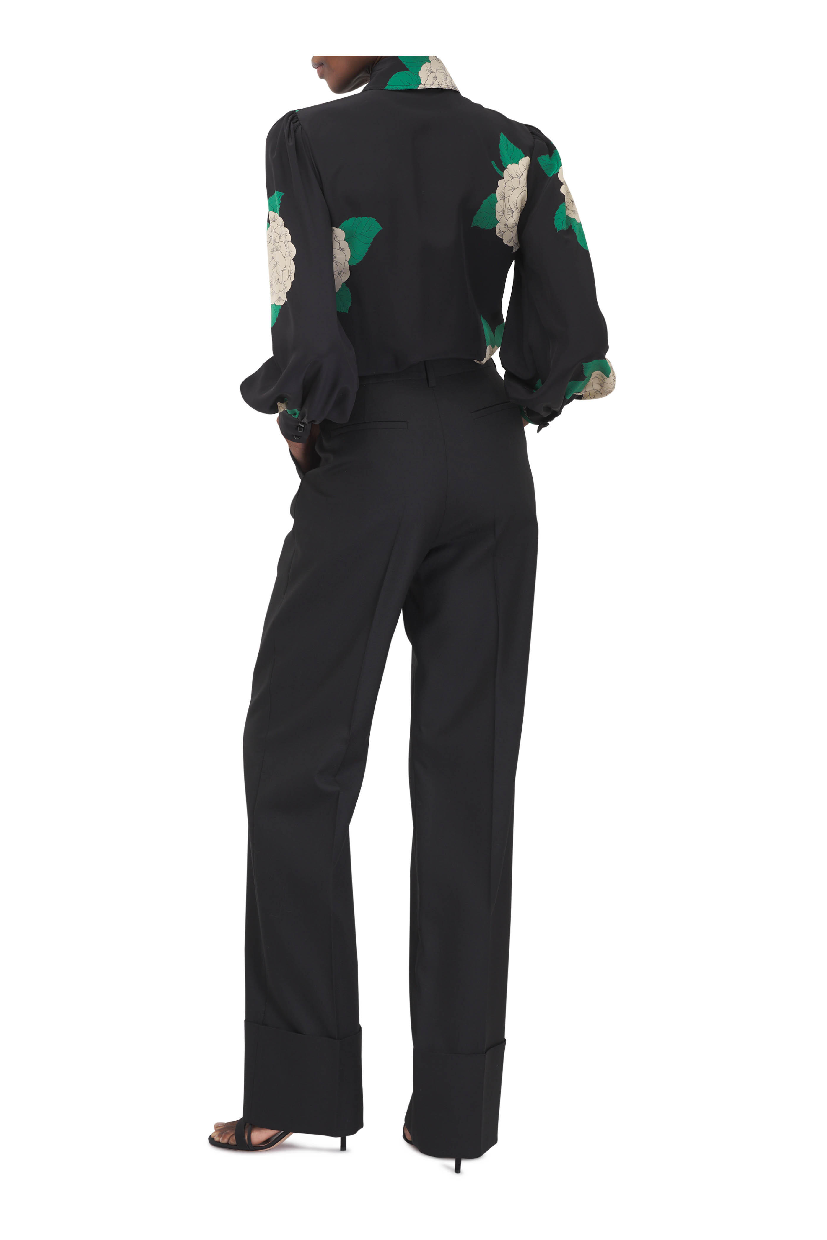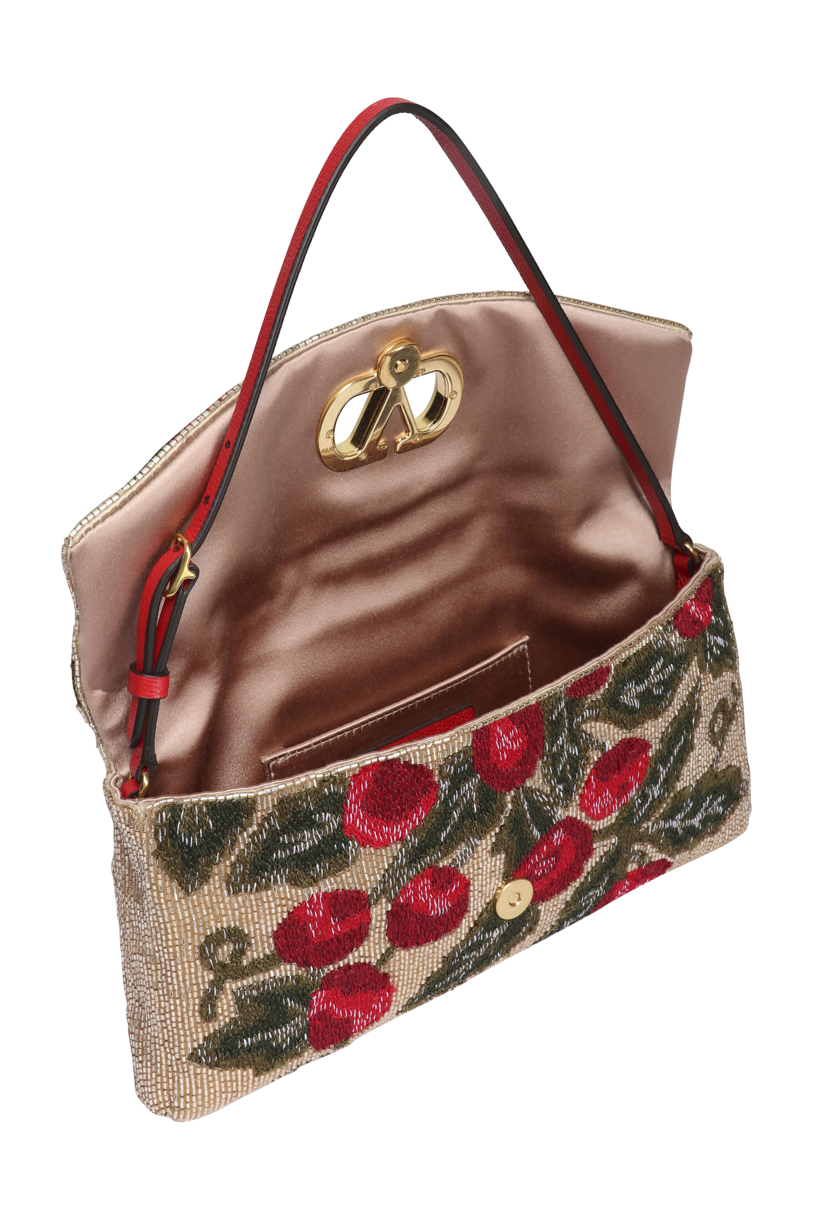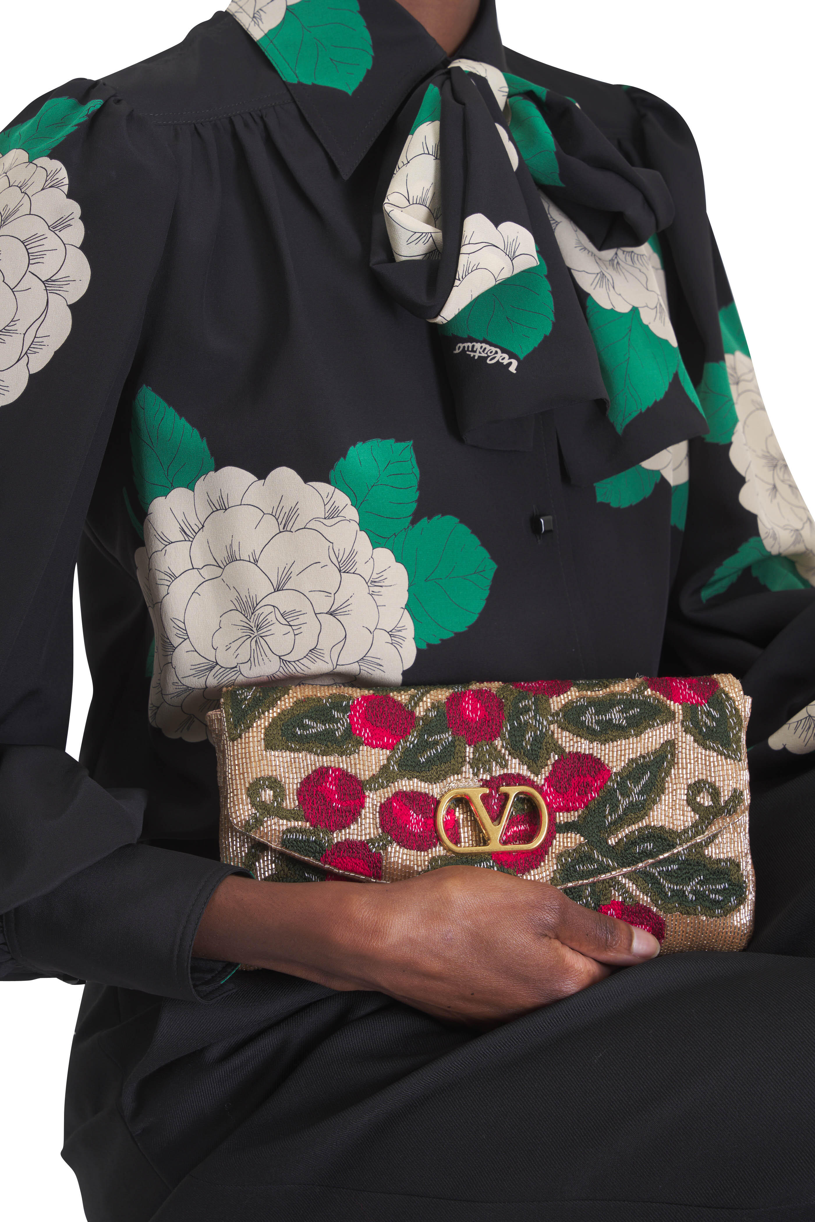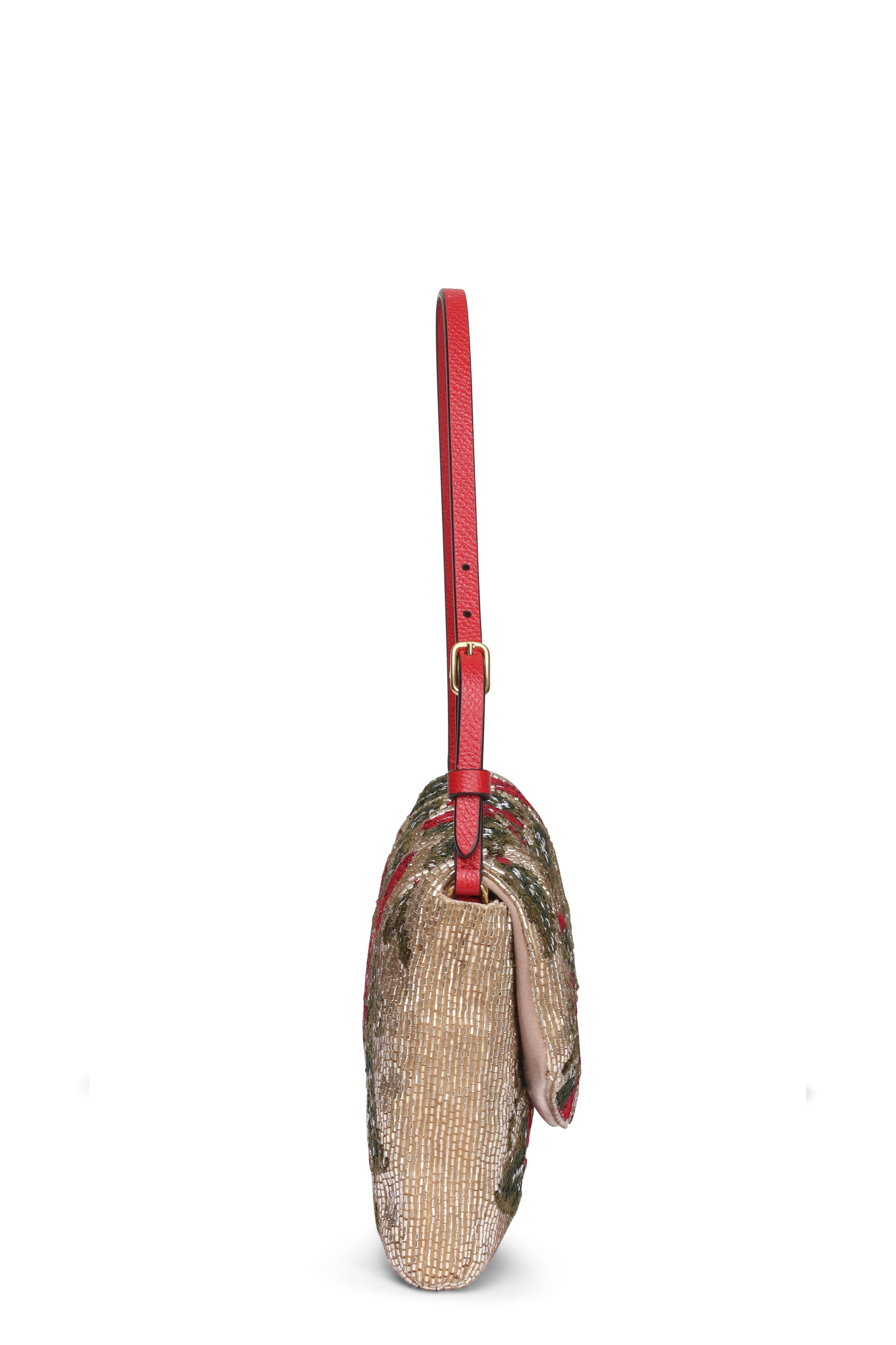 Beaded and fabric outer. Satin lining. Fold over flap. Magnetic closure. Adjustable red leather shoulder strap. Embroidered with Cherryfic cross stitch pattern. Metallic VLogo Signature feature. Antique brass hardware. Interior wall pocket. Made in Italy. Approx.: 4.07” H x 9.3” W x 1.2” D.