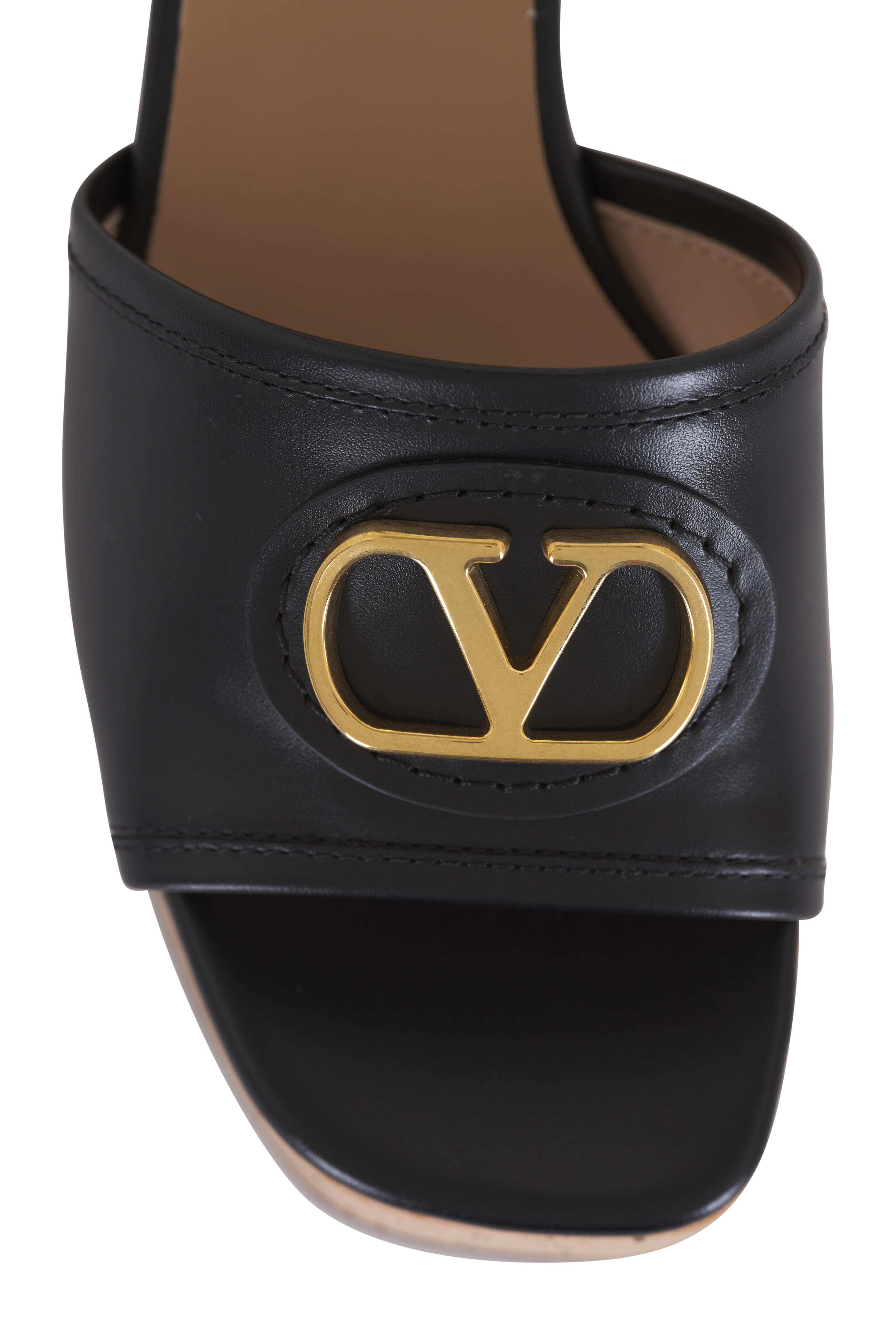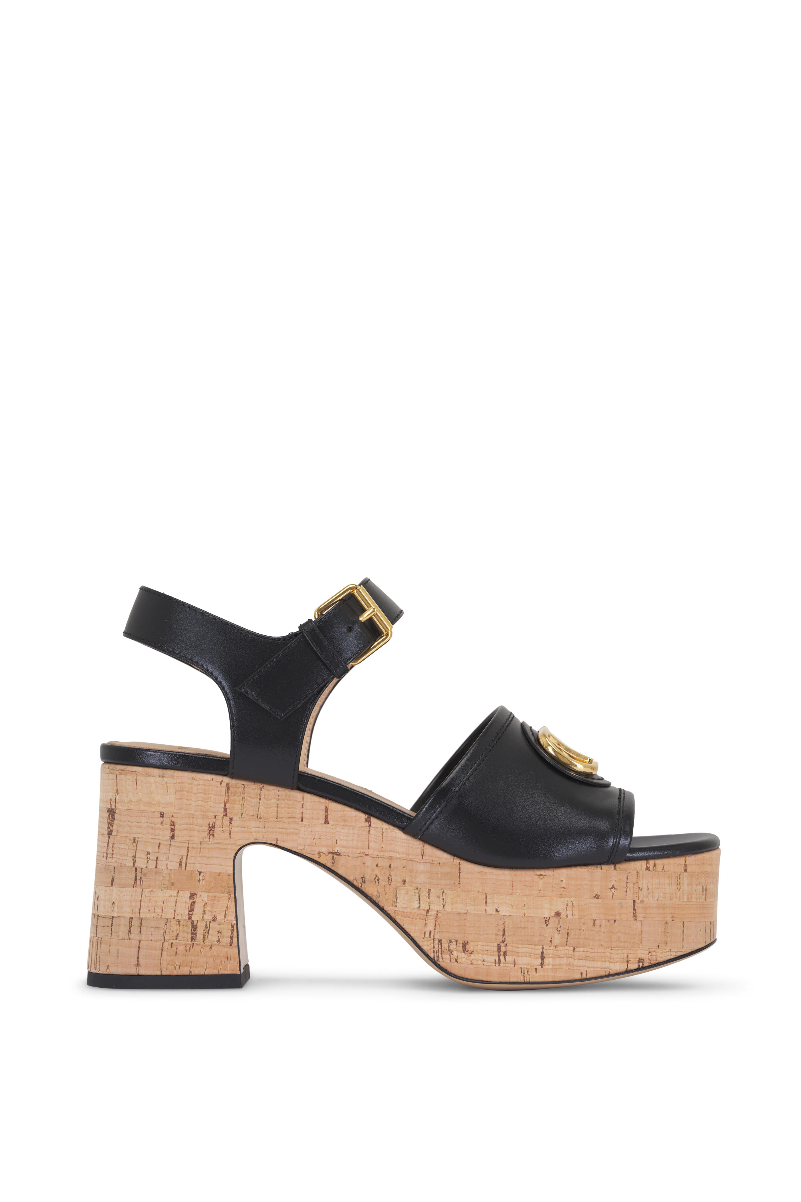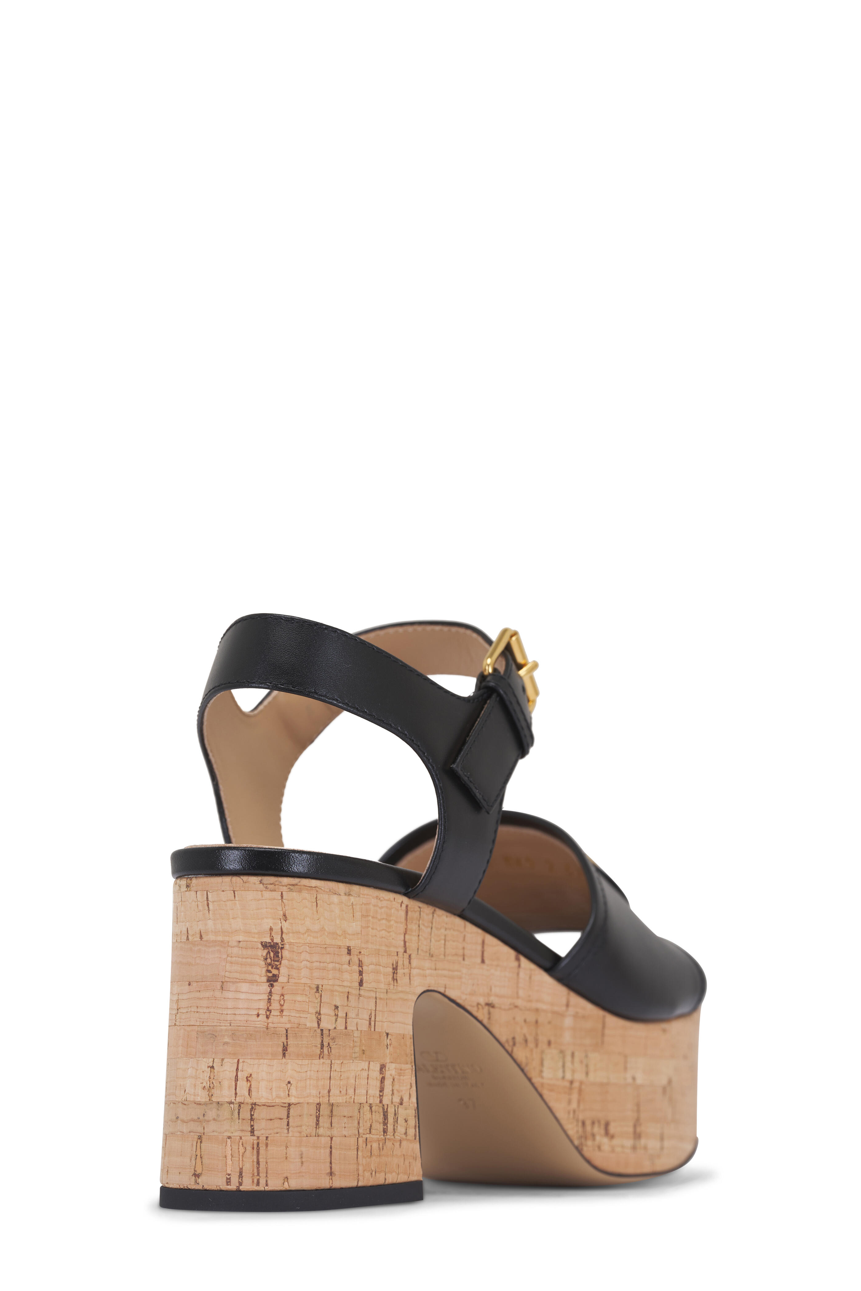 Leather upper. Square, open toe. Adjustable buckle ankle strap. Gold Vlogo on vamp. Leather lining and insole. Cork heel; midsole. Leather sole. Made in Italy. Heel measurement: 80mm.