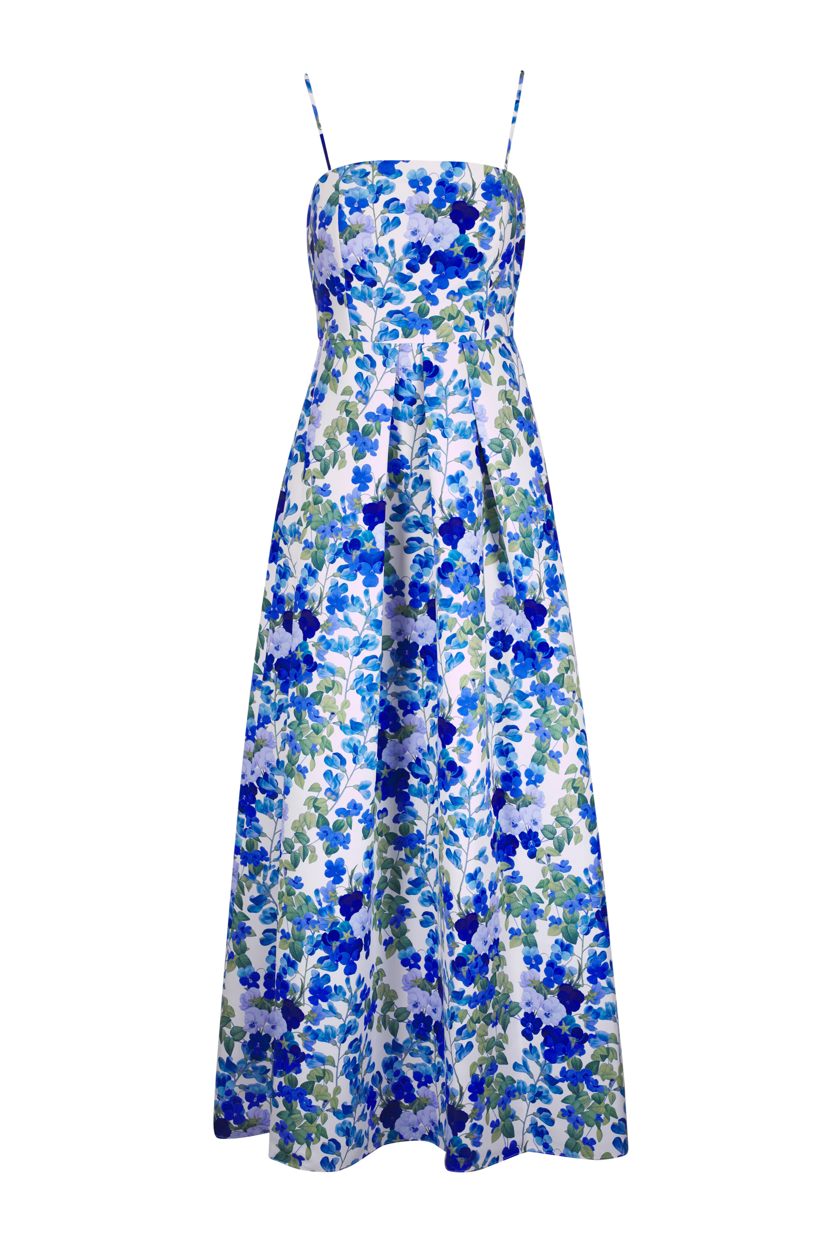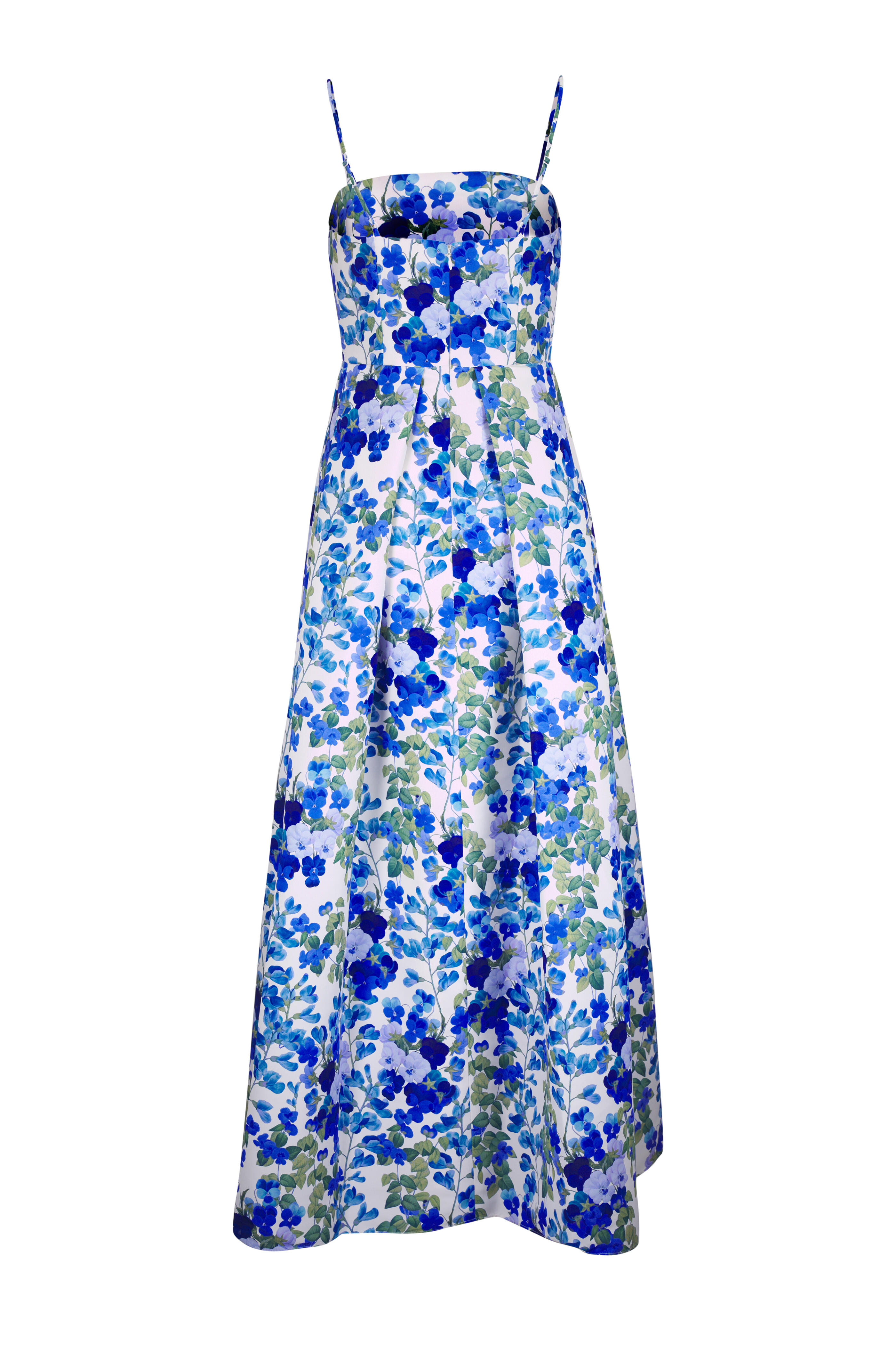 Square neckline. Concealed back zip. Side slip pockets. Imported. Approximately 60" shoulder to hem. 100% polyester. Dry clean.