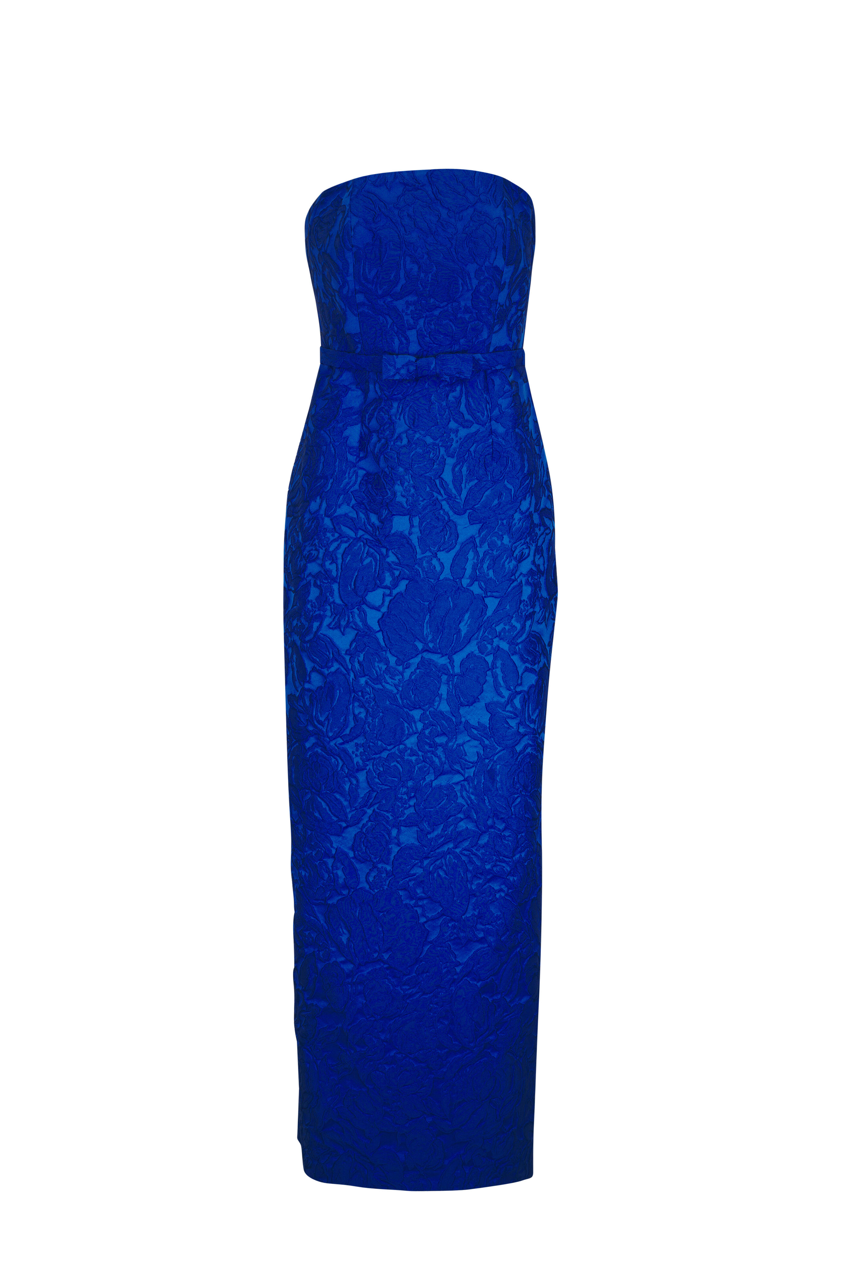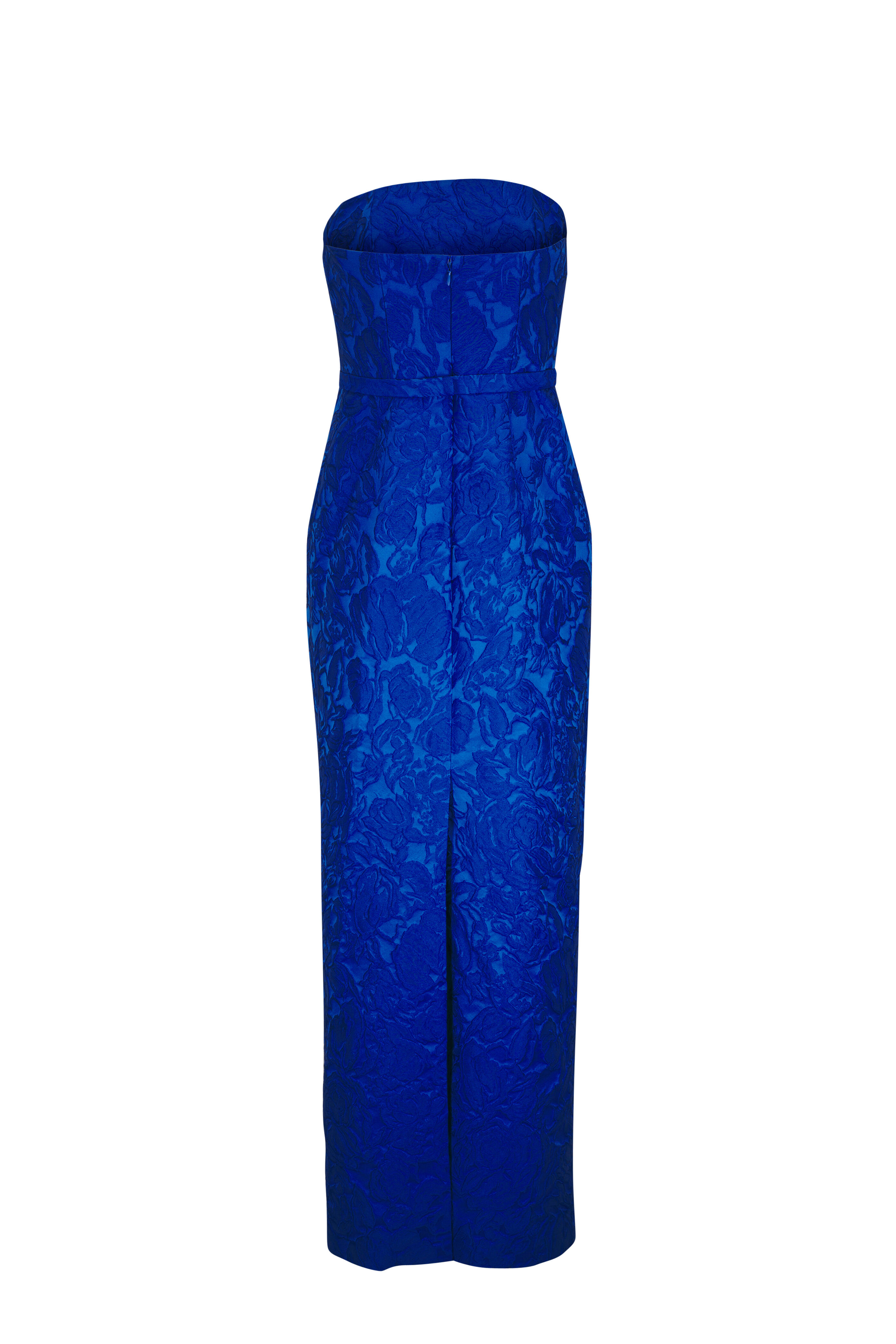 Strapless neckline. Concealed back zip. Attached belt. Back vent. Imported. 60.5" shoulder to hem. 94% polyester, 6% nylon; fully lined. Dry clean.