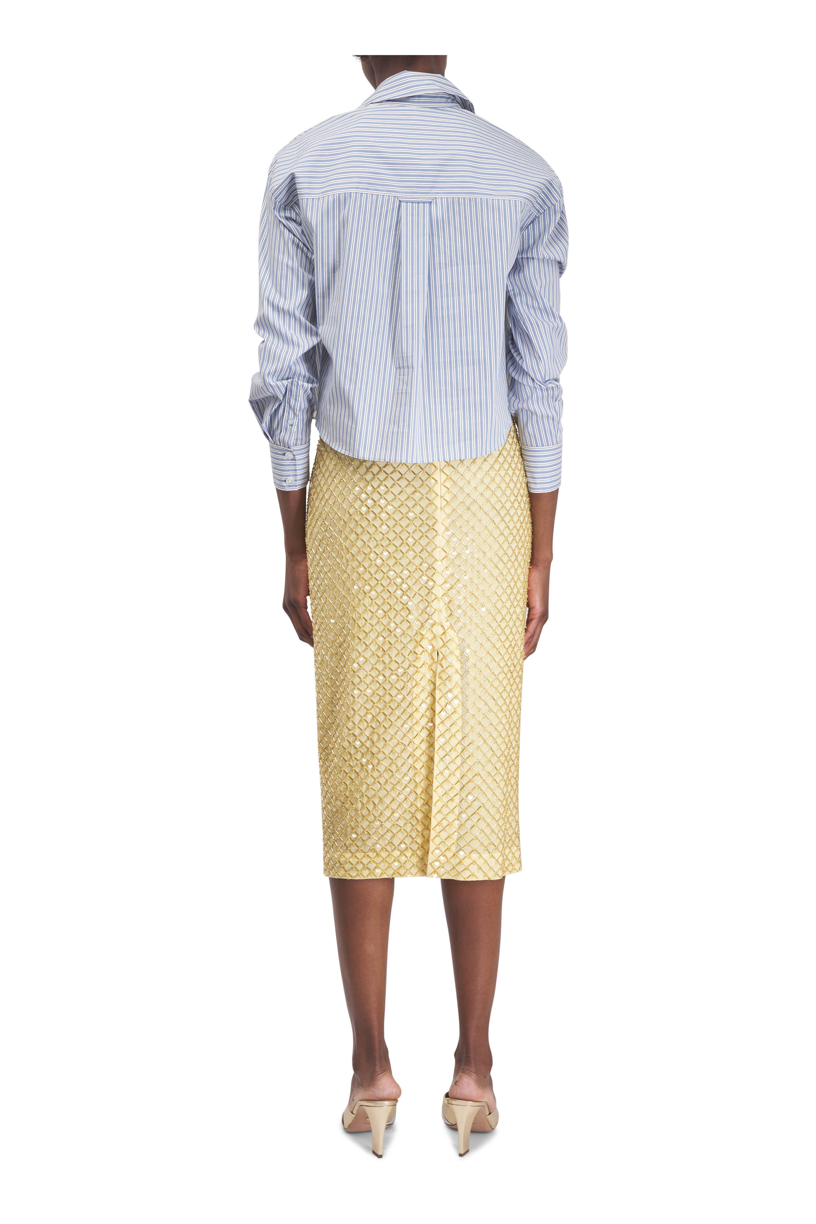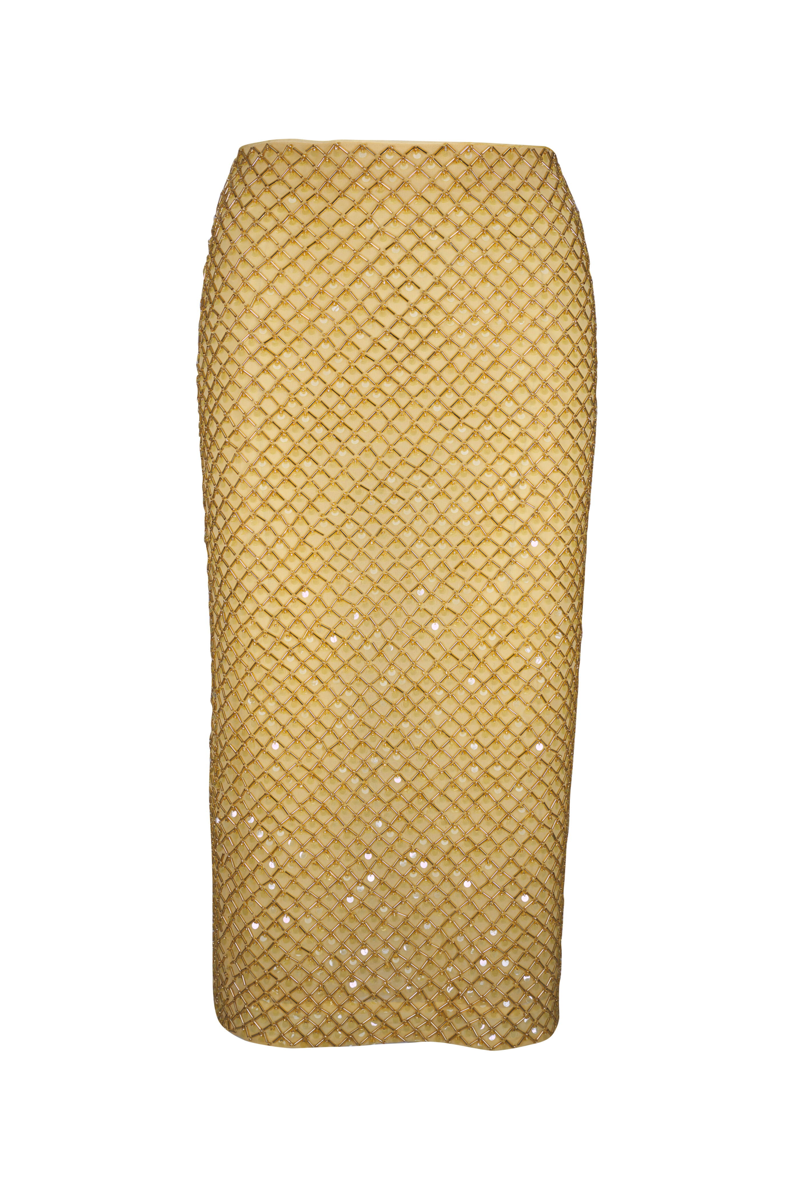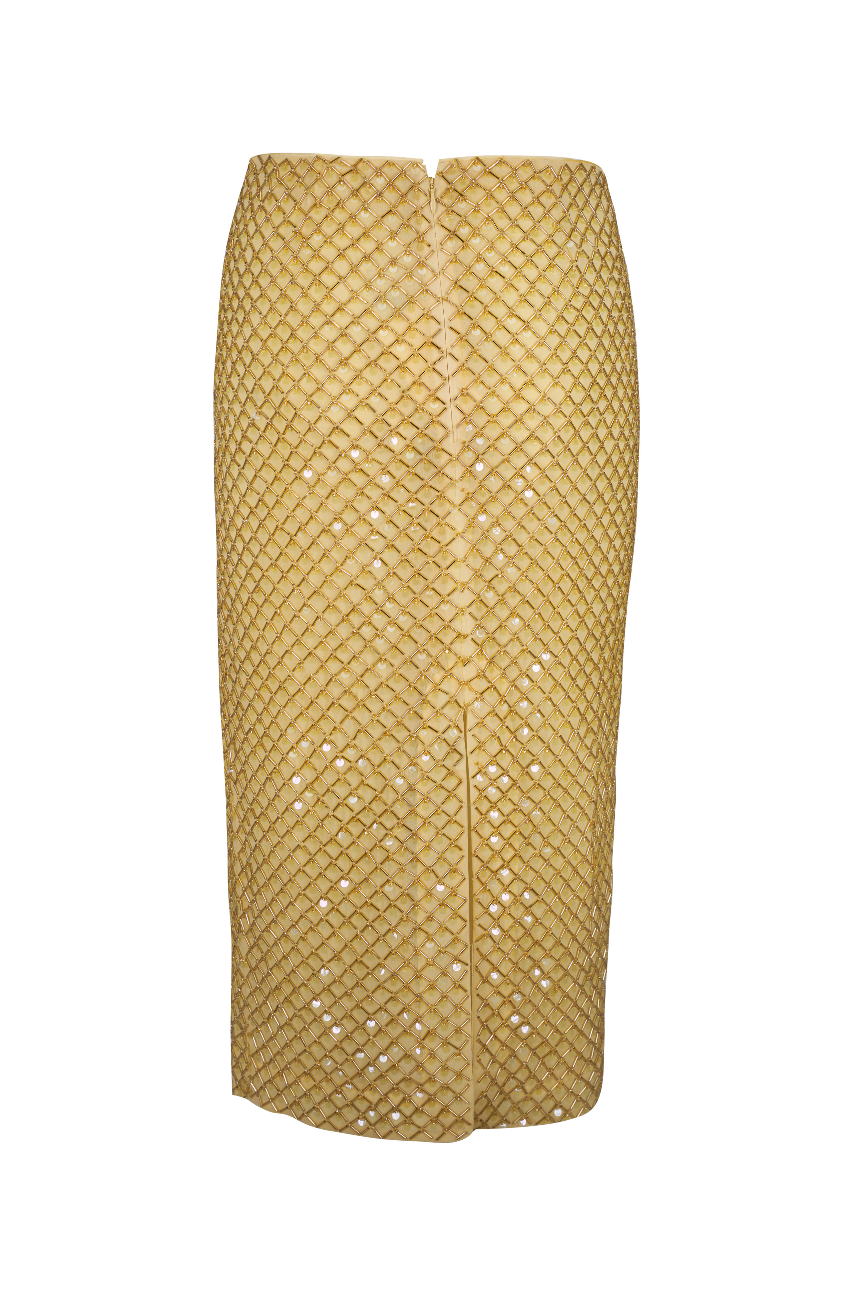 Spot clean. Flat waistband. Concealed back zip closure. Pencil silhouette. Allover beaded detail. Back hem slit. Imported. Waist to hem 31" (size 2). 100% polyester; lined.