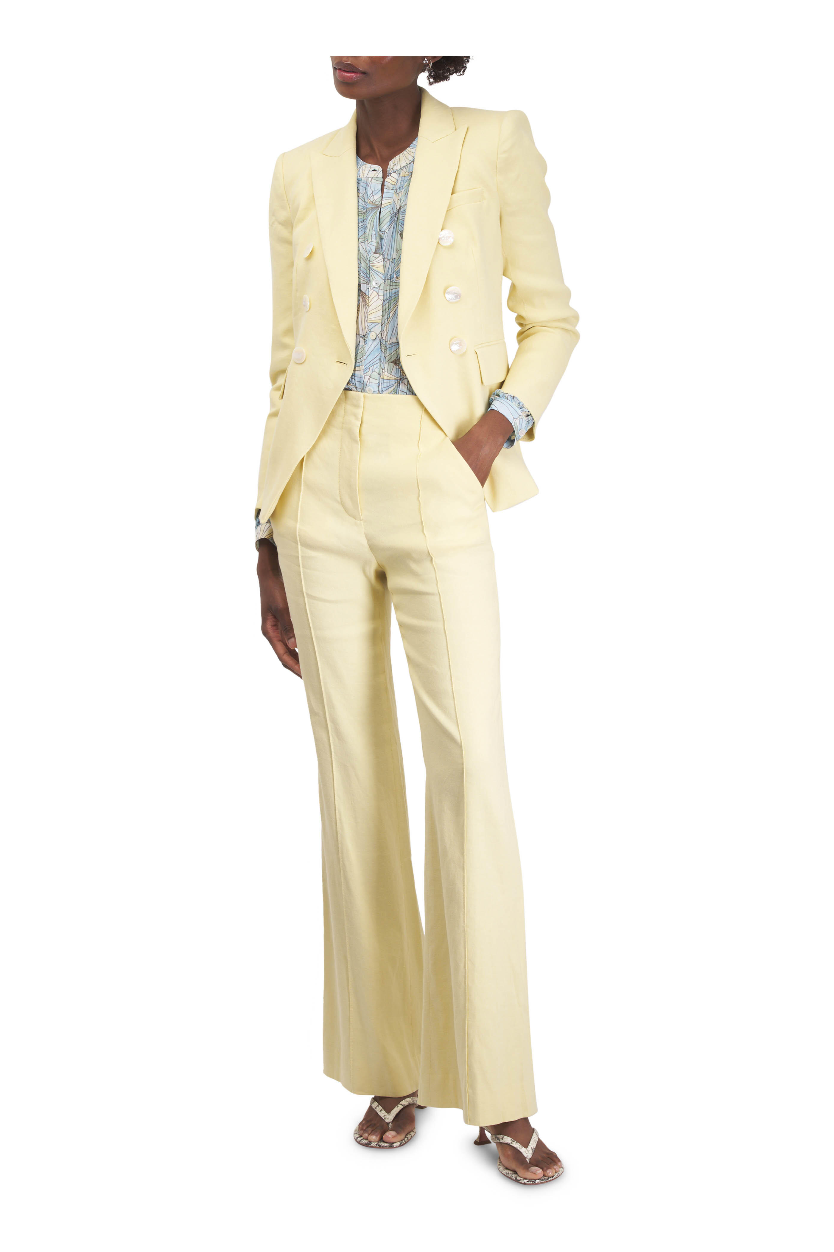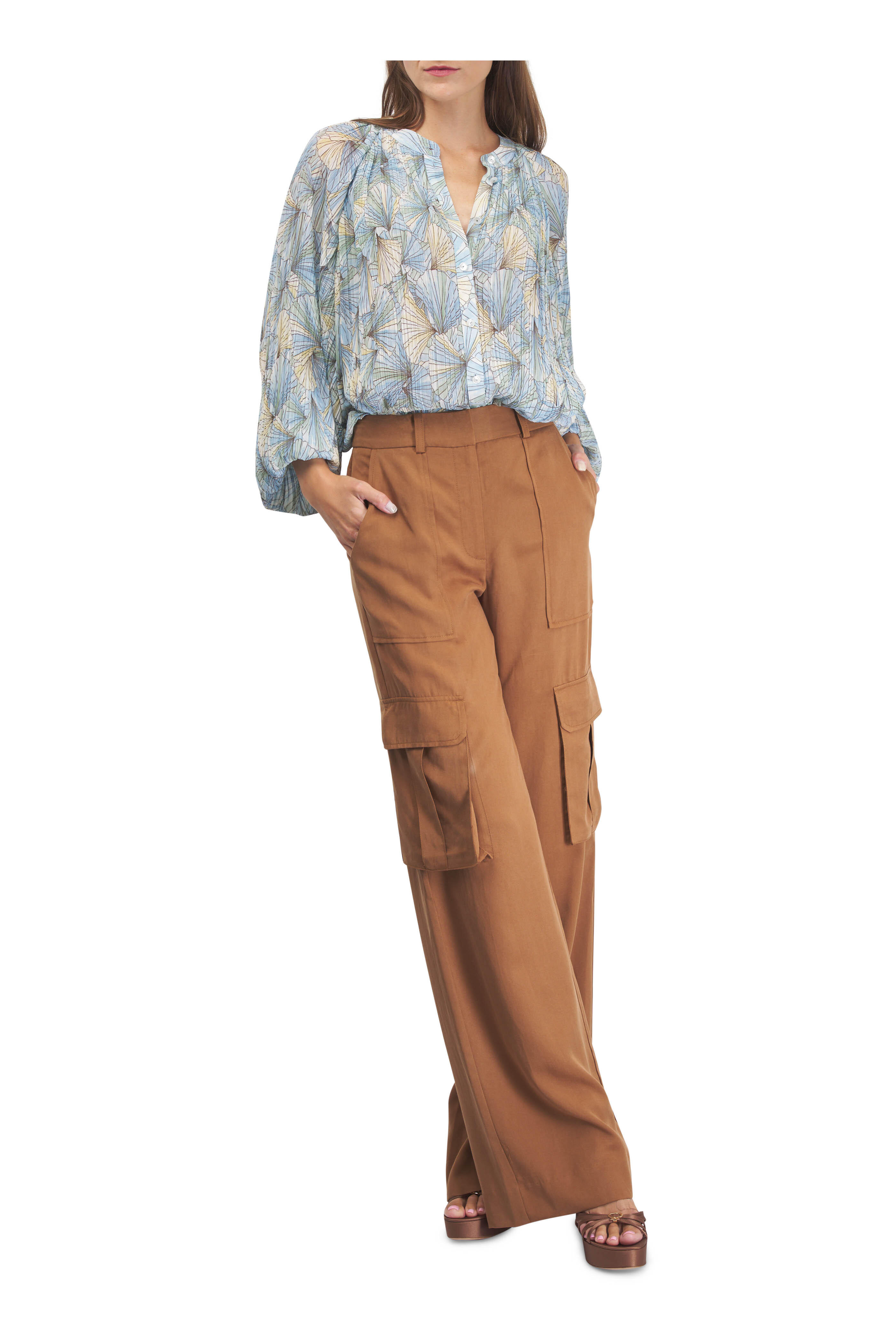 Mandarin collar. Split v-neckline. Front button placket. Bishop sleeves. Imported. 100% polyester. Dry clean.