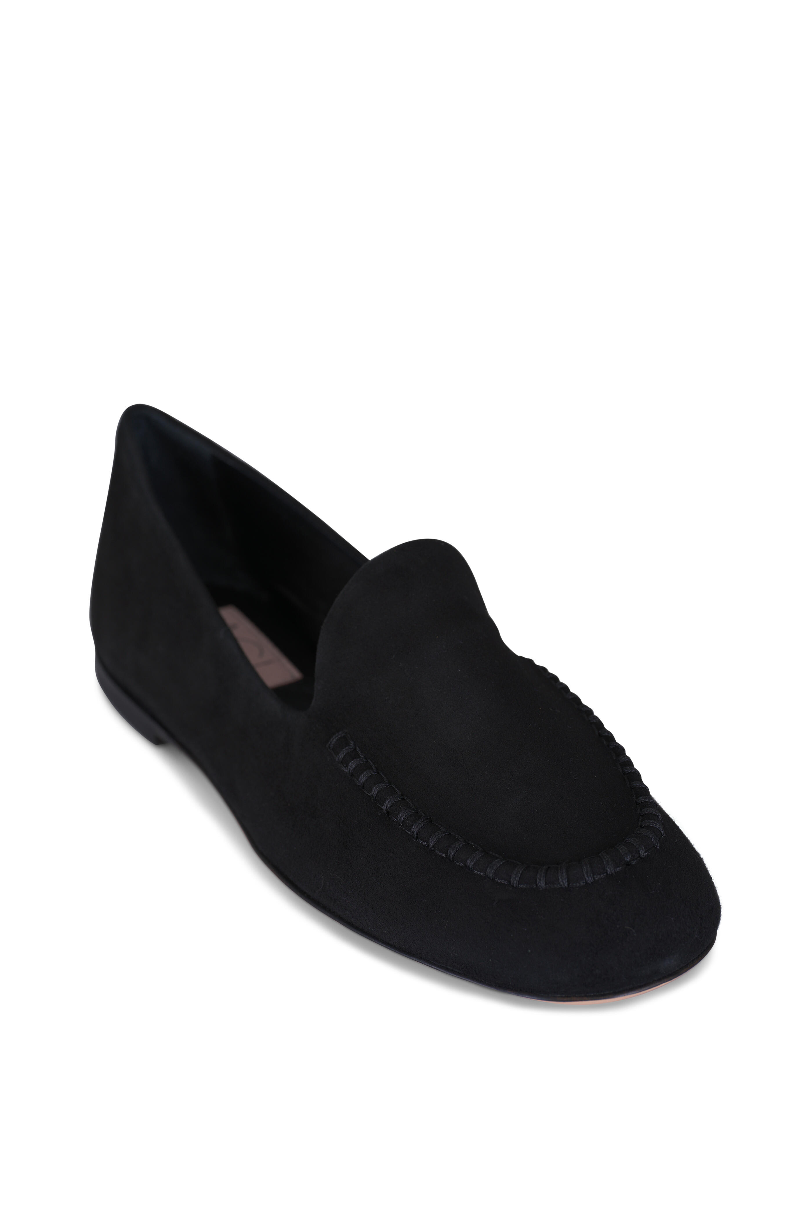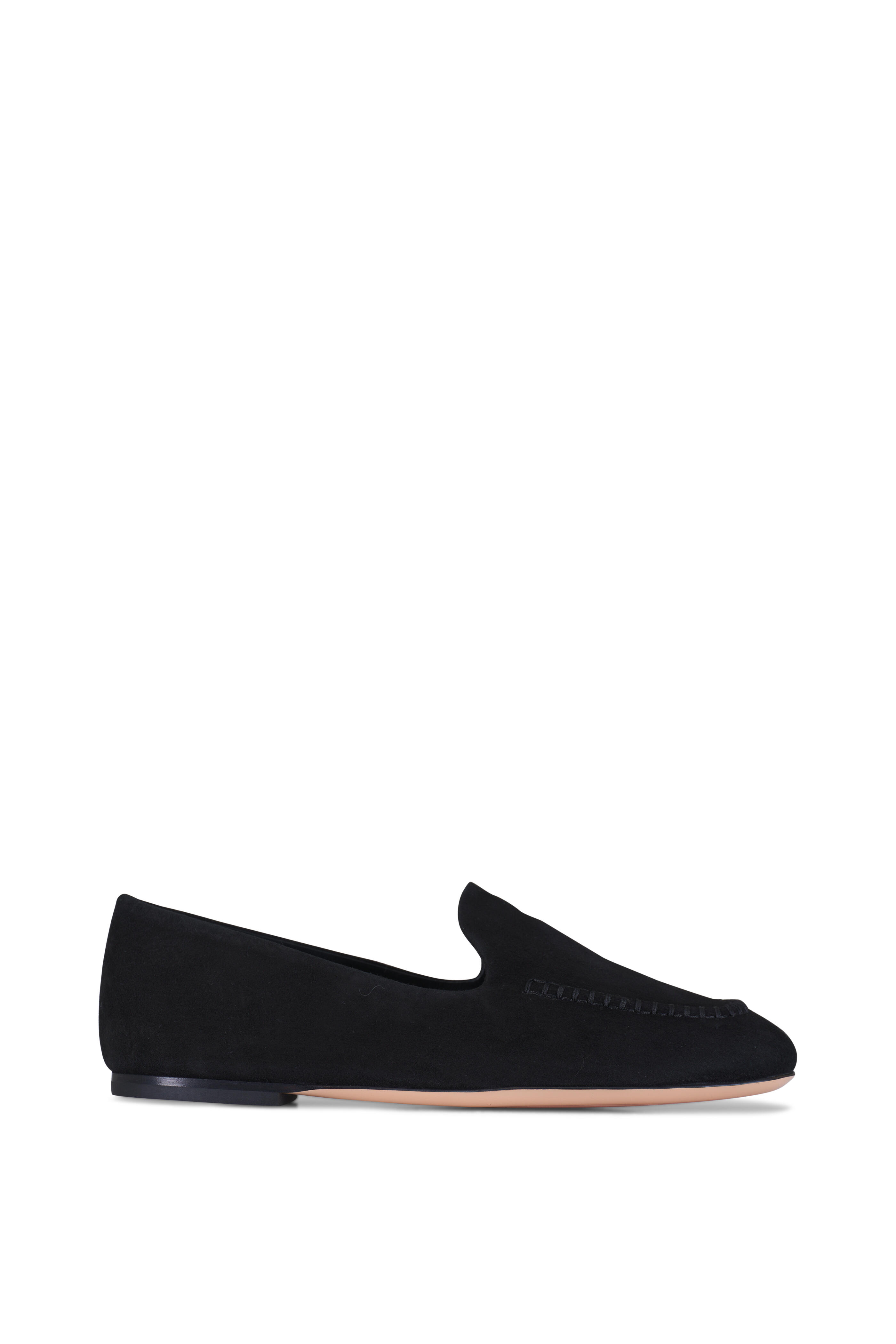 Suede upper. Leather lining and sole. Round closed toe. Slip-on style. Tonal stitching. Made in Italy.