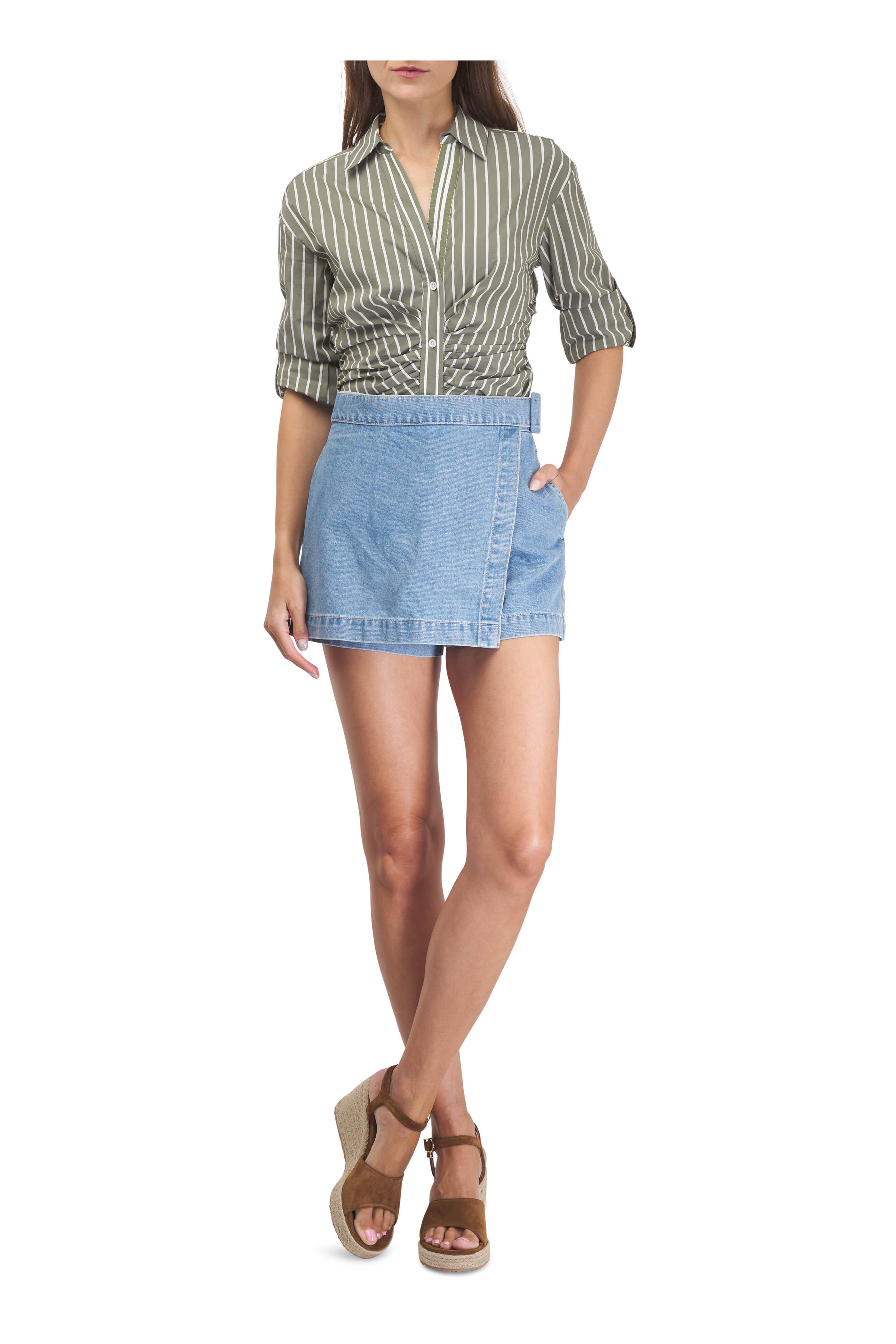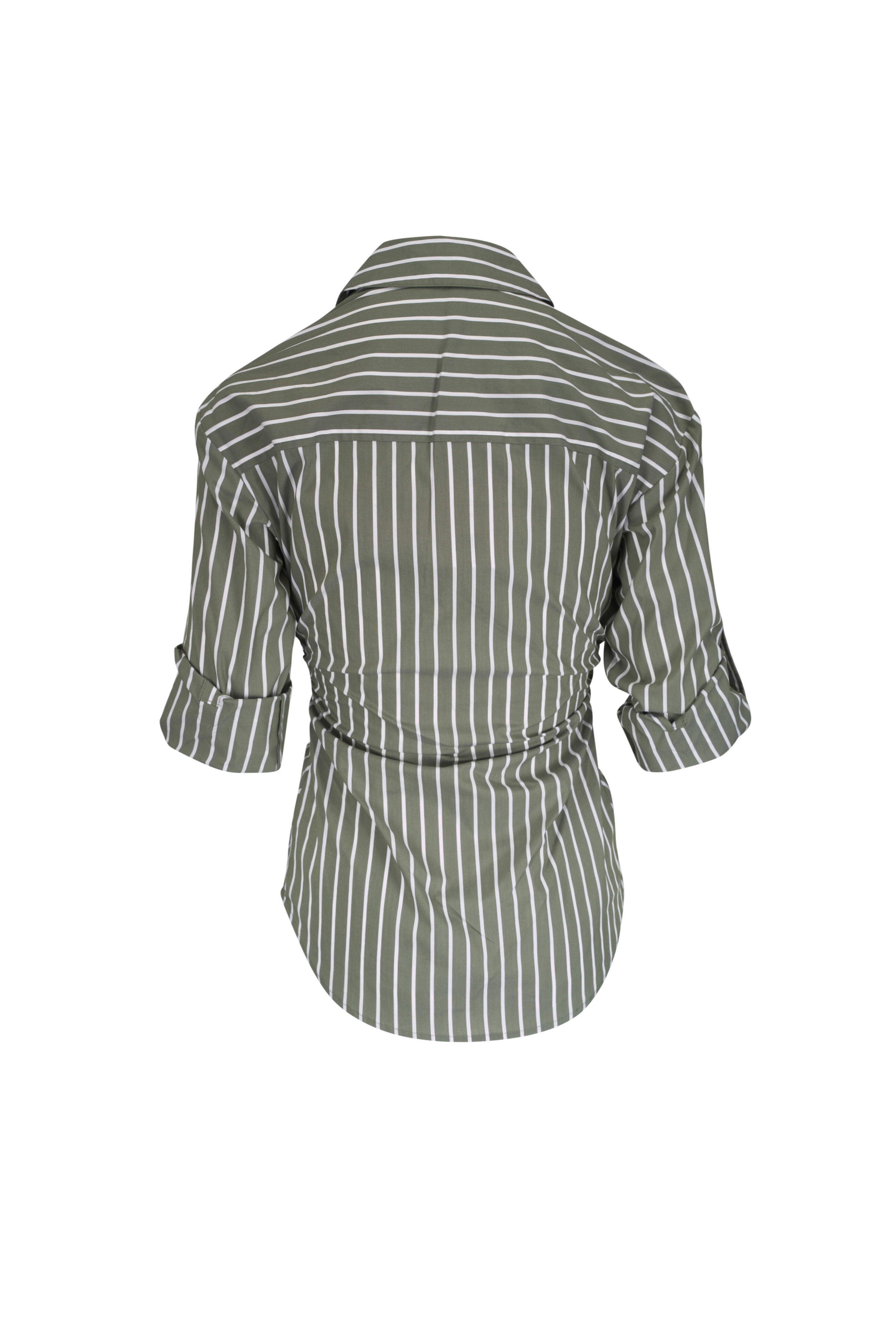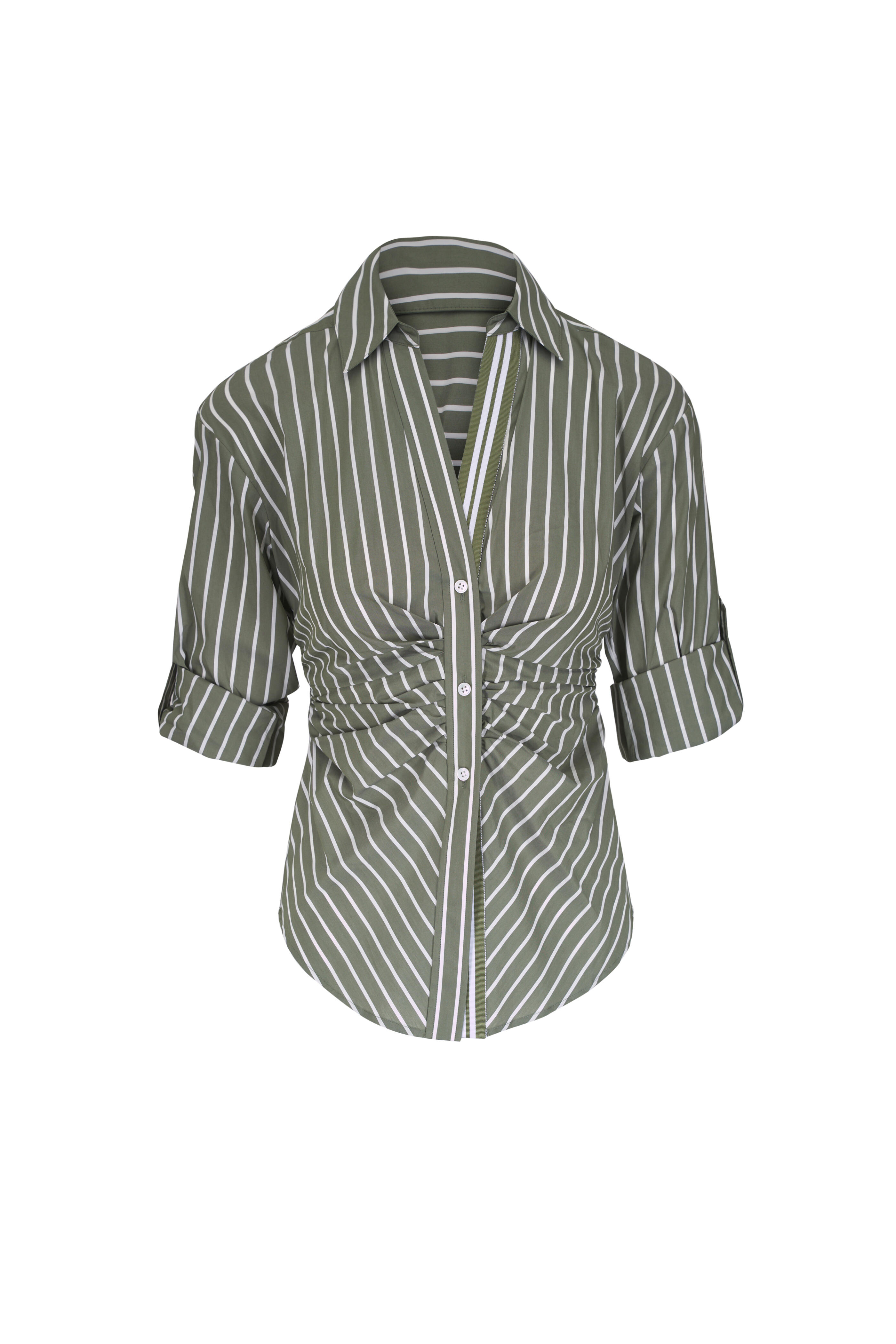 Spread collar. Front button placket. Deep v-neckline. Ruched detailing at waist. Pre-cuffed sleeves. Imported. Approximately 27 ¼” shoulder to hem (measurements taken from size 2). 84% cotton, 12% polyamide, 4% elastane. Dry clean.