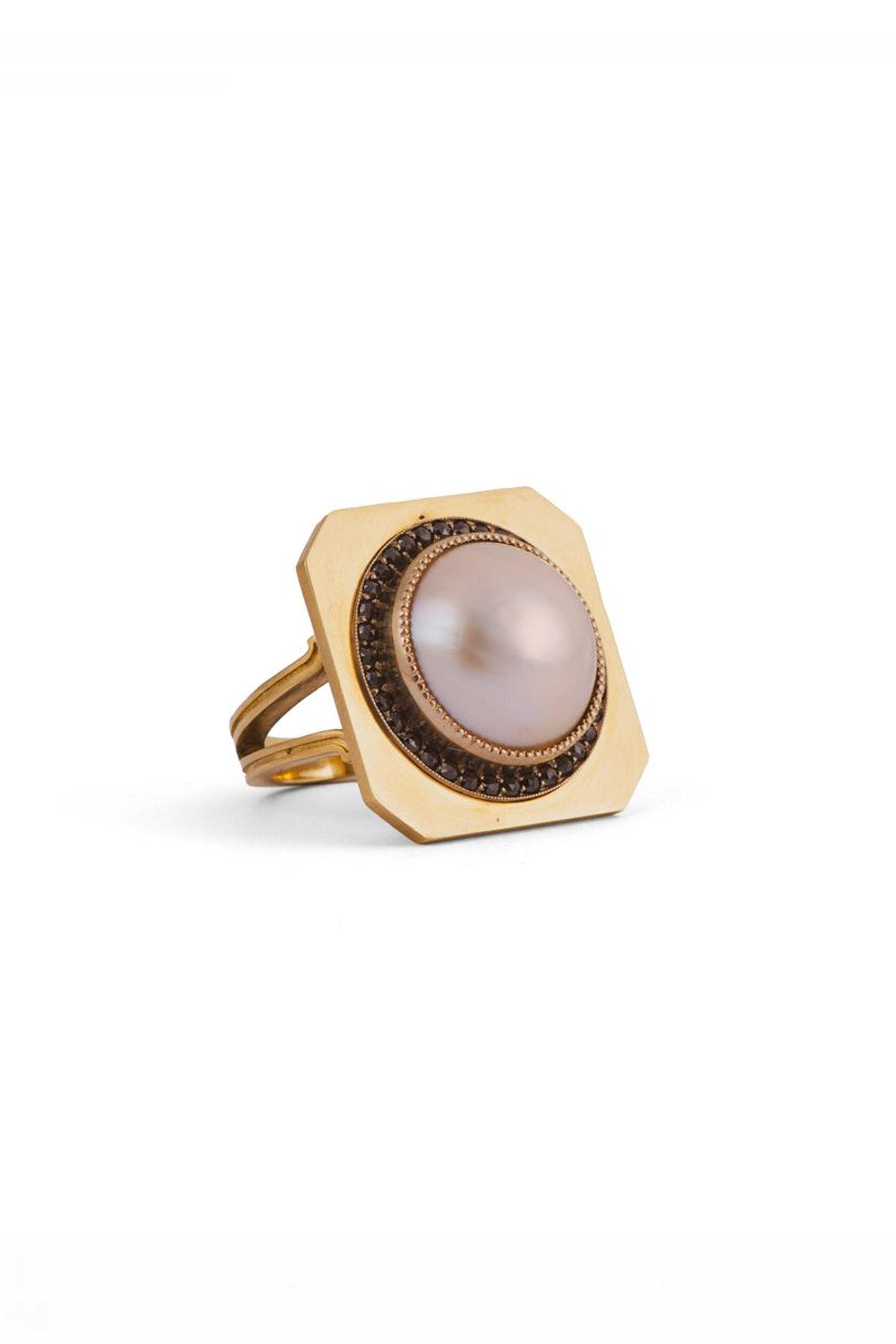 18k yellow gold. 18k white gold. Diamond 0.56 total carat weight. Black diamond. Cabochon pearl. Brushed gold design. Black diamond halo. Octagon design. Prong setting. Made in the USA. Call for ring size.