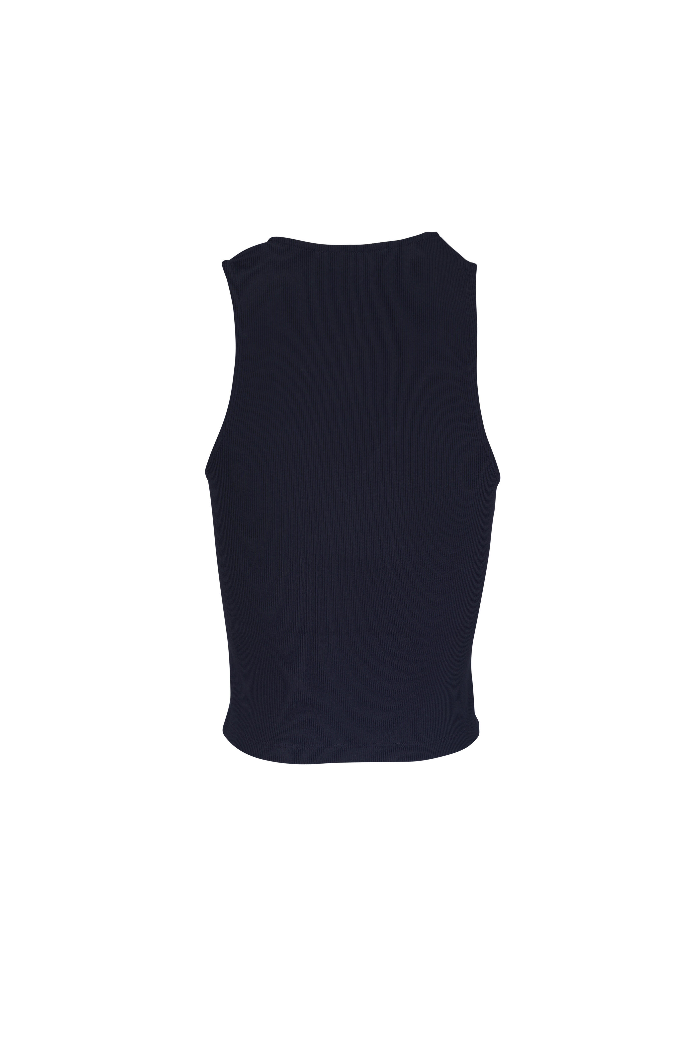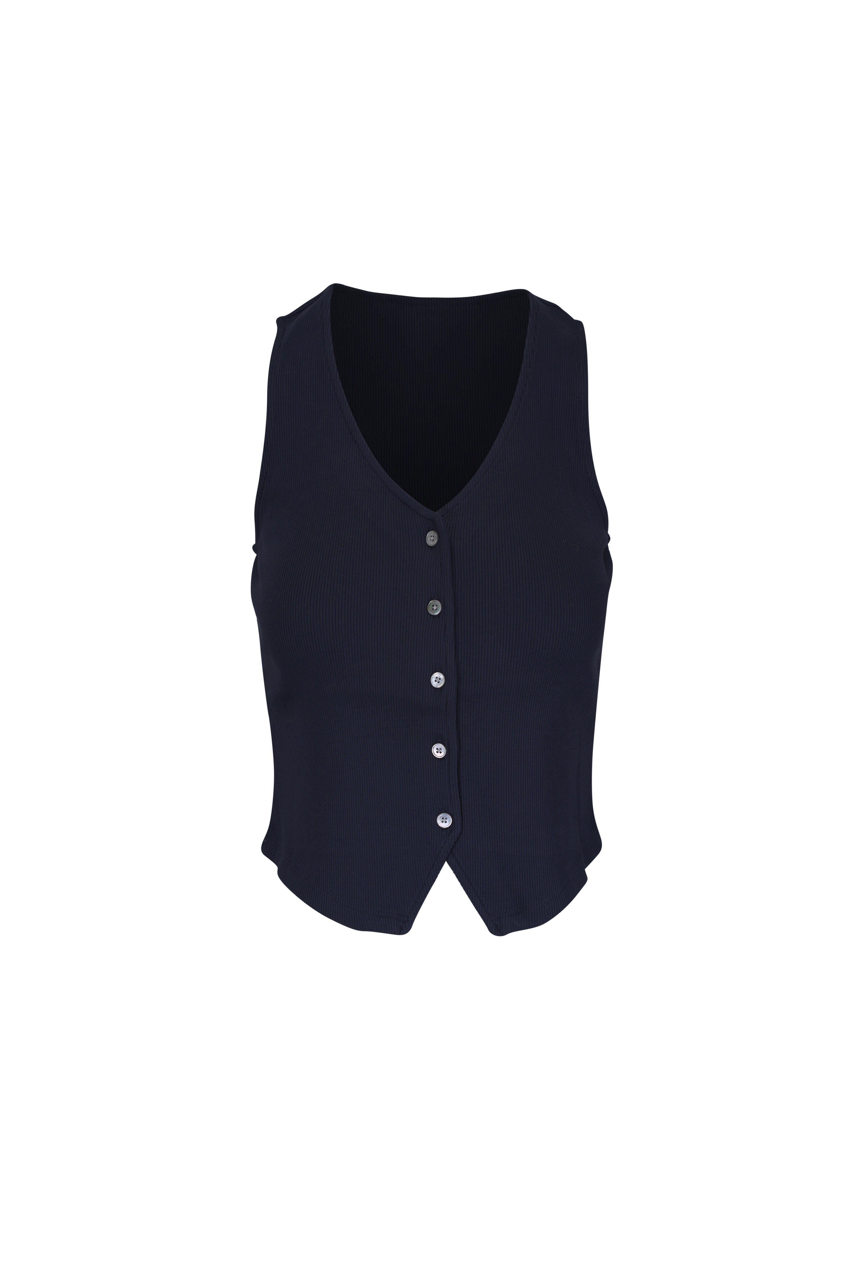 V-neckline. Front button placket. Ribbed throughout. Angled cutaway hem. Imported. Shoulder to hem 21" (size xs). 96% pima cotton, 4% elastane. Machine wash.