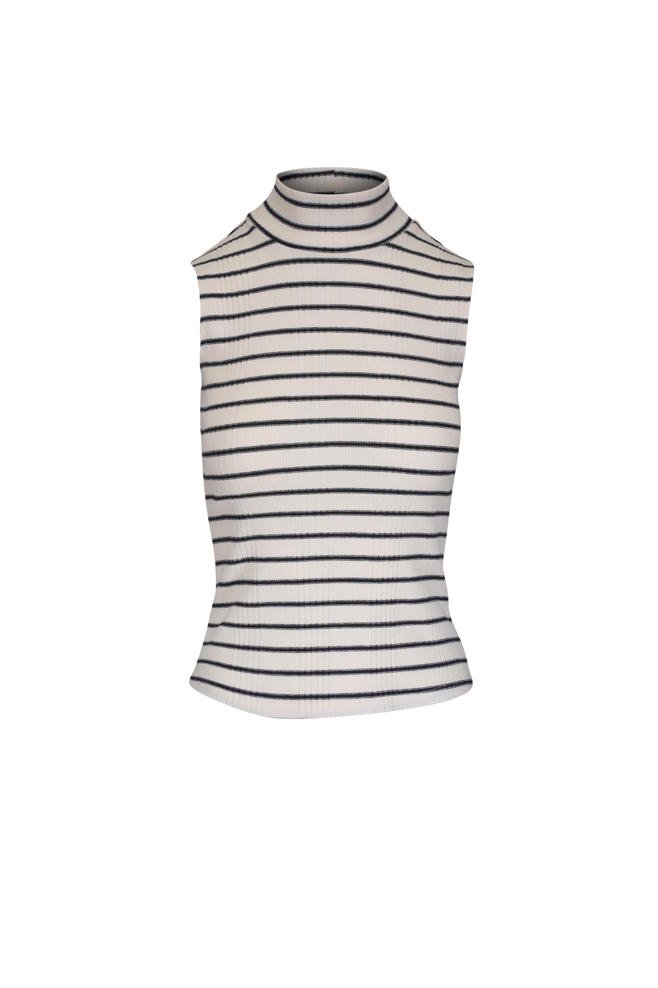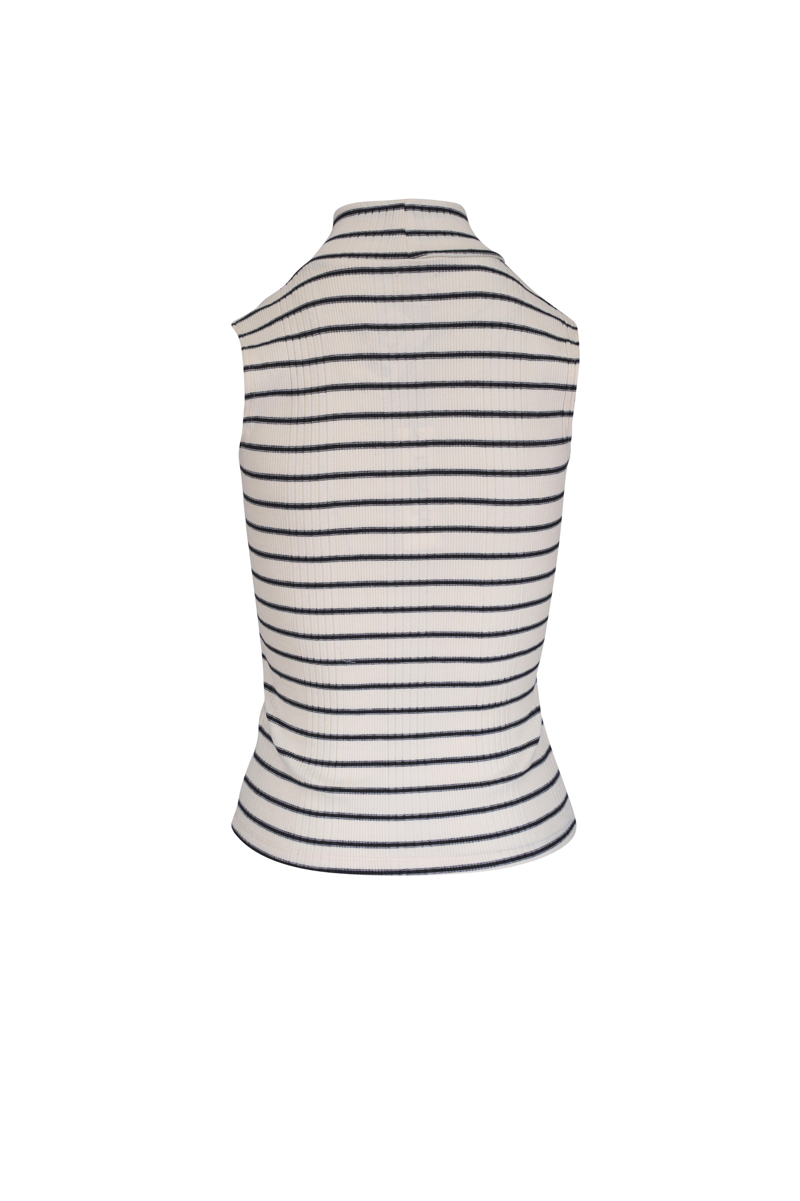 Mock neckline. Slip-on style. Ribbed throughout. Made in the USA. Approximately 23" shoulder to hem. Fitted. 56% cotton, 38% modal, 6% spandex. Hand wash.