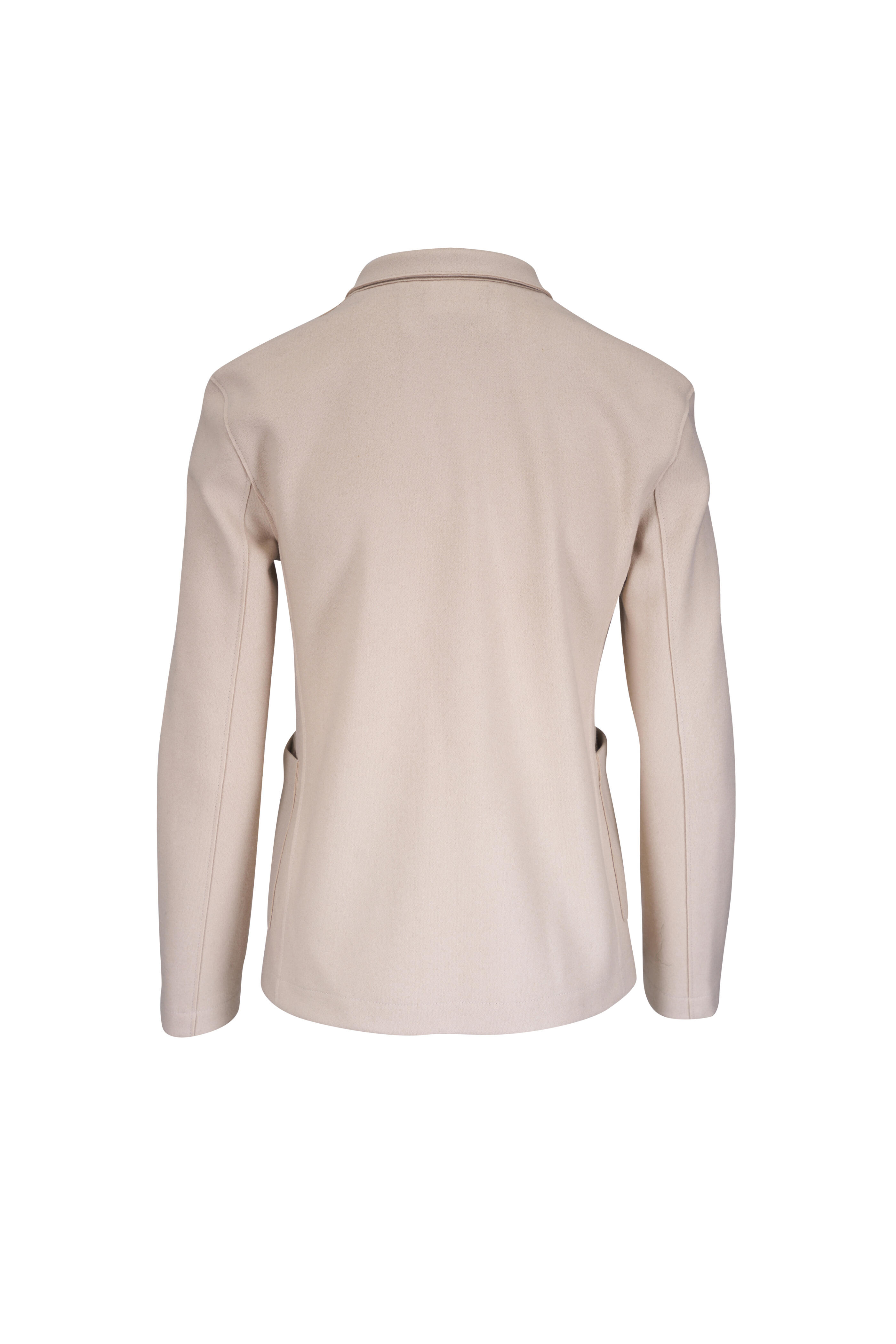 Stand-up (high) collar; notched lapels. Front button placket. Lower patch pockets. Made in Italy. 90% virgin wool, 10% cashmere. Dry cleaning.