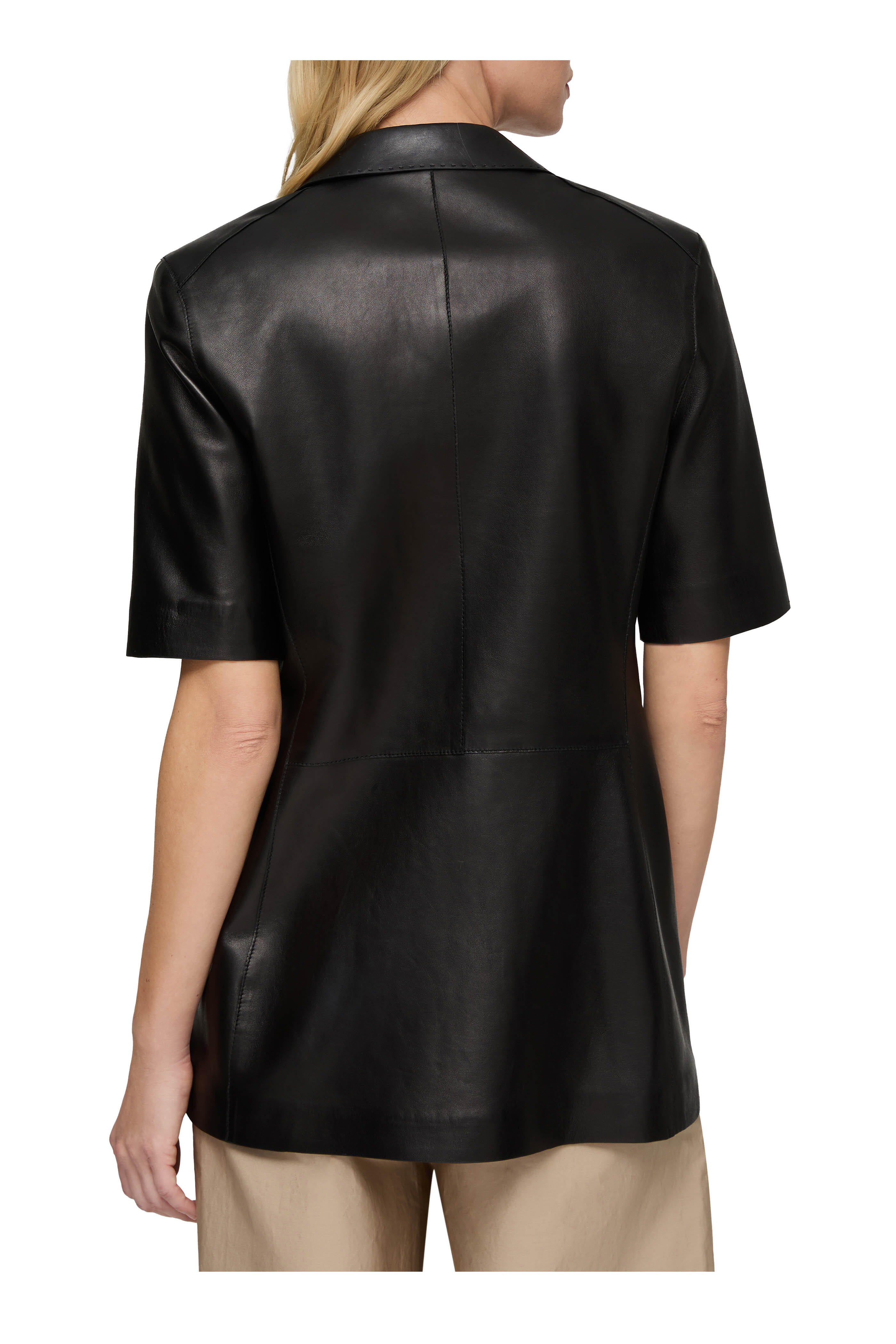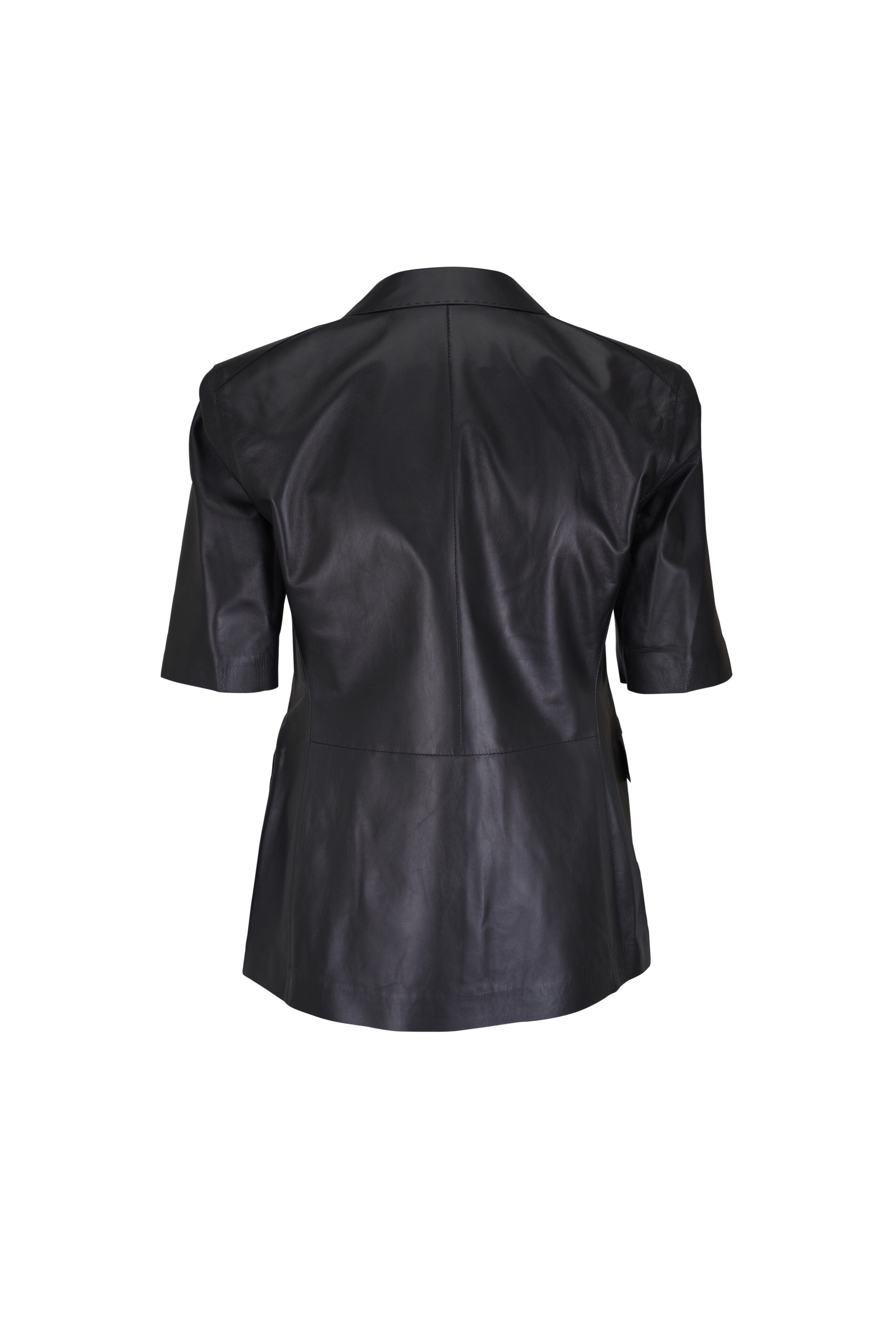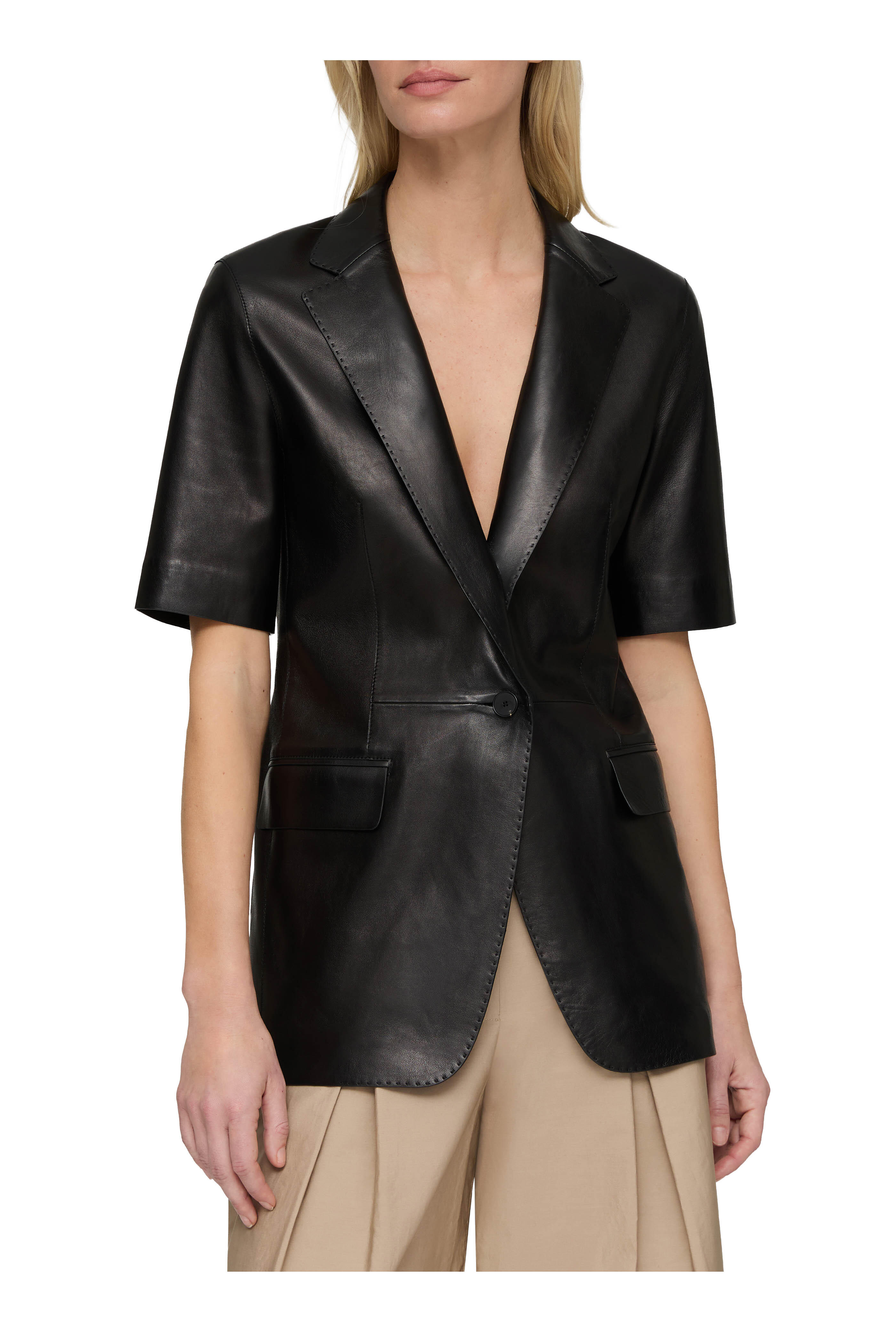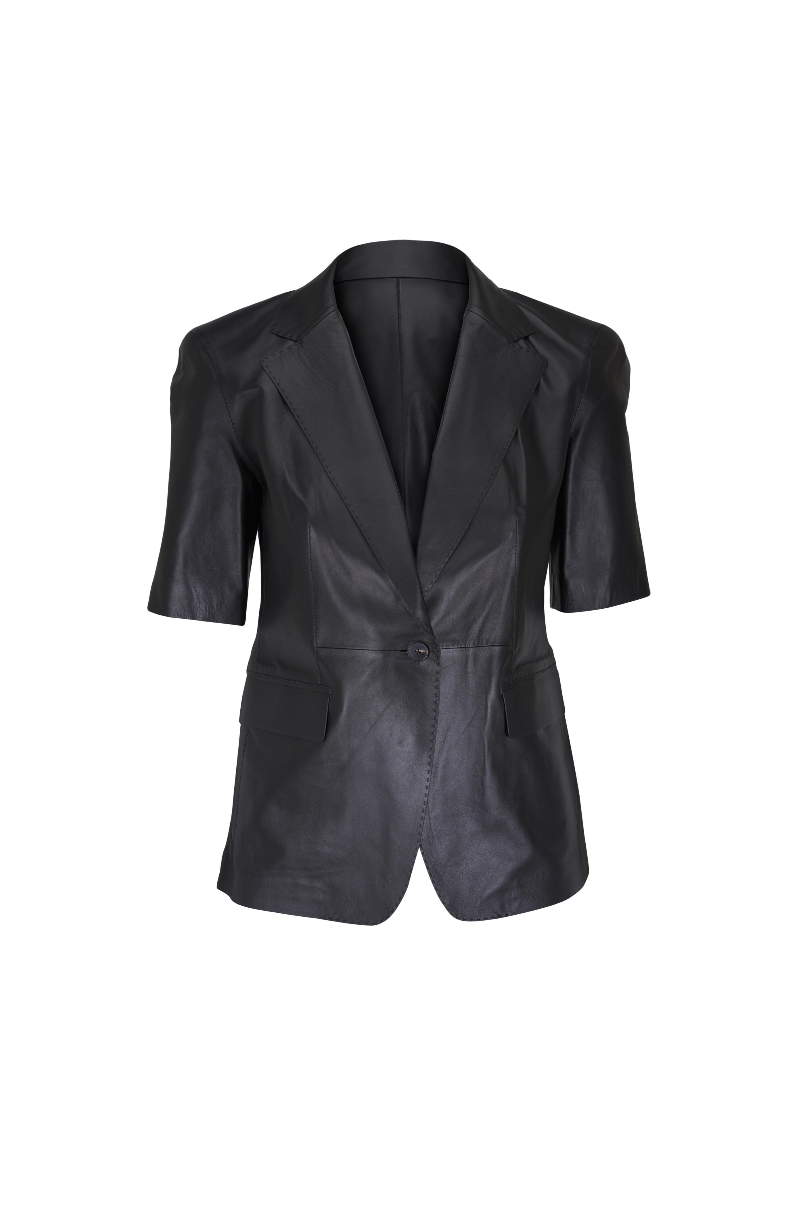 Lambskin leather; lined. Specialist clean. Notched lapels. Single button closure. Above elbow sleeves. Lower flap pockets. Made in Italy. Size 4: 20" sleeve ⁄ 37" bust ⁄ 27" long.