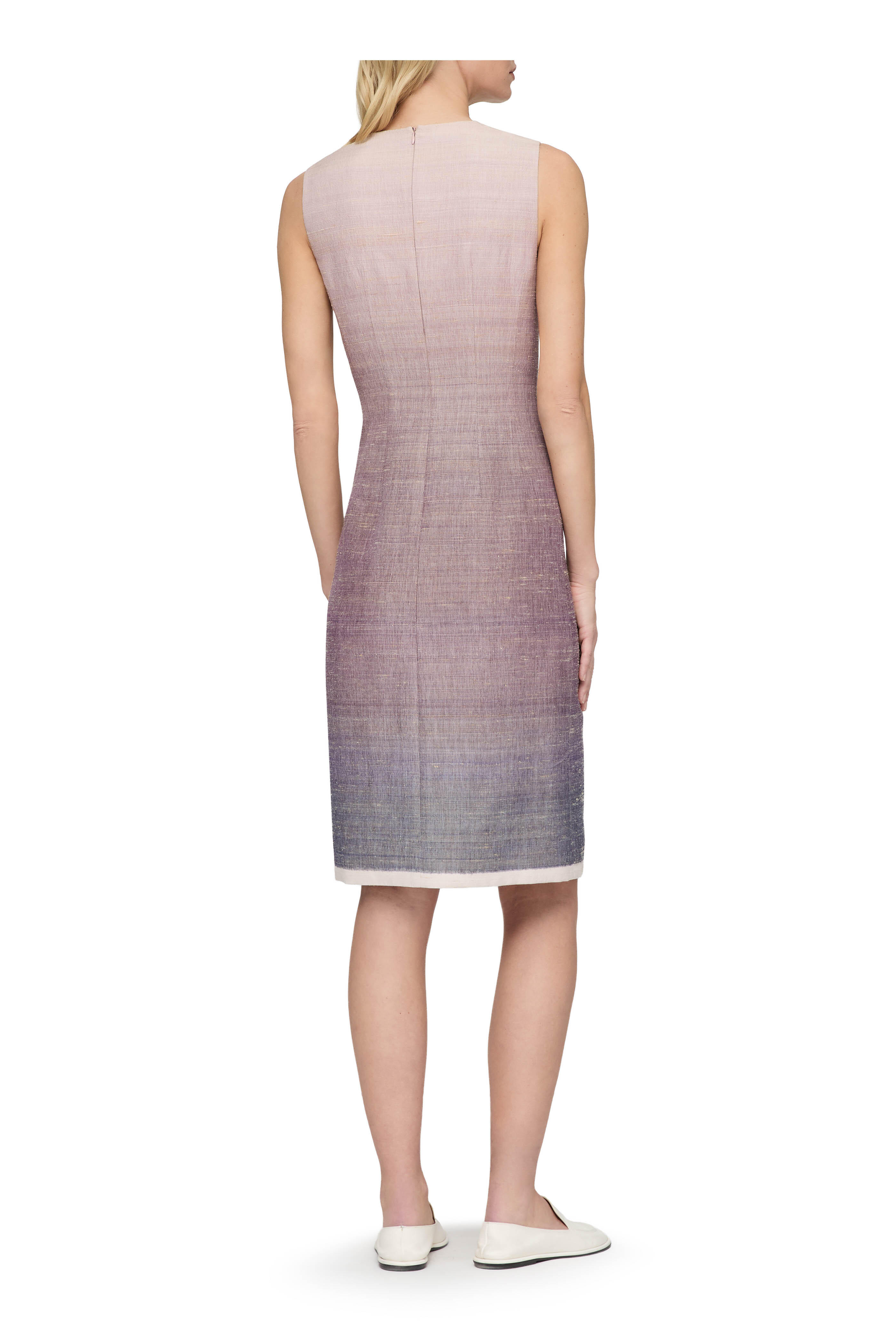 Round neckline. Concealed back zip. Imported. Color: Violet Ash. 41" shoulder to hem. 55% tussah silk 40% polyester 5% wool; lined. Dry clean.