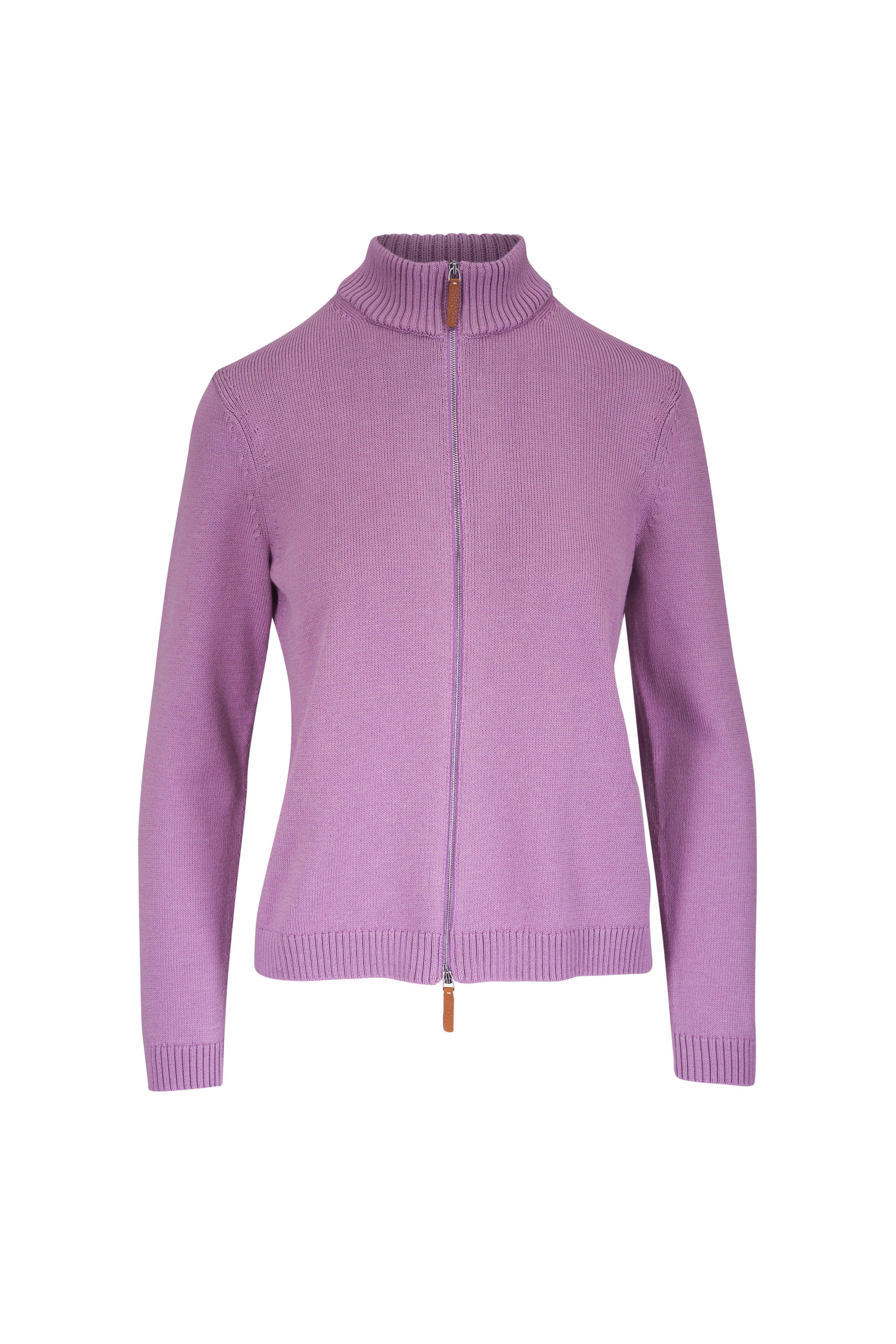 Stand collar. Two-way front zip. Ribbed trims. Imported. 70% cotton, 30% silk. Dry clean.