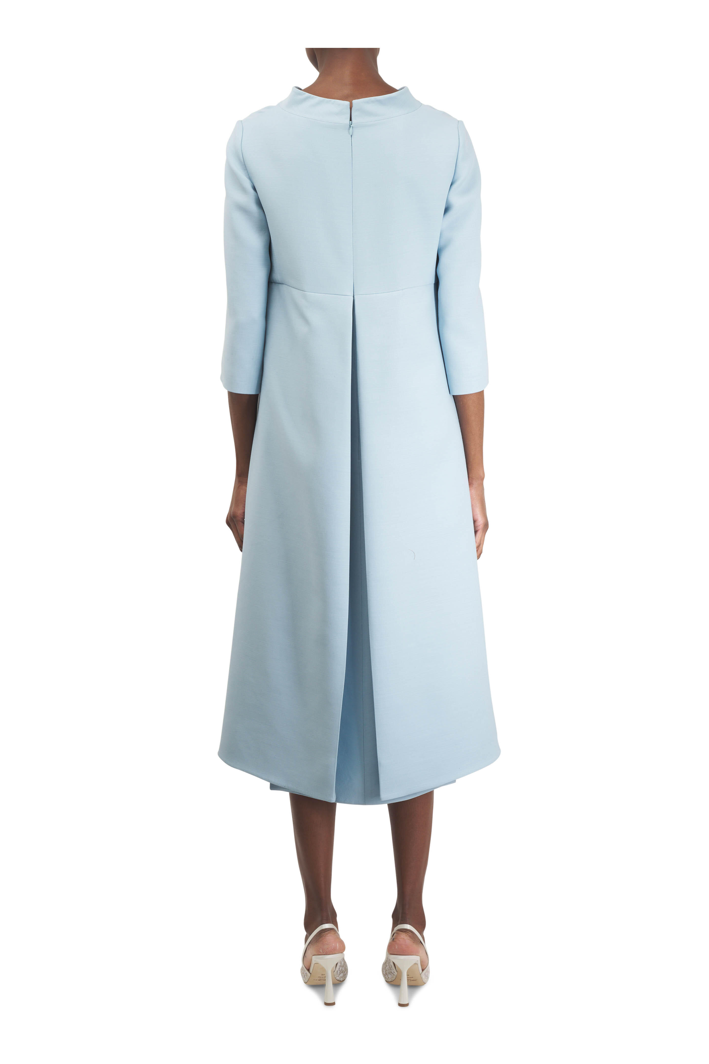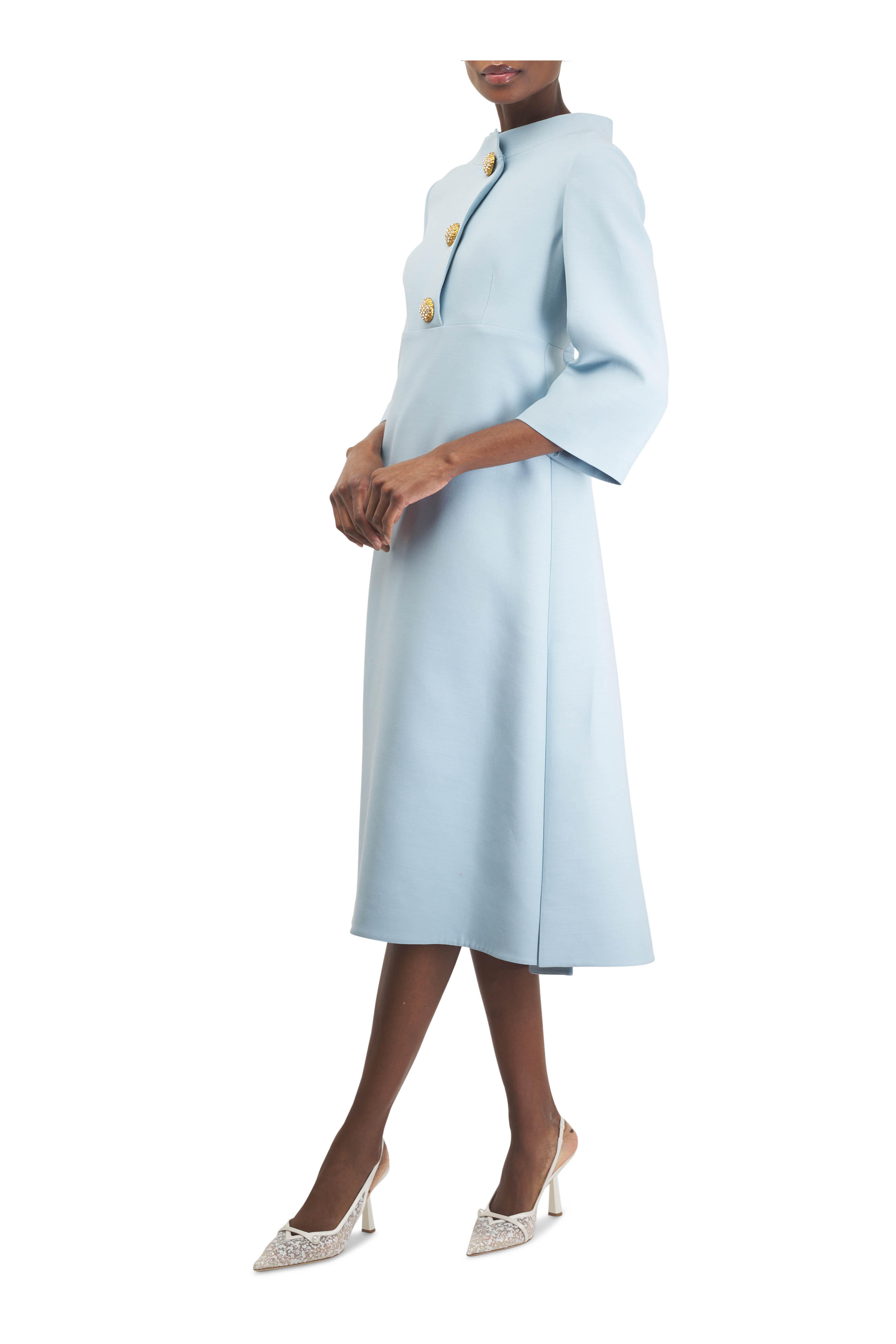 Bateau neckline; stand collar. Concealed back zip. Three-quarter length sleeves. Jewel button detail. Made in Italy. Approximately 47" shoulder to hem (measurements taken from size 4). 65% virgin wool, 35% silk; lining: 100% silk. Dry clean.