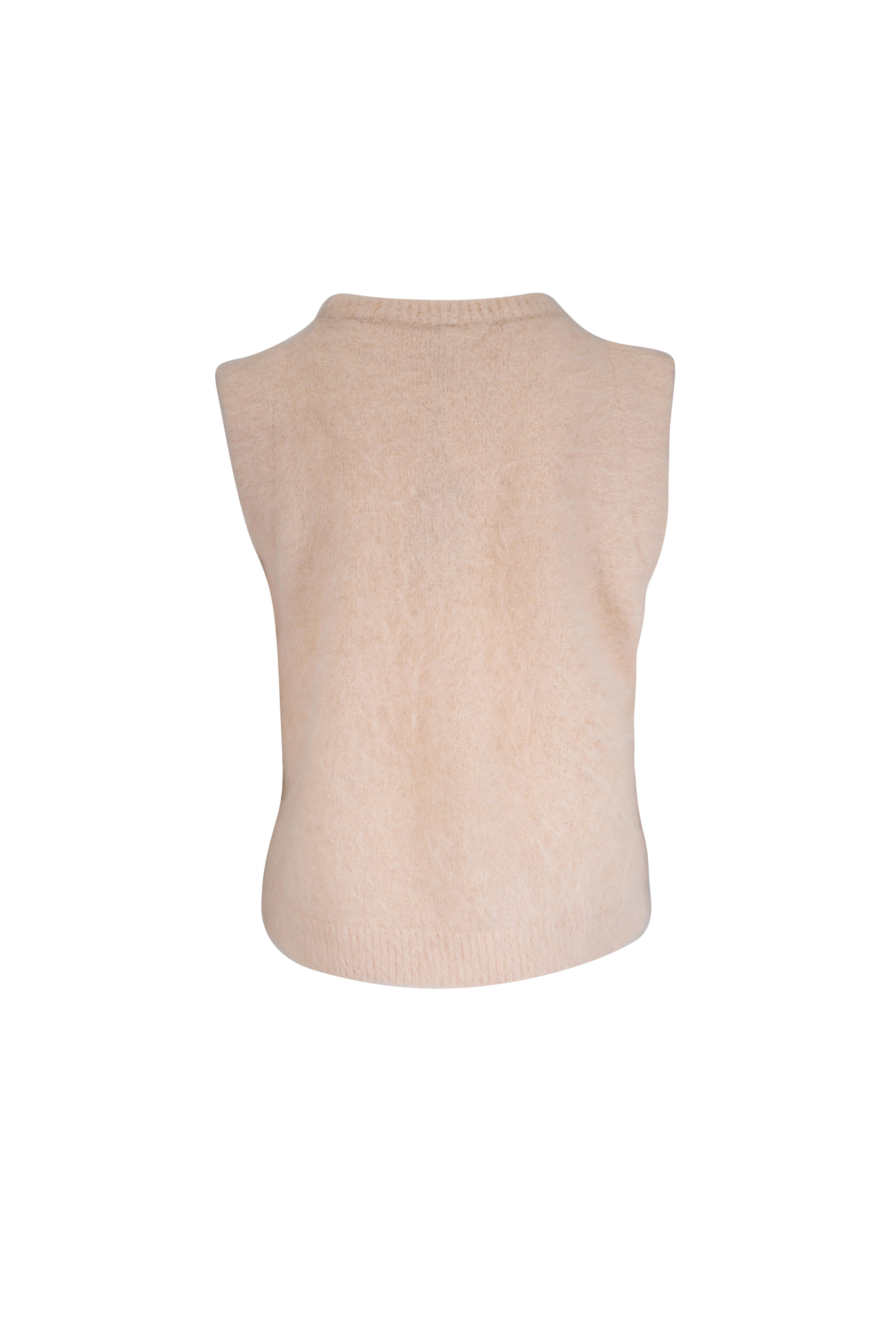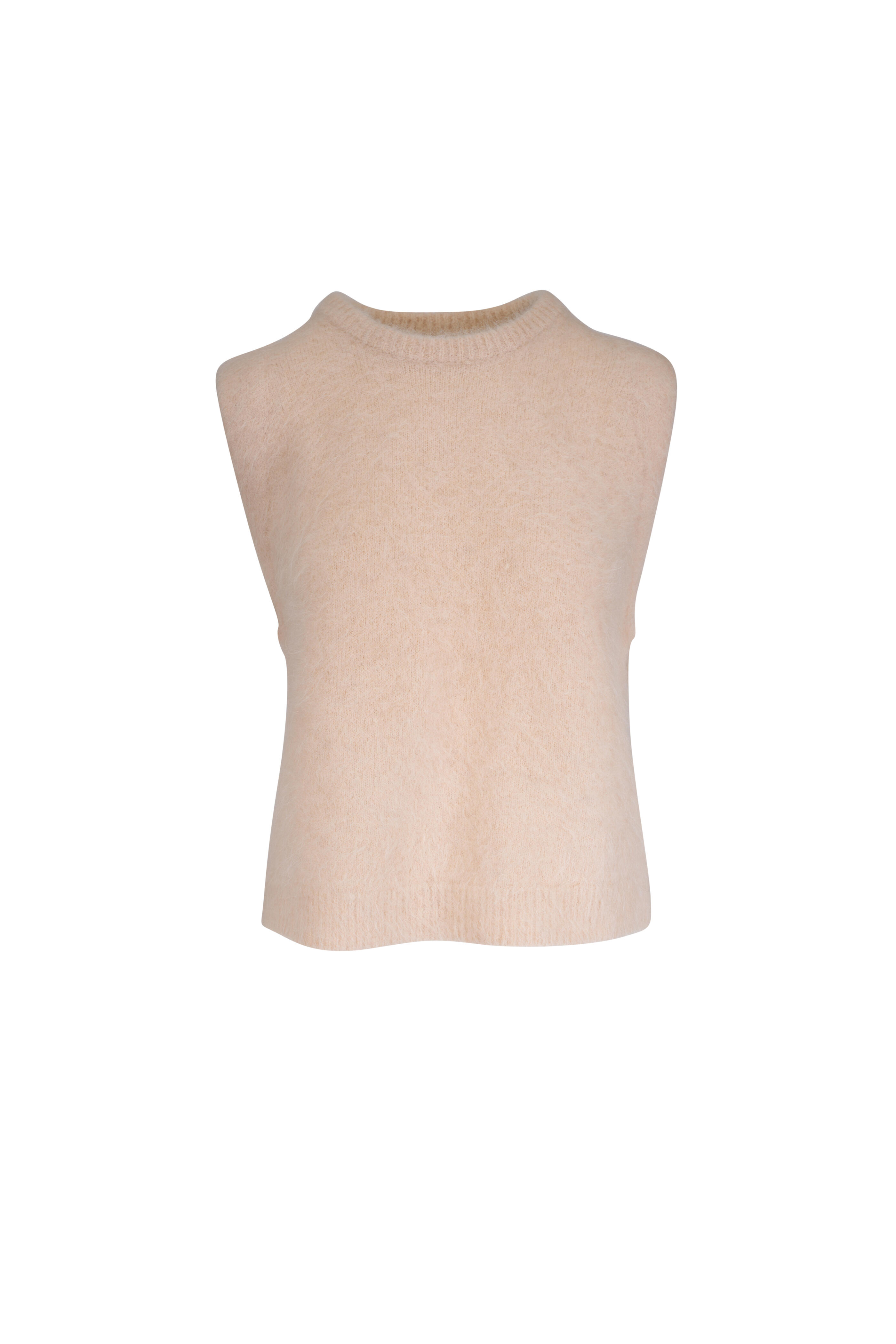 Round neckline. Deep arm holes. Ribbed trims. Imported. 78% alpaca, 19% nylon, 3% spandex. Dry clean.