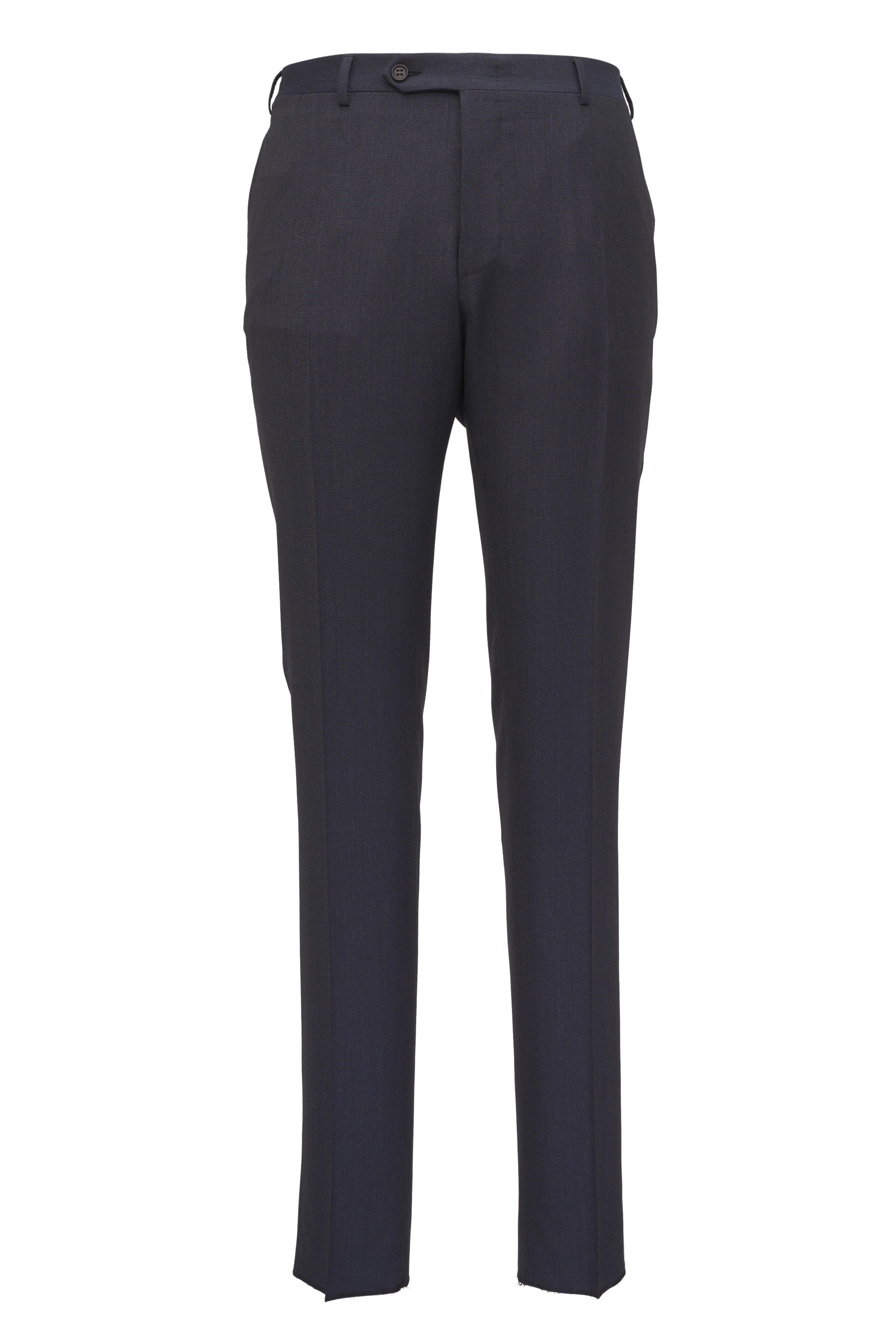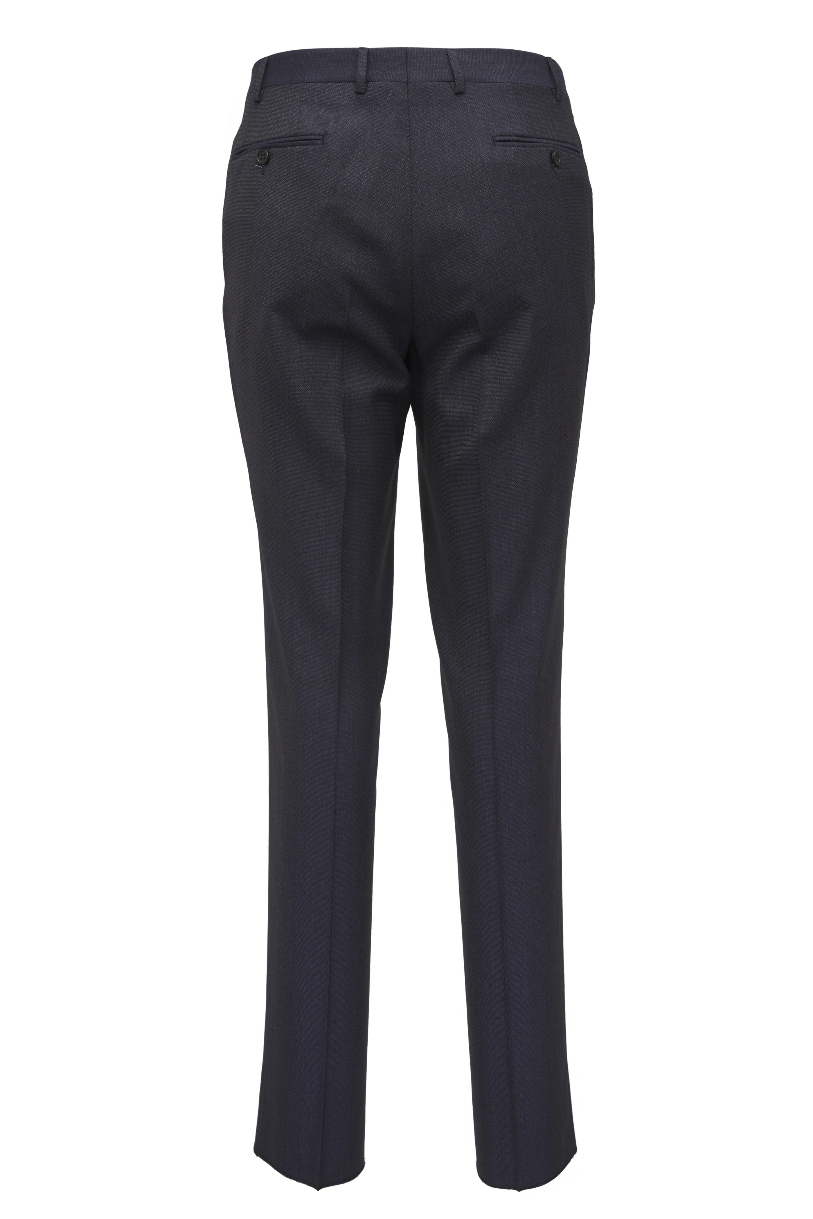 Zip fly; button tab closure. Belt loops. Front slip pockets; back besom pockets. Unfinished hem. Made in Italy. 100% wool. Dry clean.