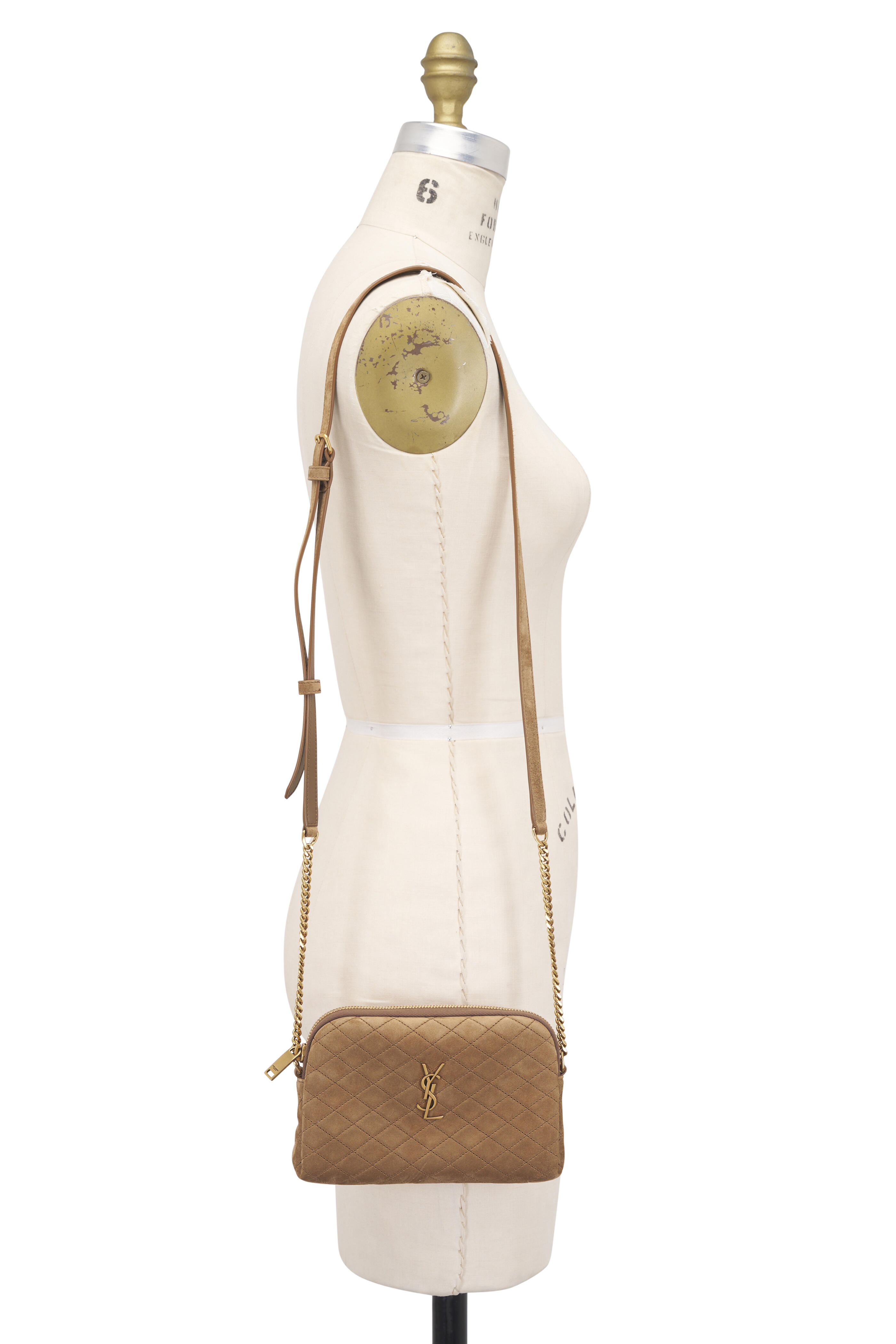 Calfskin suede. Top zip closure. Attached chain with leather inset shoulder strap. One main compartment. Bronze-toned hardware. Leather lining. Made in Italy. Dimensions: 7.5" x 4.7" x 1.2". Strap drop: 21.3".