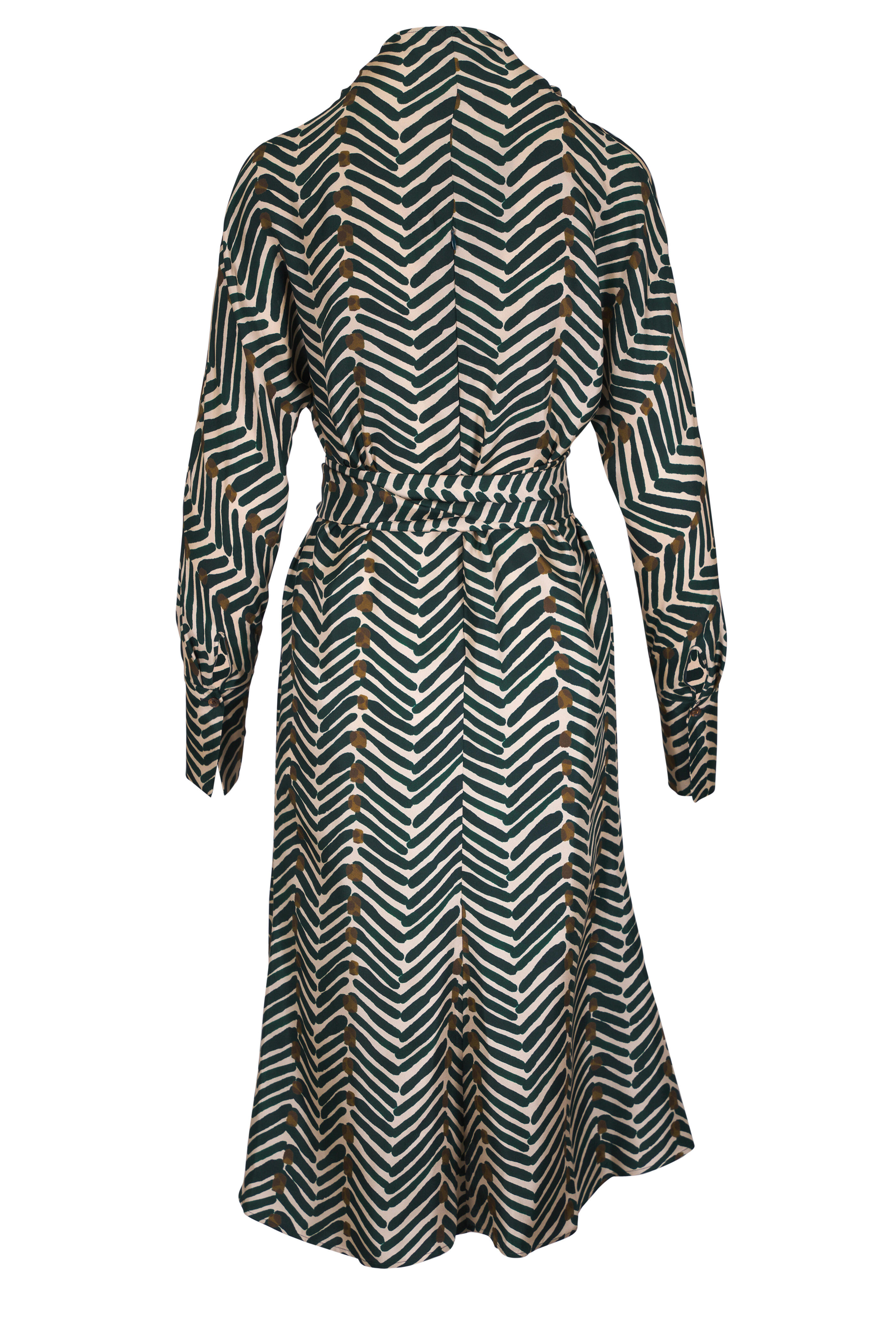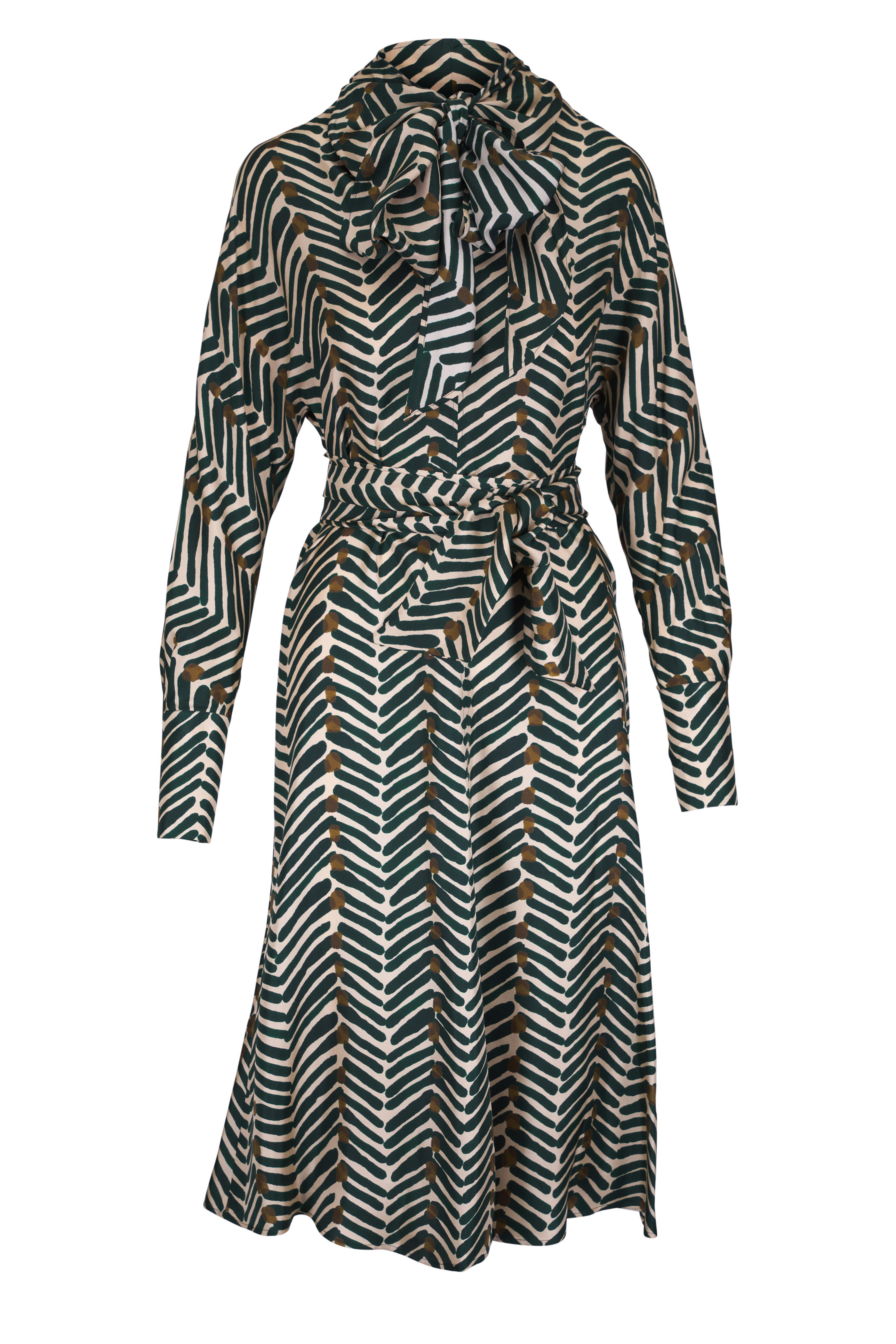 Stand collar; self tie scarf. Removable self tie belt. Single button square cuff. Made in Italy. Mid length. 100% silk. Dry clean.