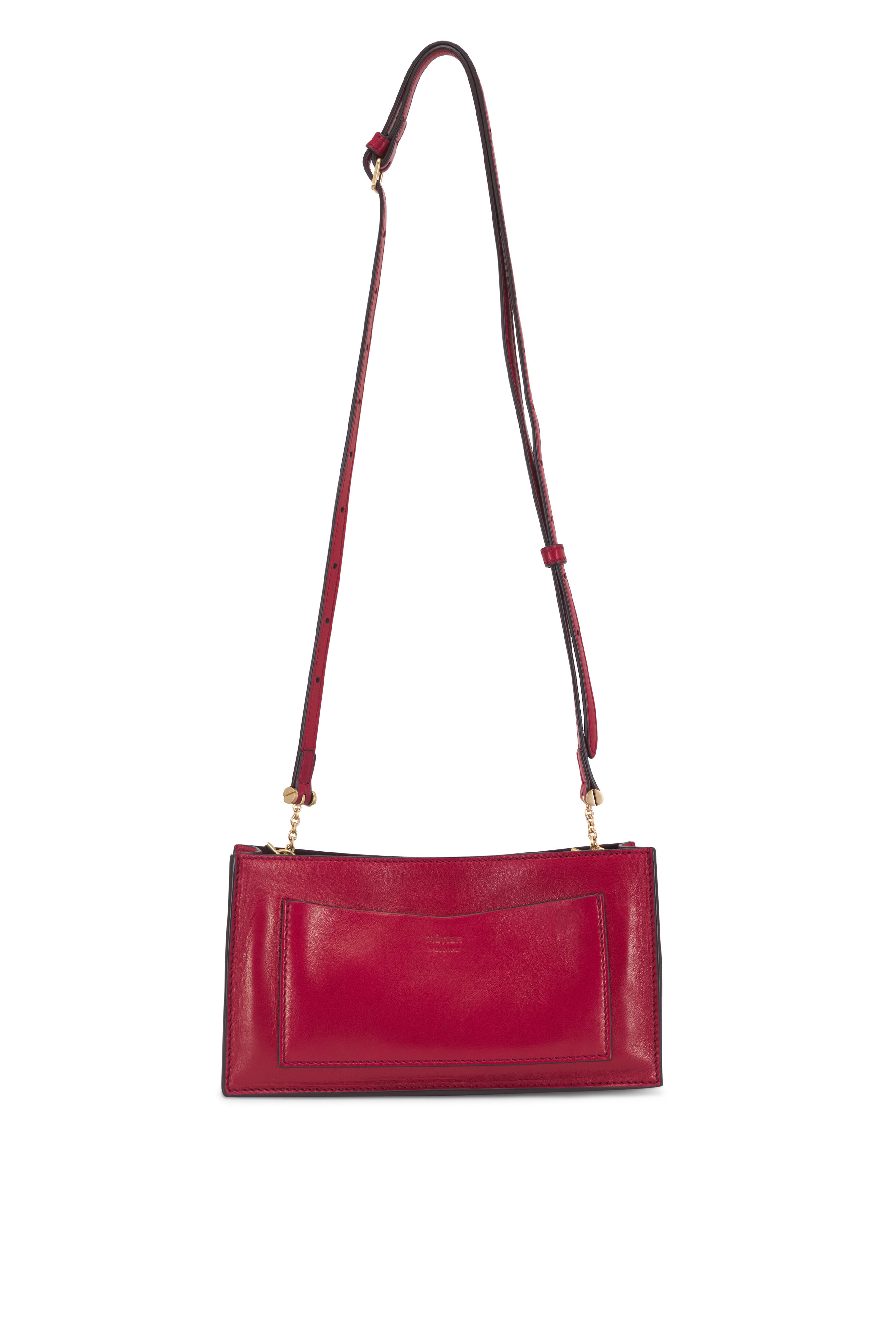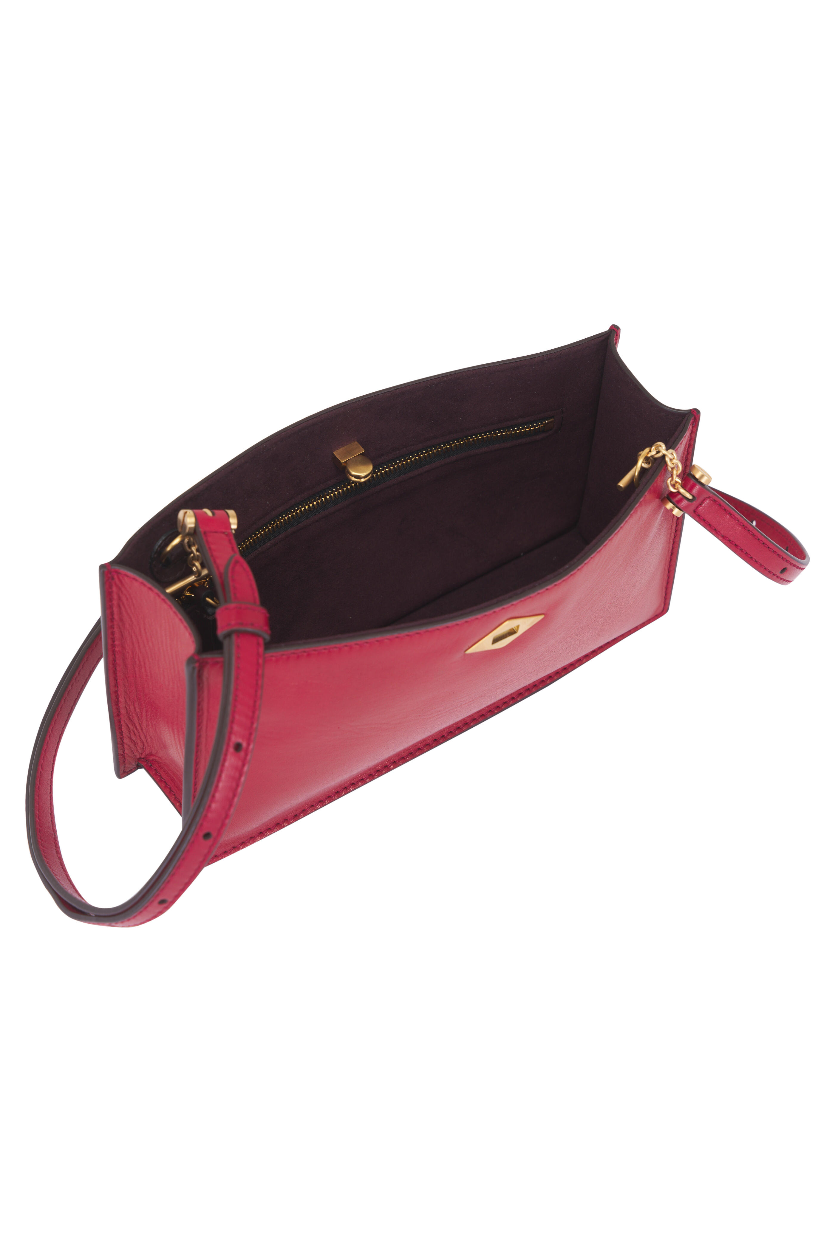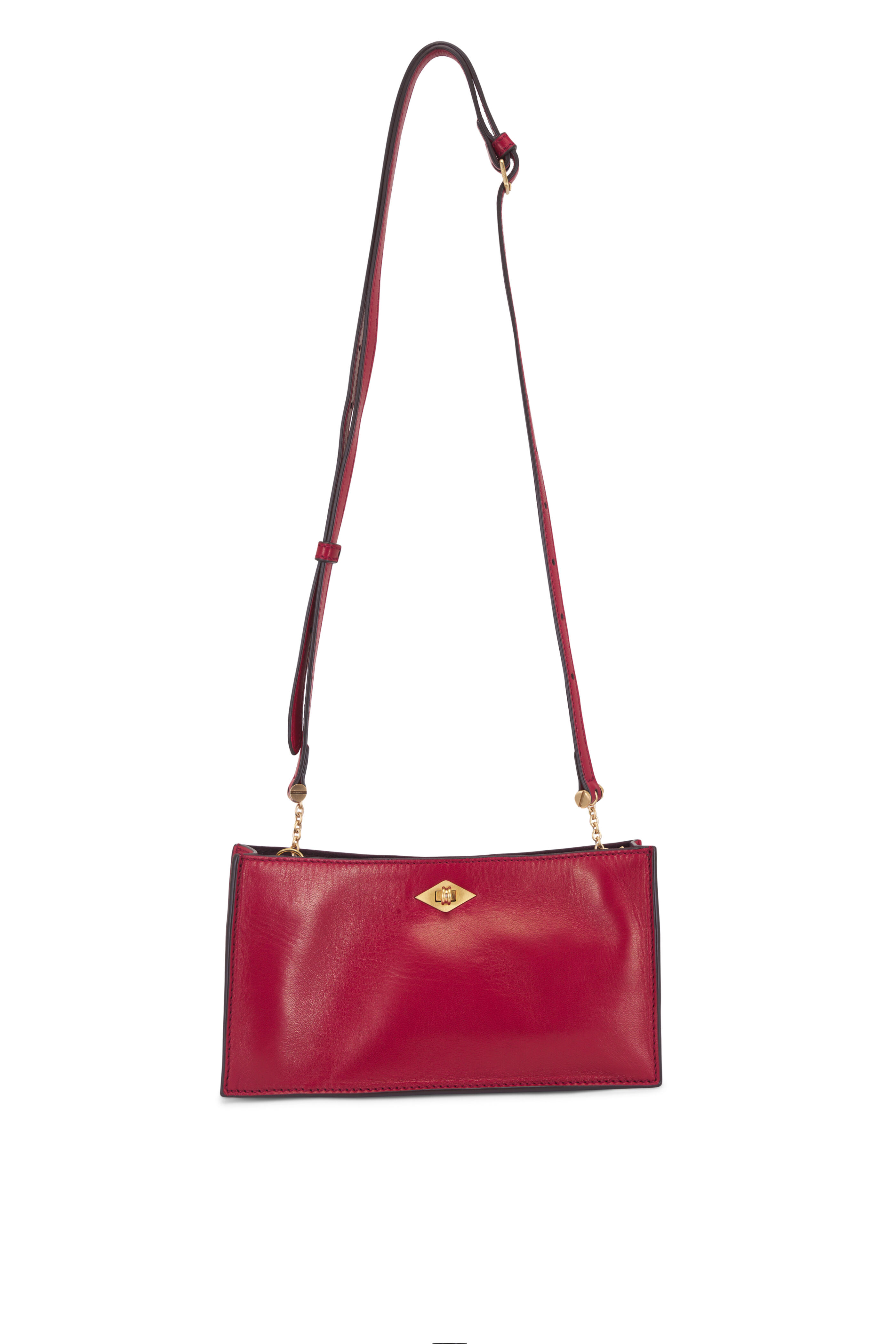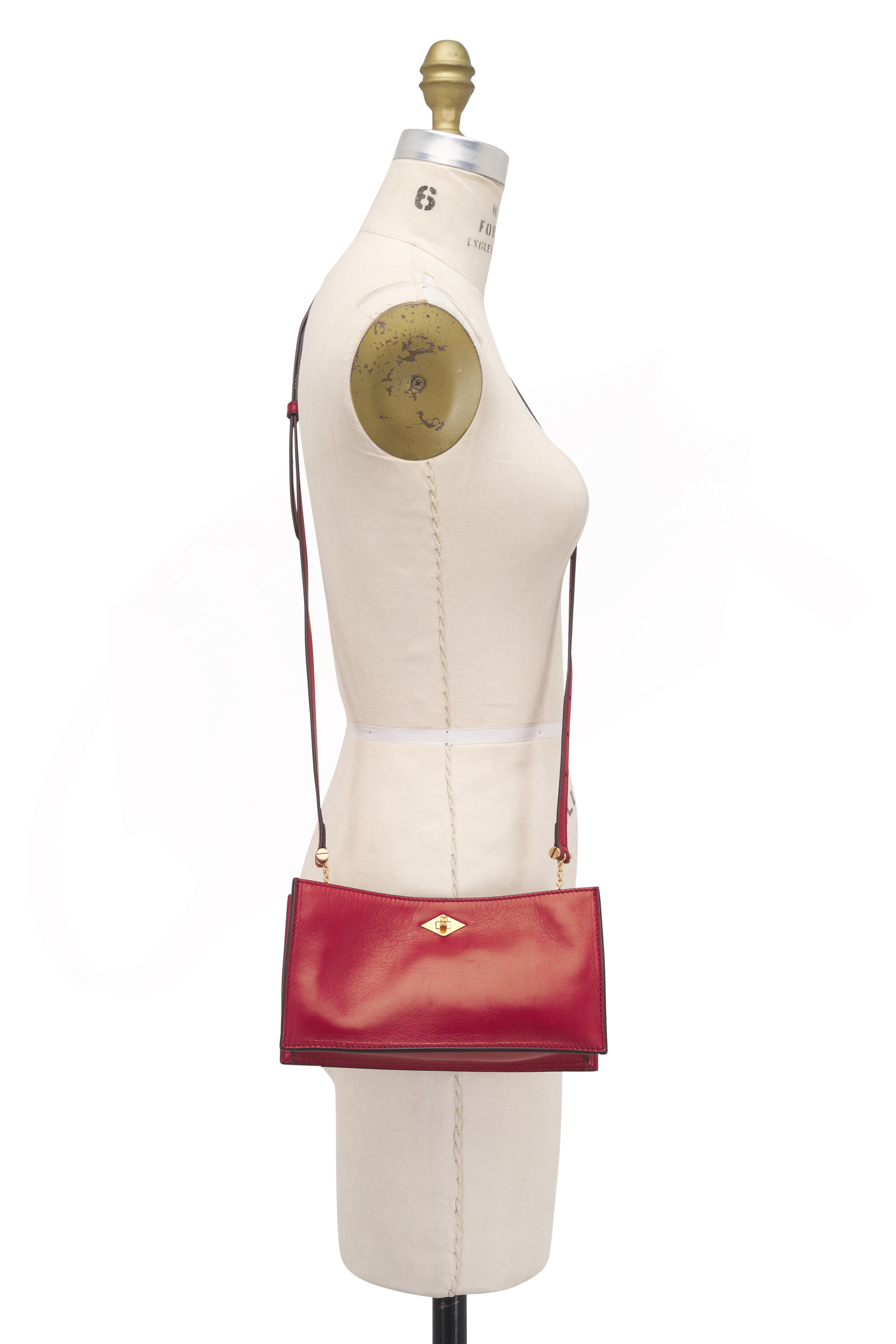 Buttery nappa lambskin leather. Signature diamond-shaped turn-lock. Detachable and adjustable crossbody strap. External back pocket; internal zipped pocket. Solid brass hardware. Made in Italy. Width: 9.1”. Depth: 2.0”. Height: 4.9”.