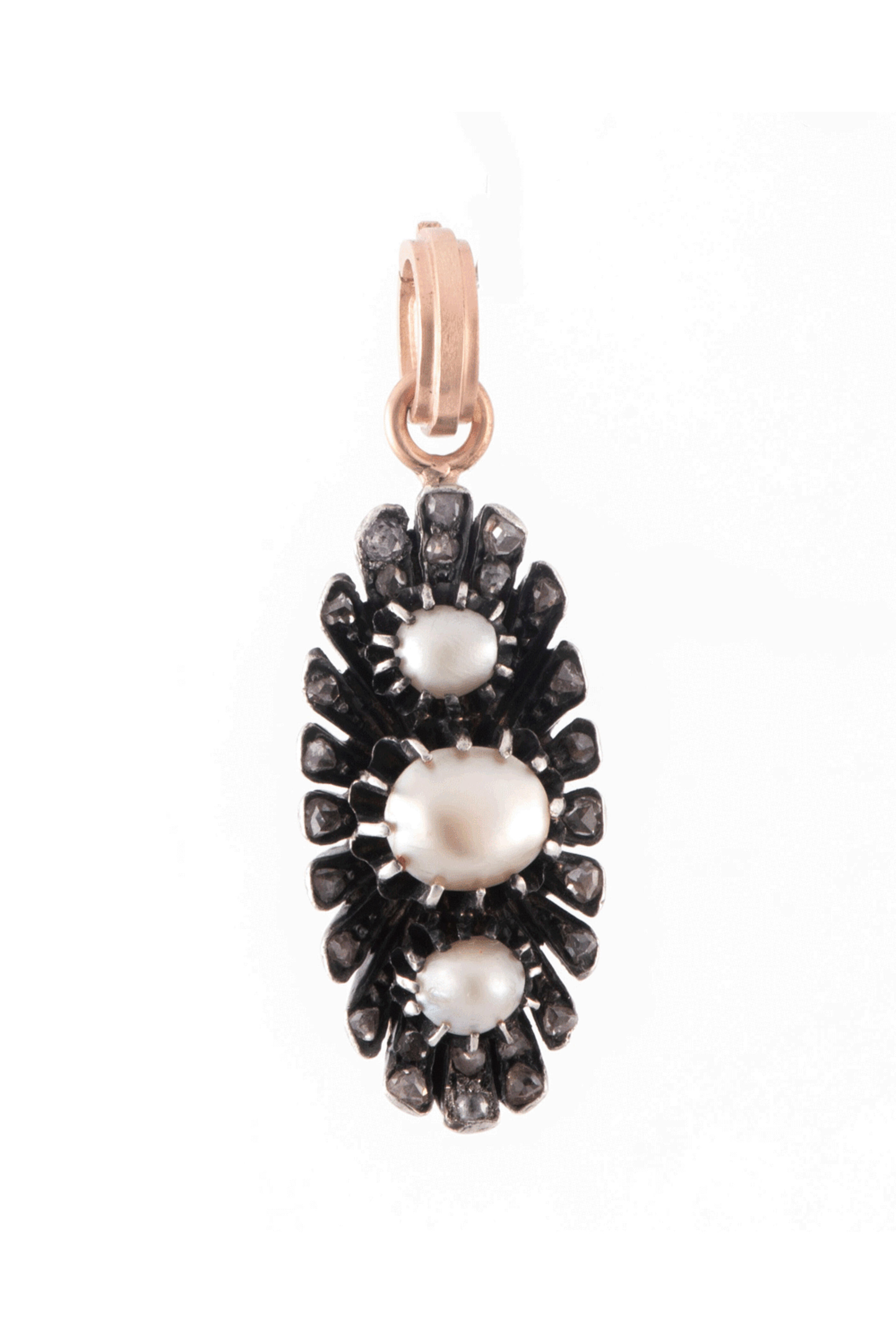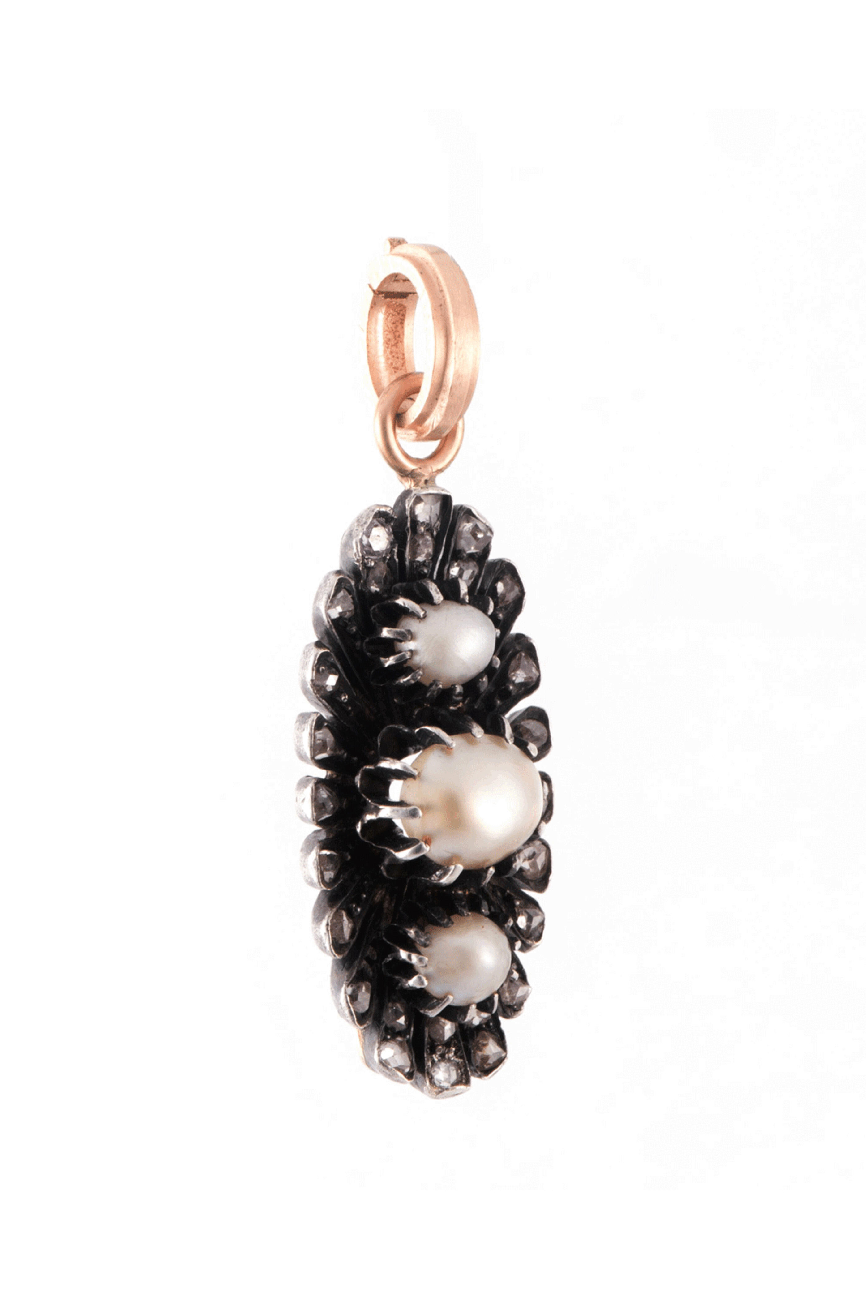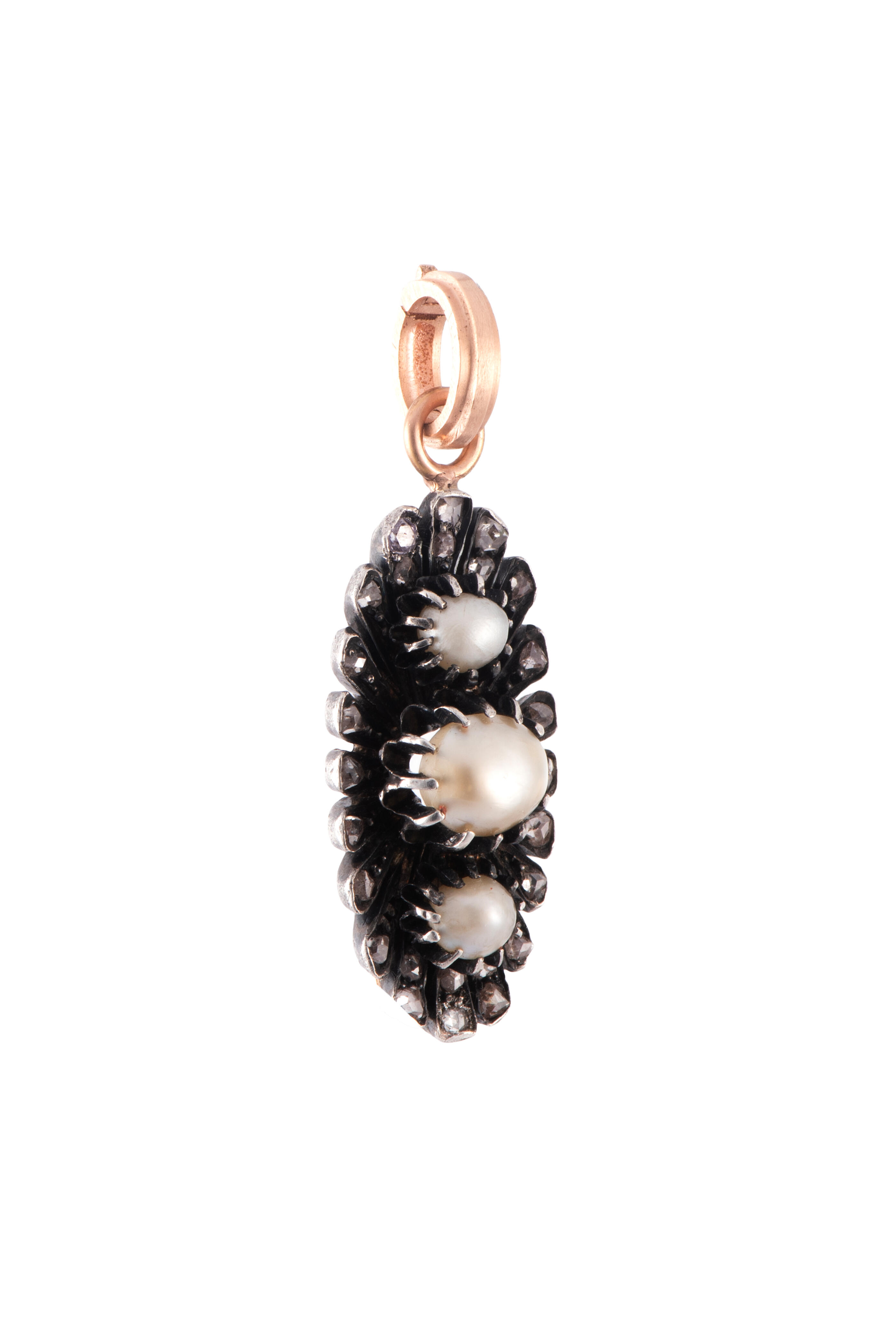 Sylva & Cie Victorina Pearl Component Pendant. 14k rose gold. Natural pearl. Diamond. Victorian inspired design. Prong setting. Hinge bail. Made in the USA.