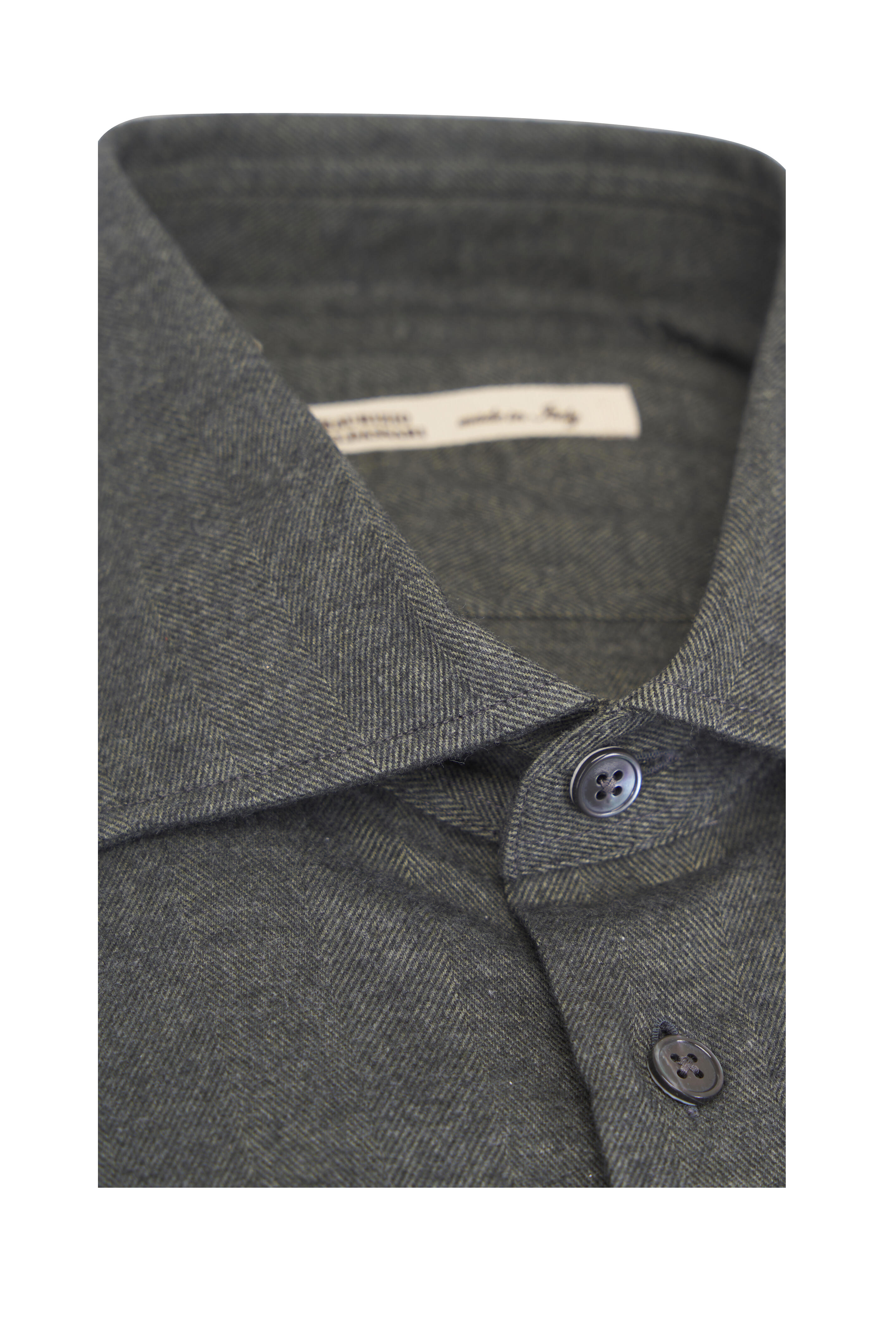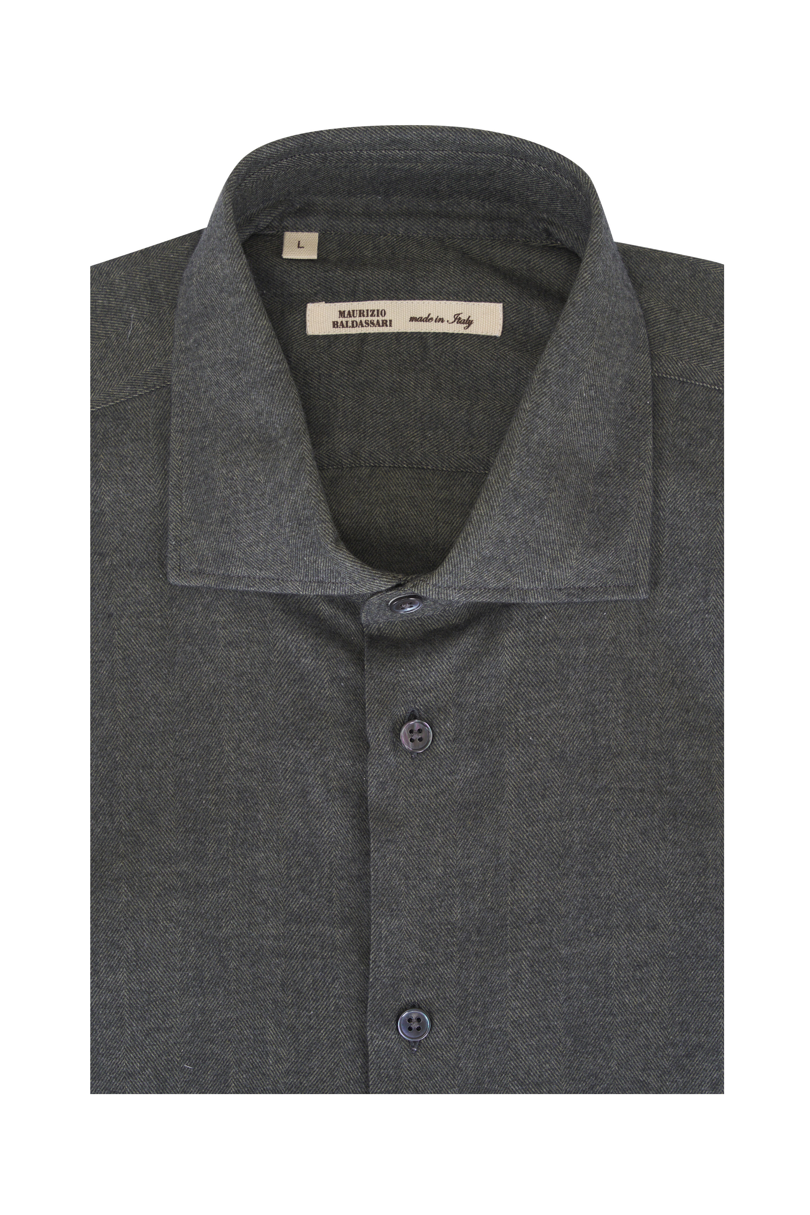 Spread collar. French front button placket. Single button mitered cuffs. Made in Italy. 61% cotton, 39% lyocell. Machine wash.