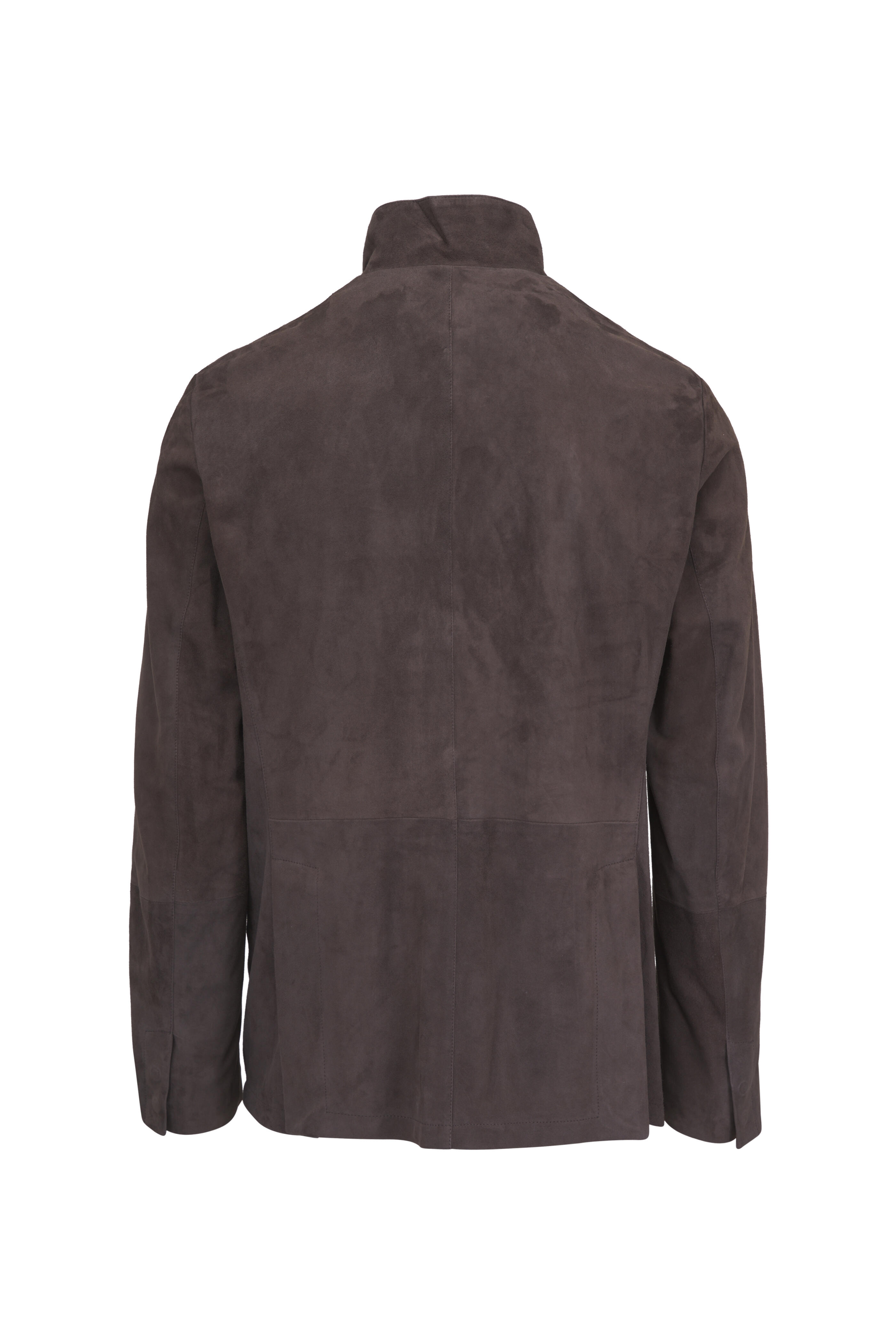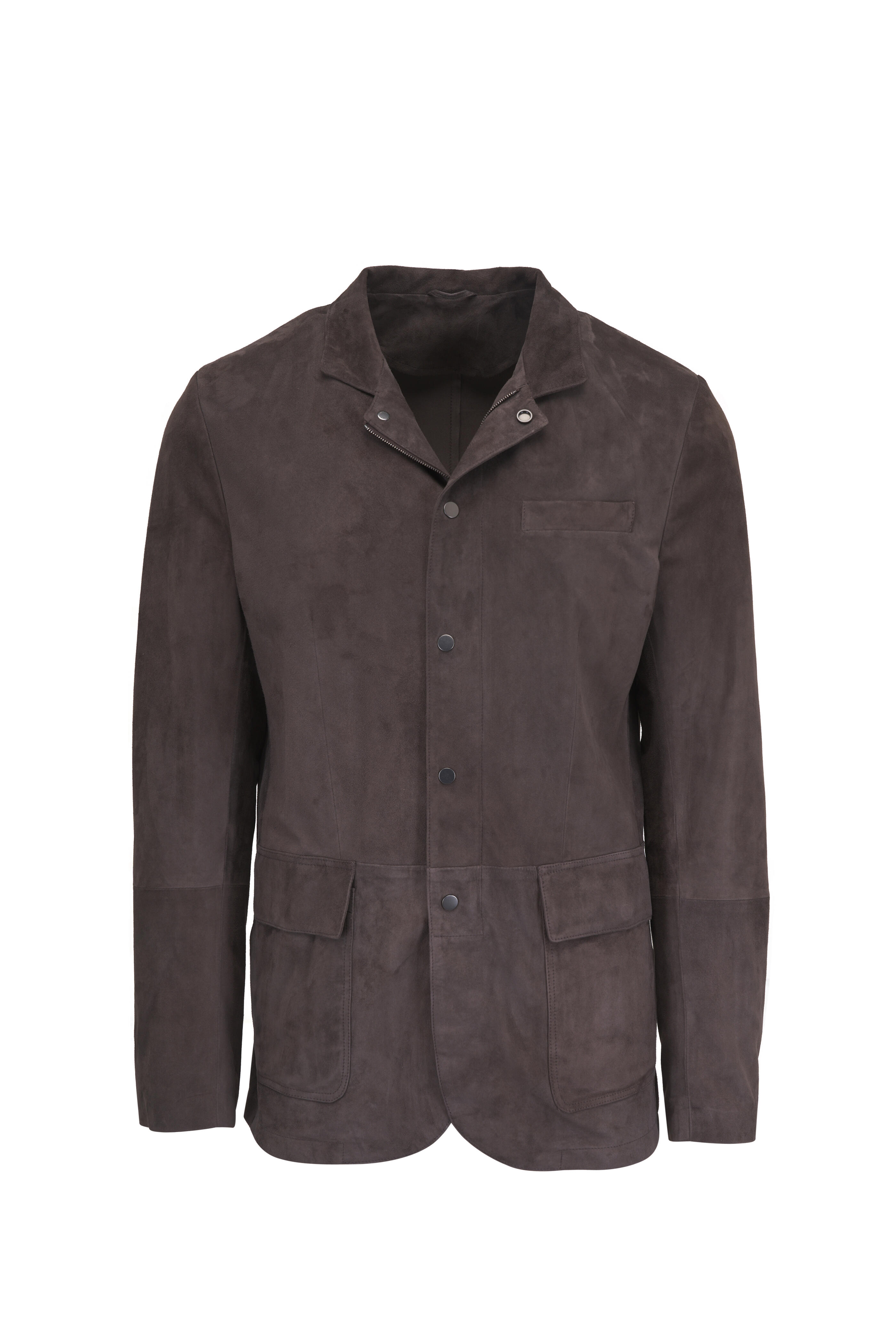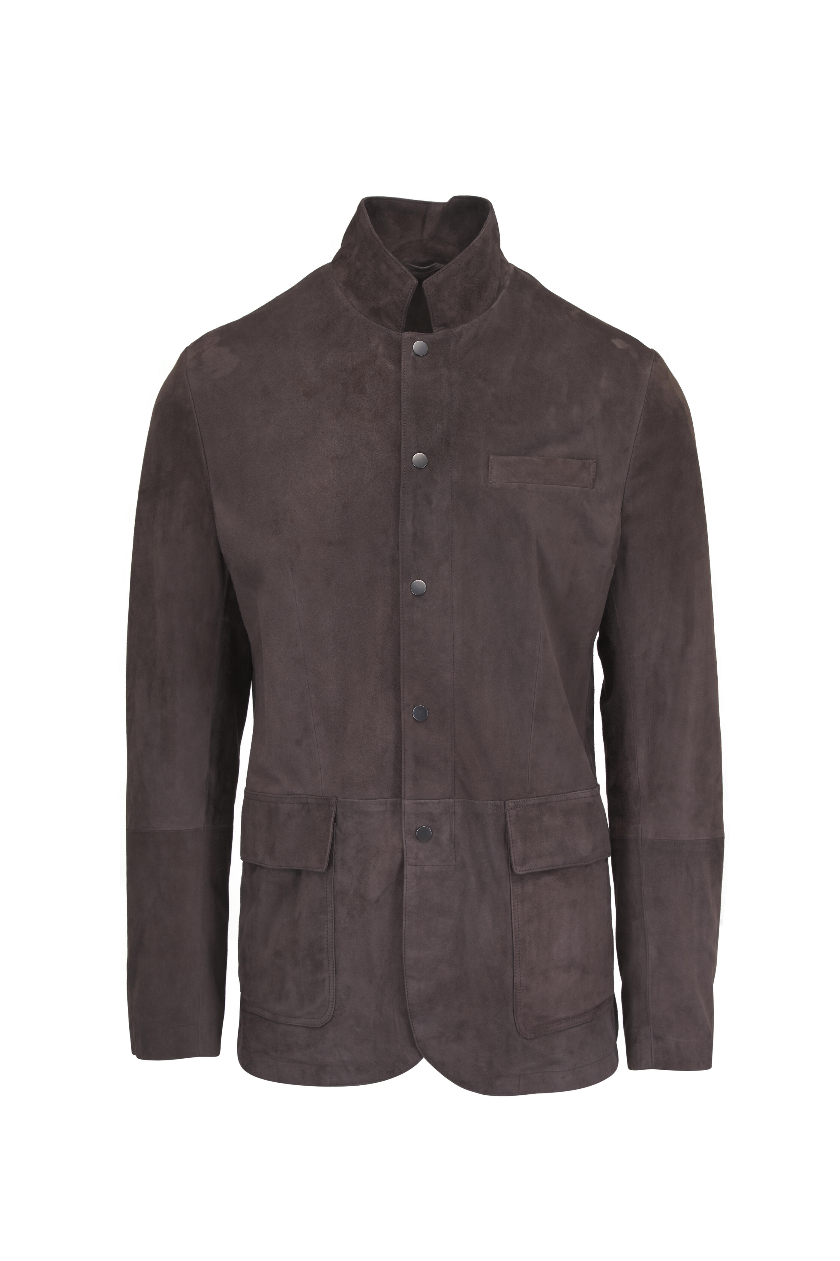 Stand collar. Snap button closure. Lower waist patch pockets. Snap button cuffs. Made in Italy. 100% Leather; unlined. Dry clean.