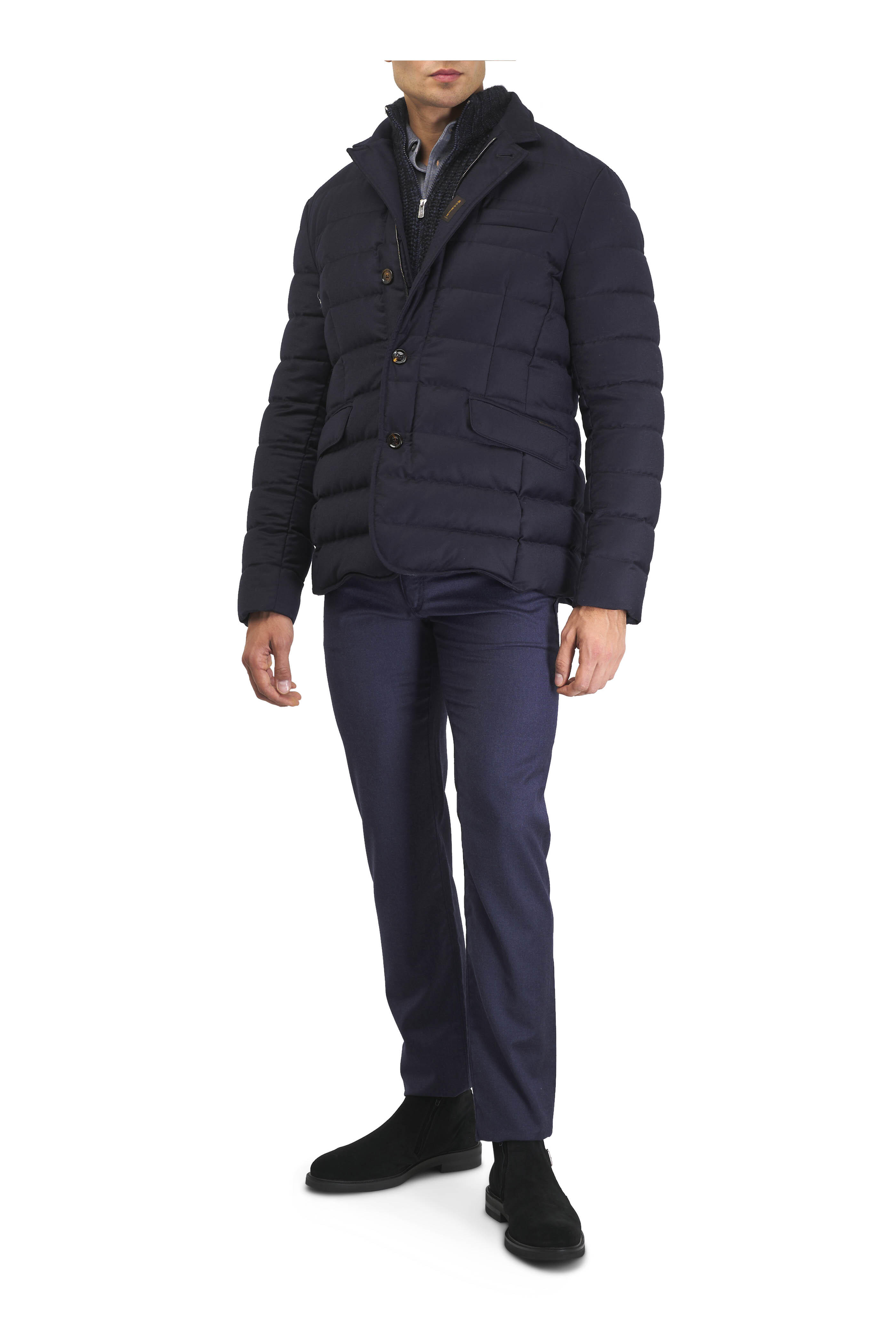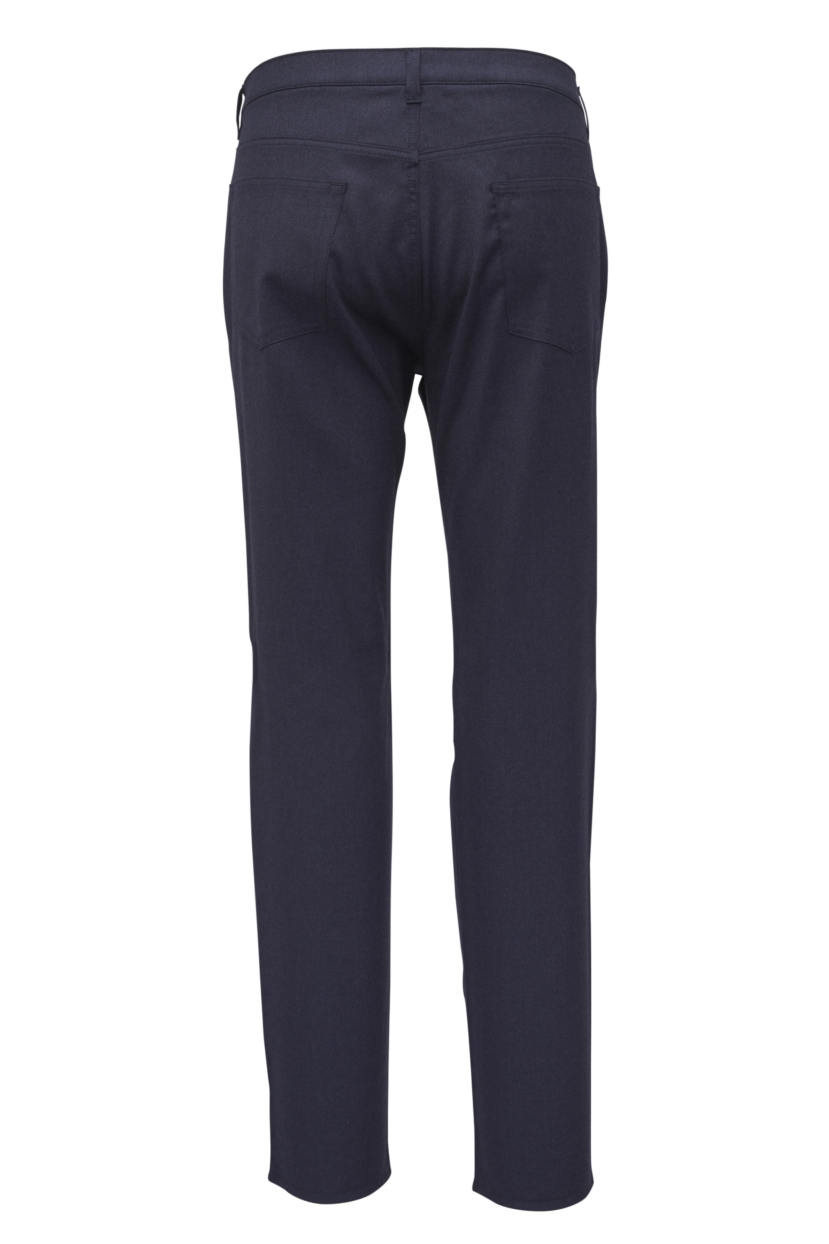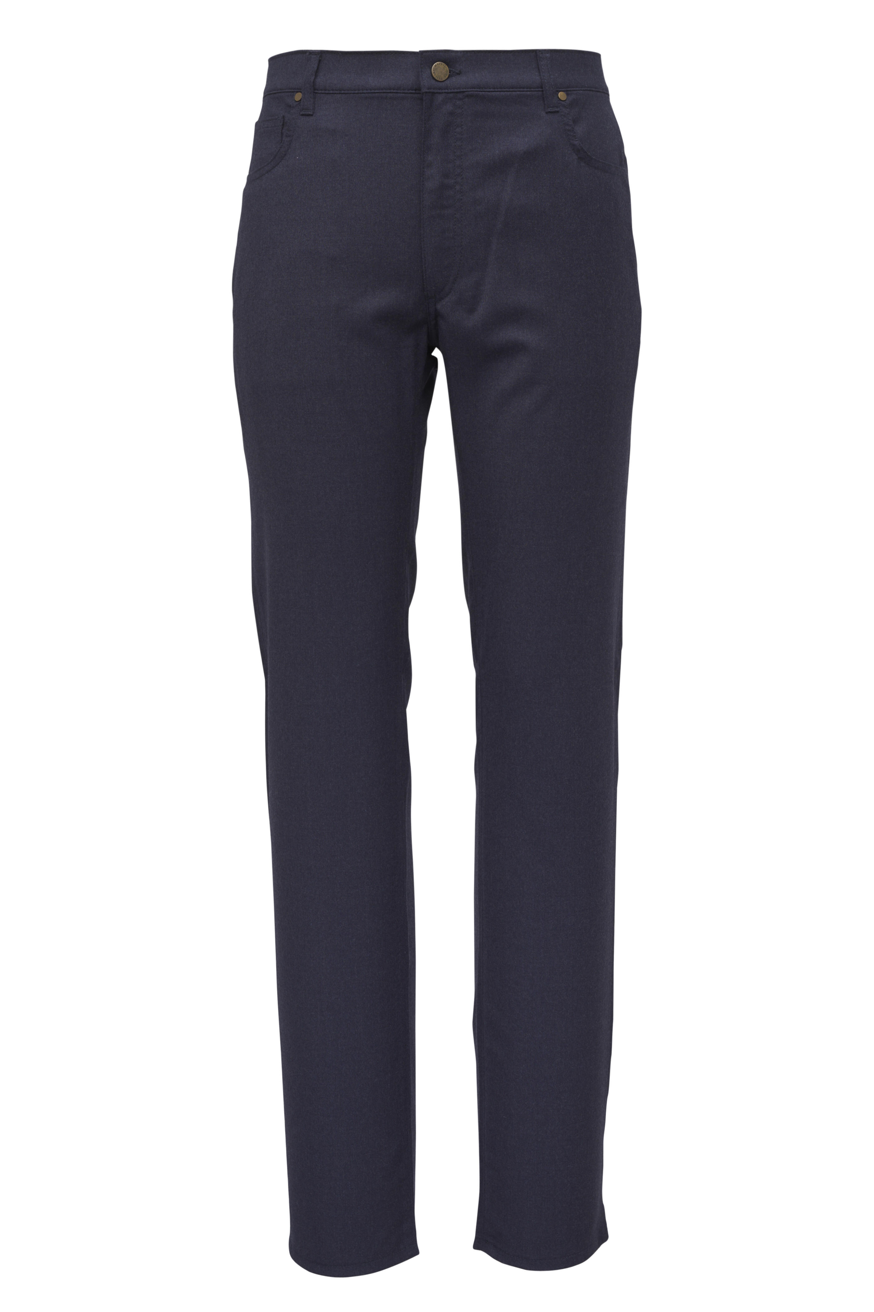 Zip fly with button closure. Banded waist; belt loops. Five pocket styling. Made in Italy. 34" Inseam ( size 36). 99% Virgin wool, 1% elastane. Dry clean.