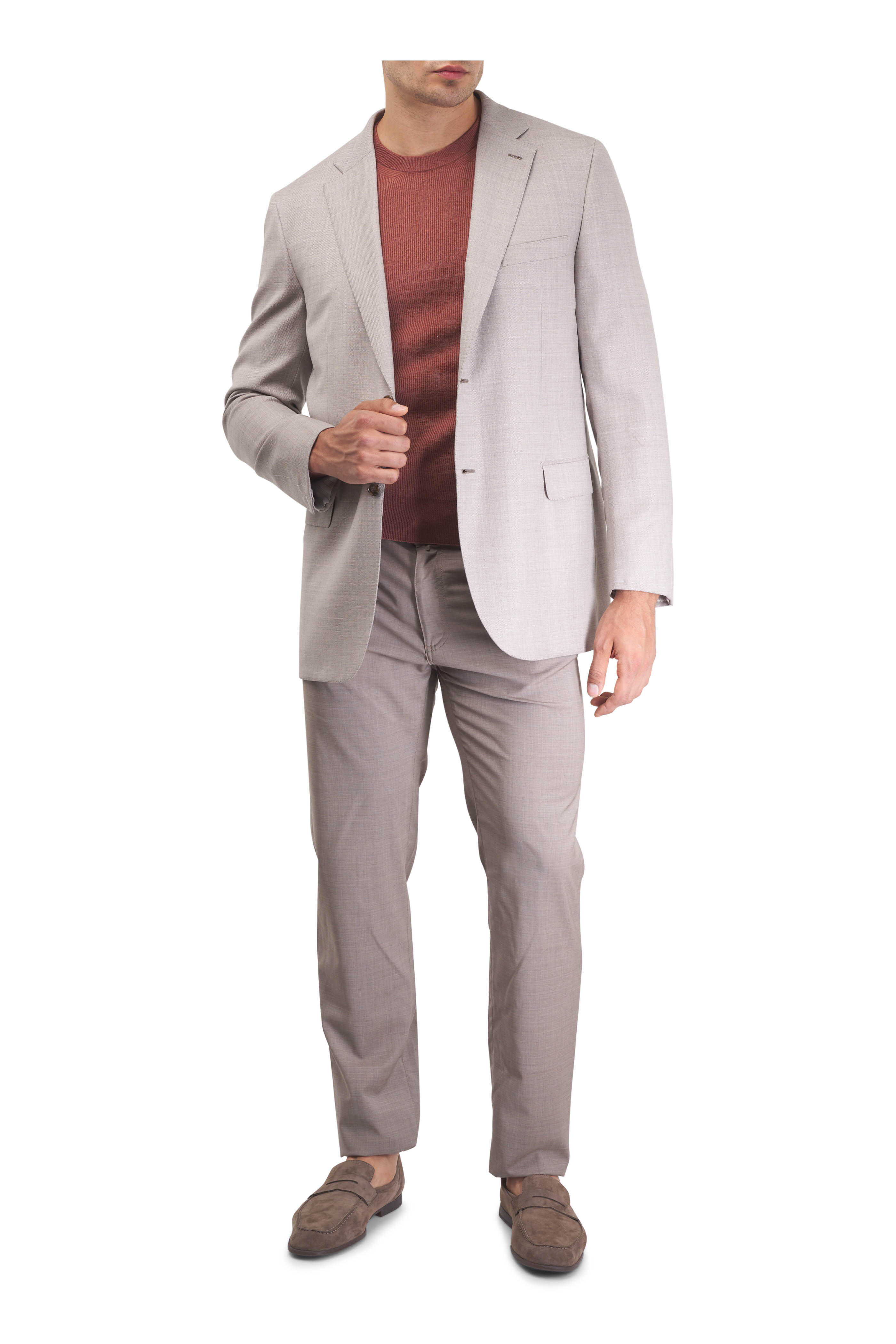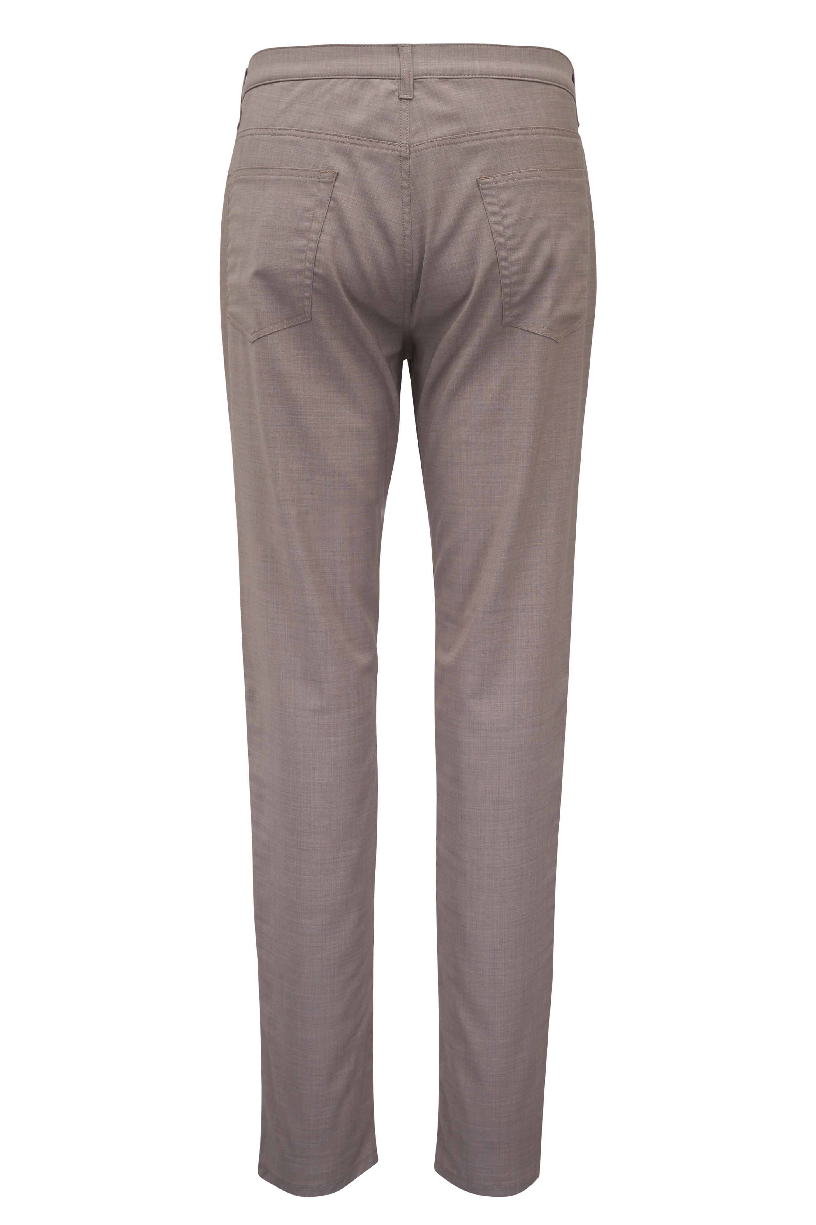 Zip fly; button closure. Banded waist; belt loops. Five pocket styling. Made in Italy. Inseam: 35". 98% virgin wool, 2% elastane. Dry clean.