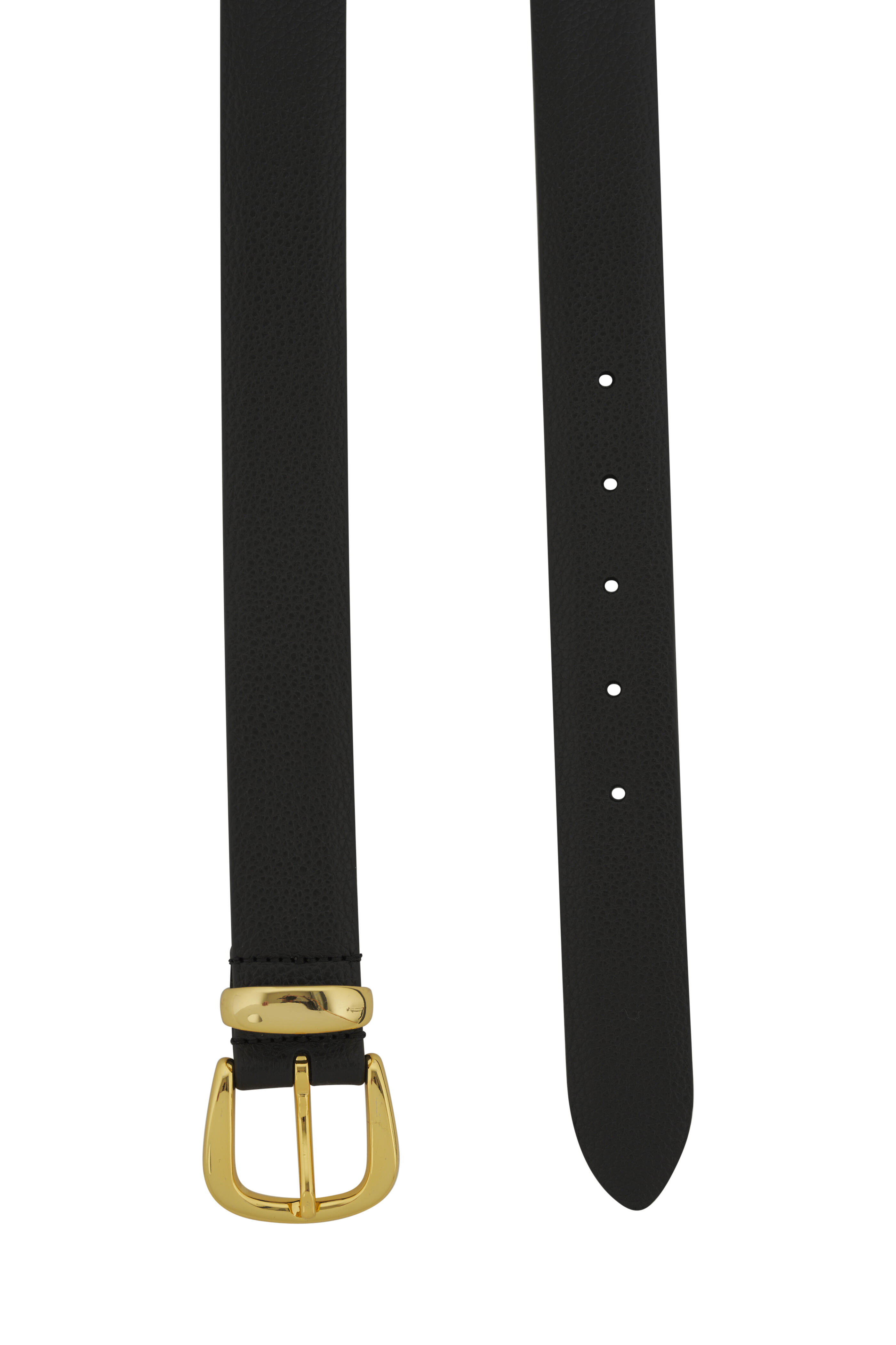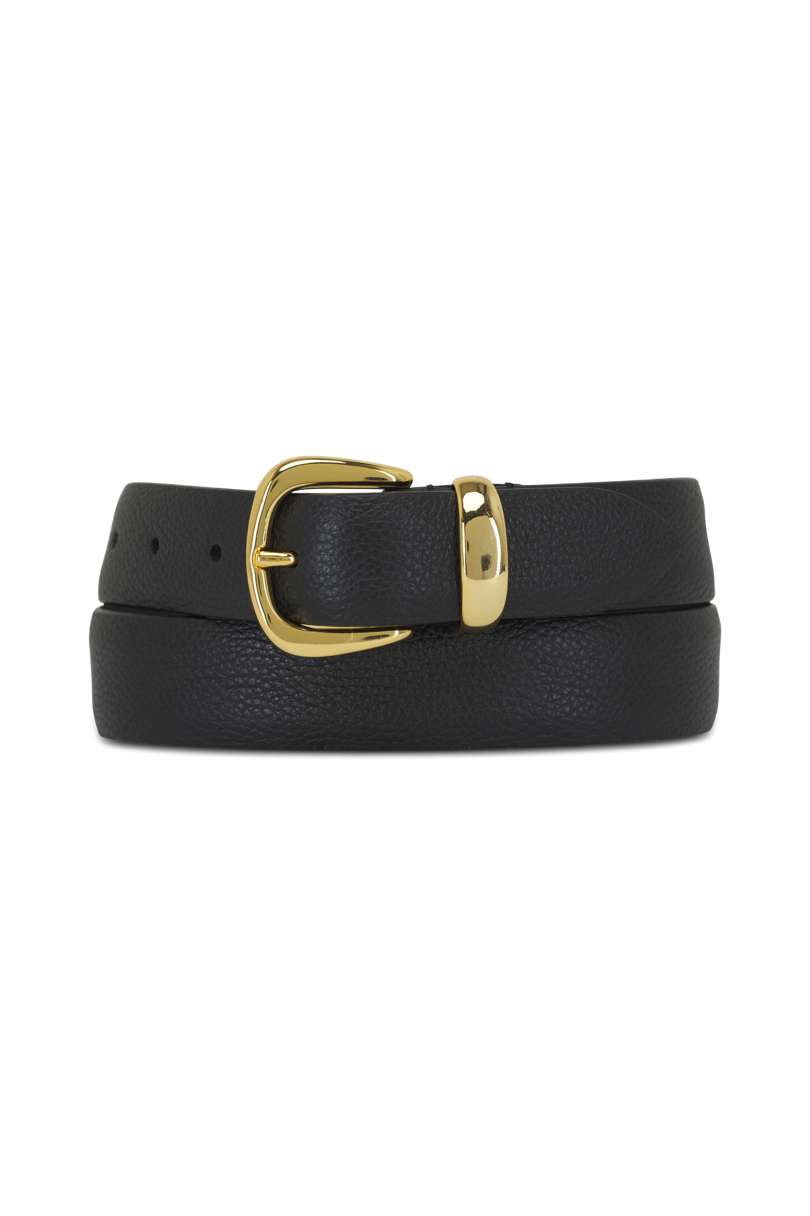 Grained leather. Single belt loop keeper. Gold-toned solid brass hardware. Tapered tip. Made in Italy. Approximately 30mm width.