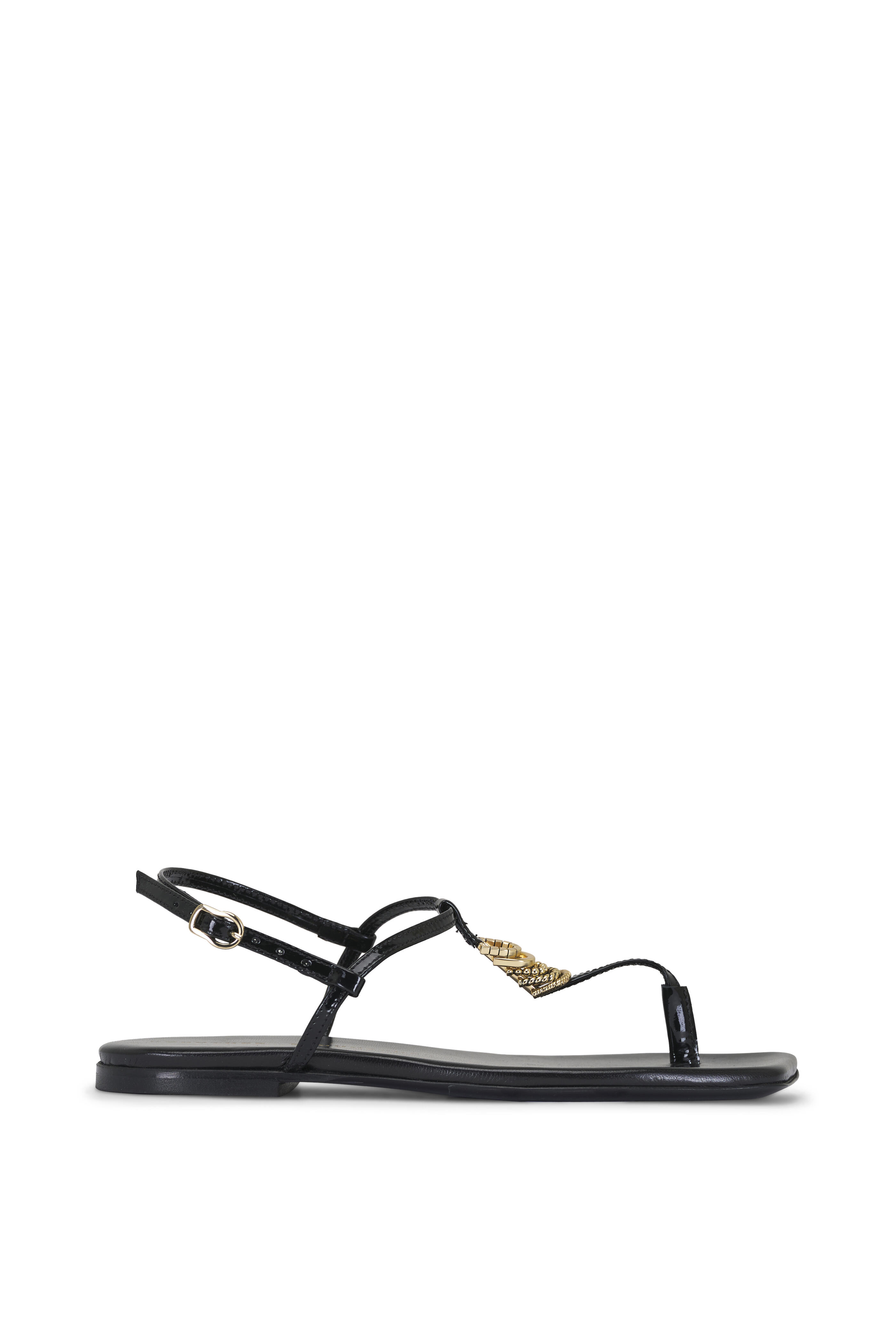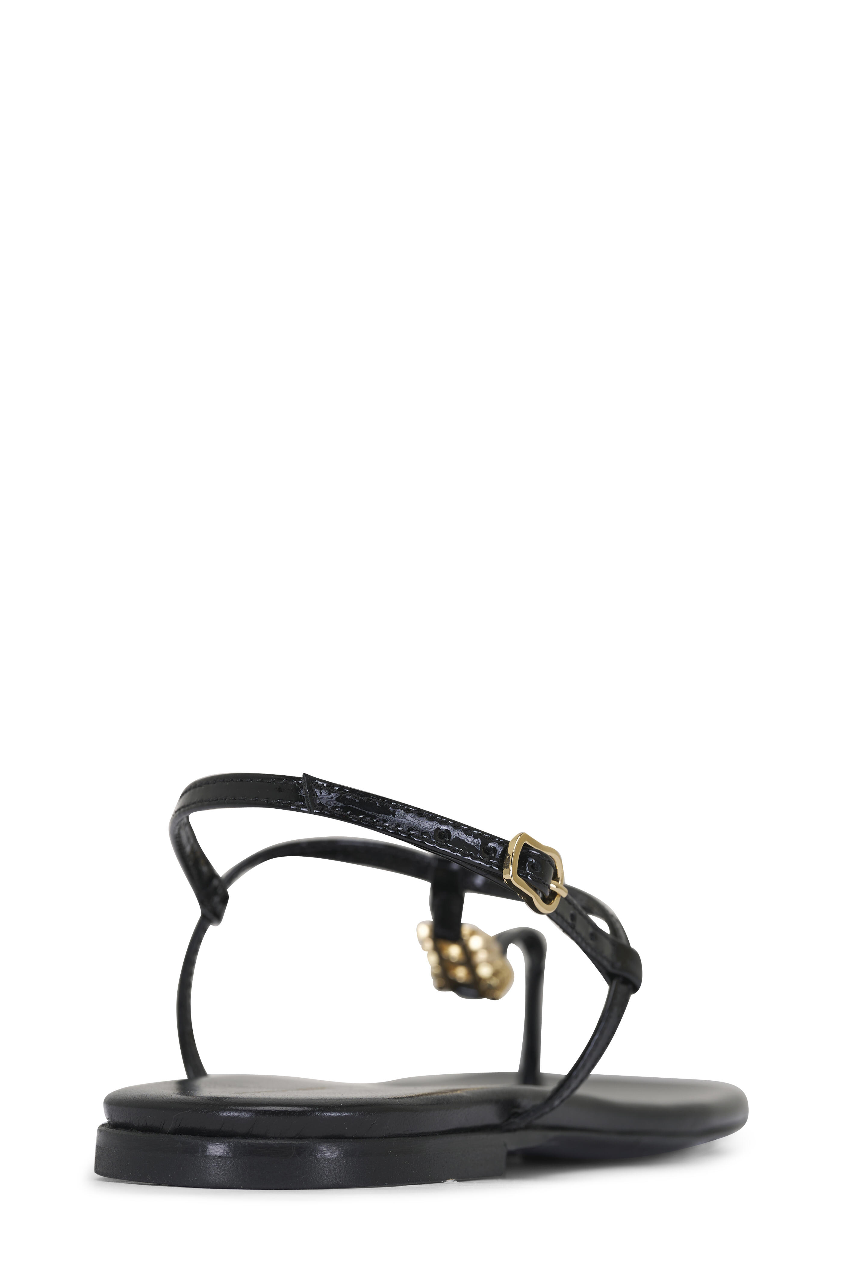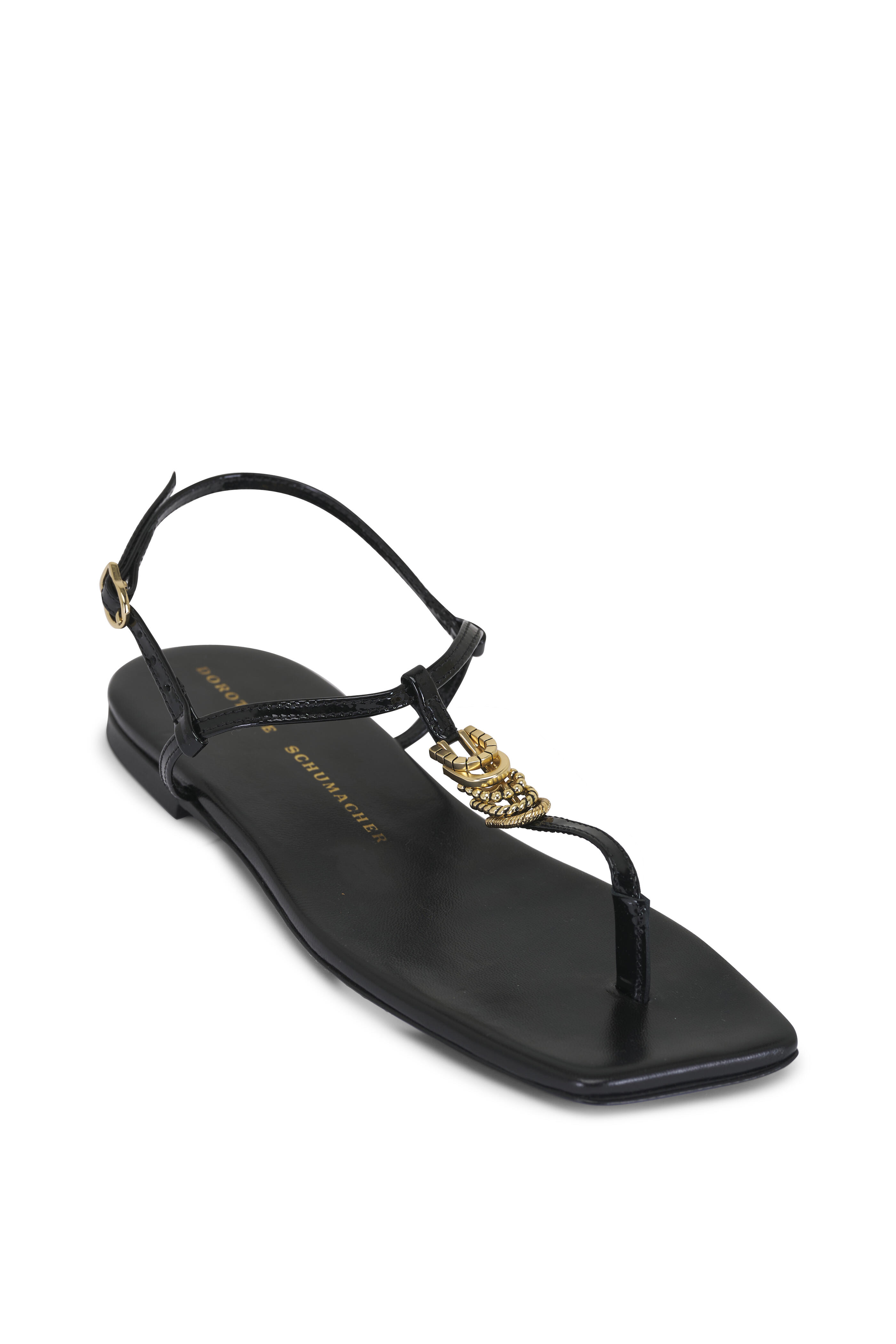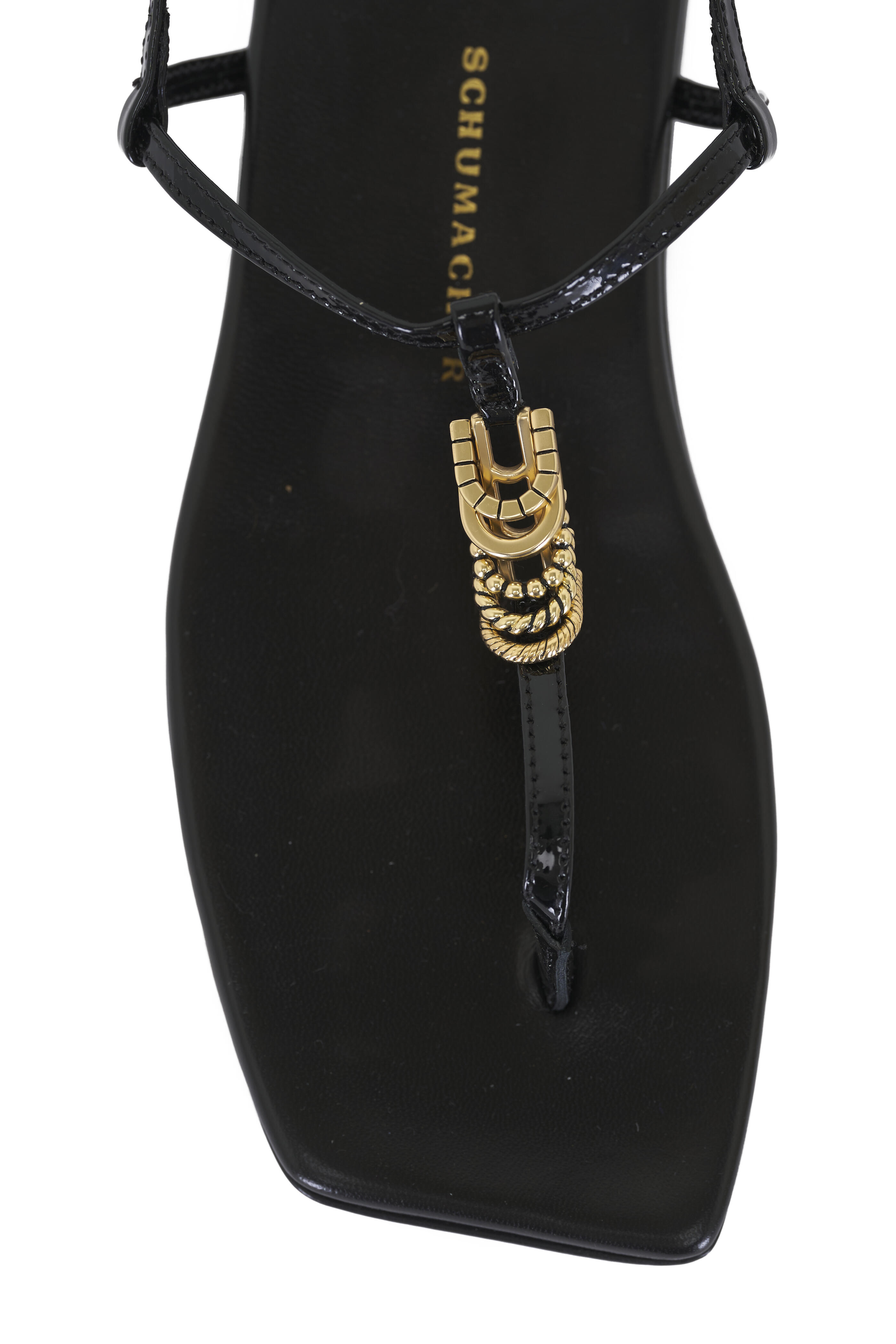 Leather upper. Open, square toe, thong strap. Adjustable buckle ankle strap; slip on style. Padded leather insole. Leather sole. D-ring charm details. Made in Portugal.