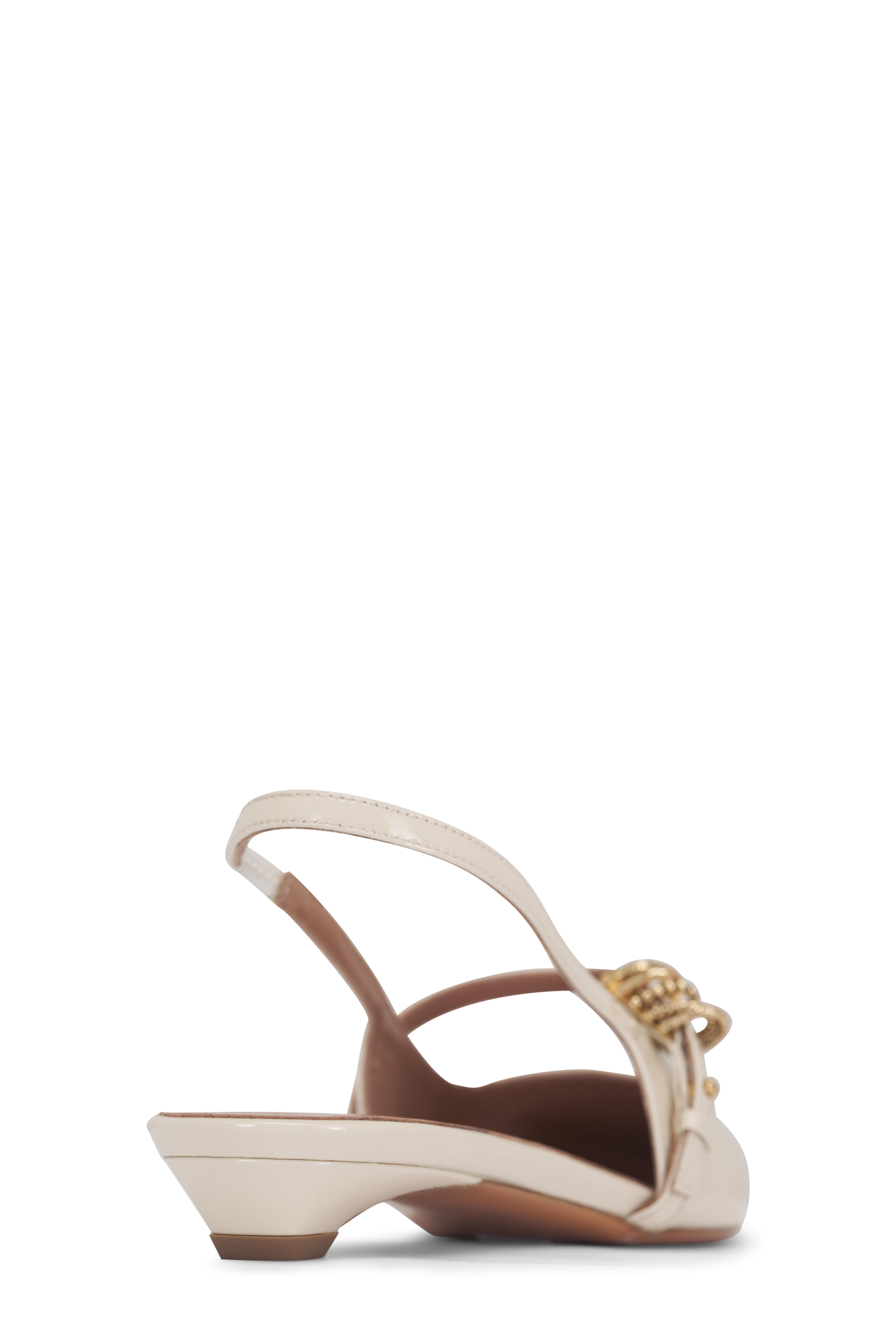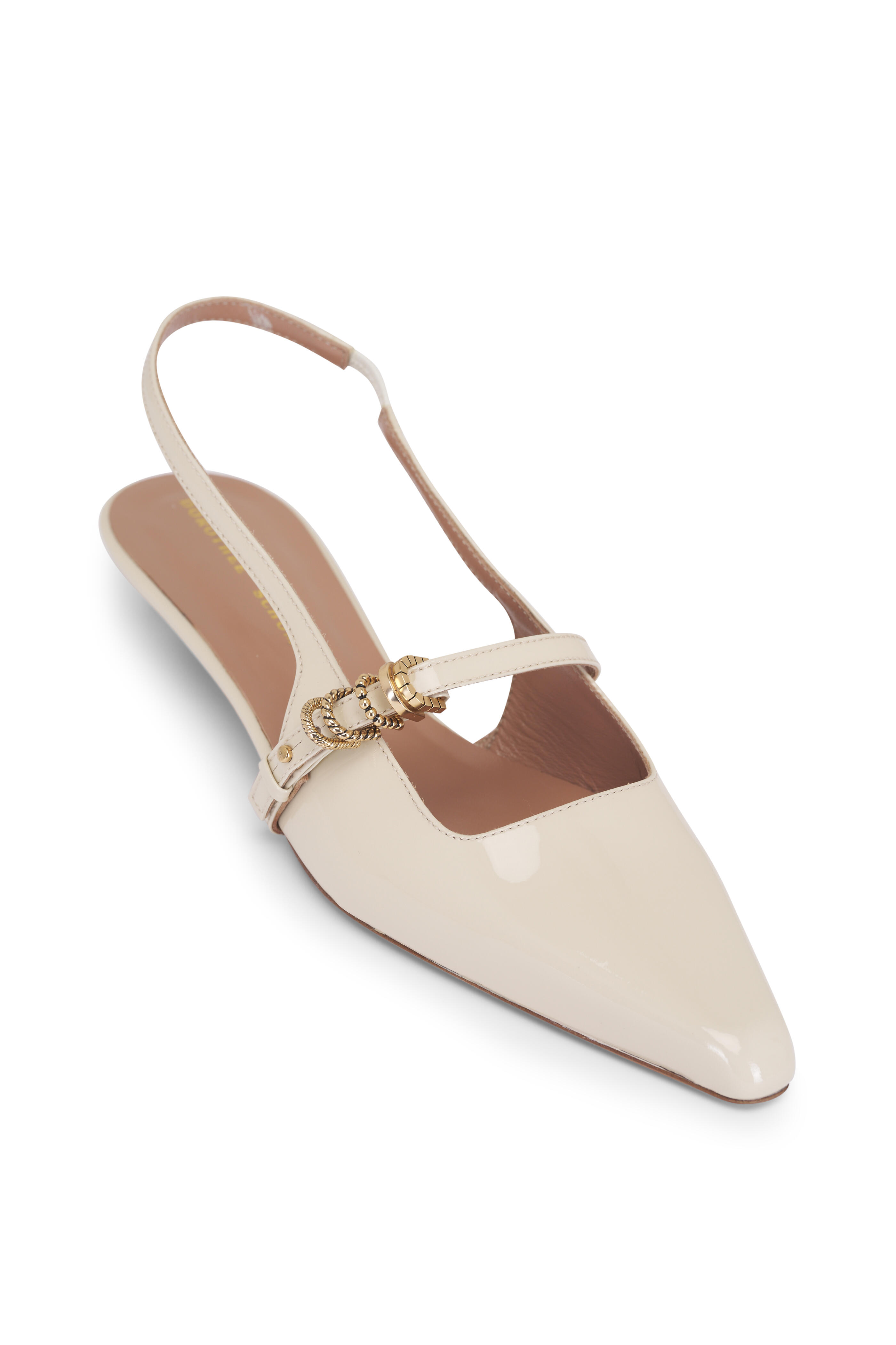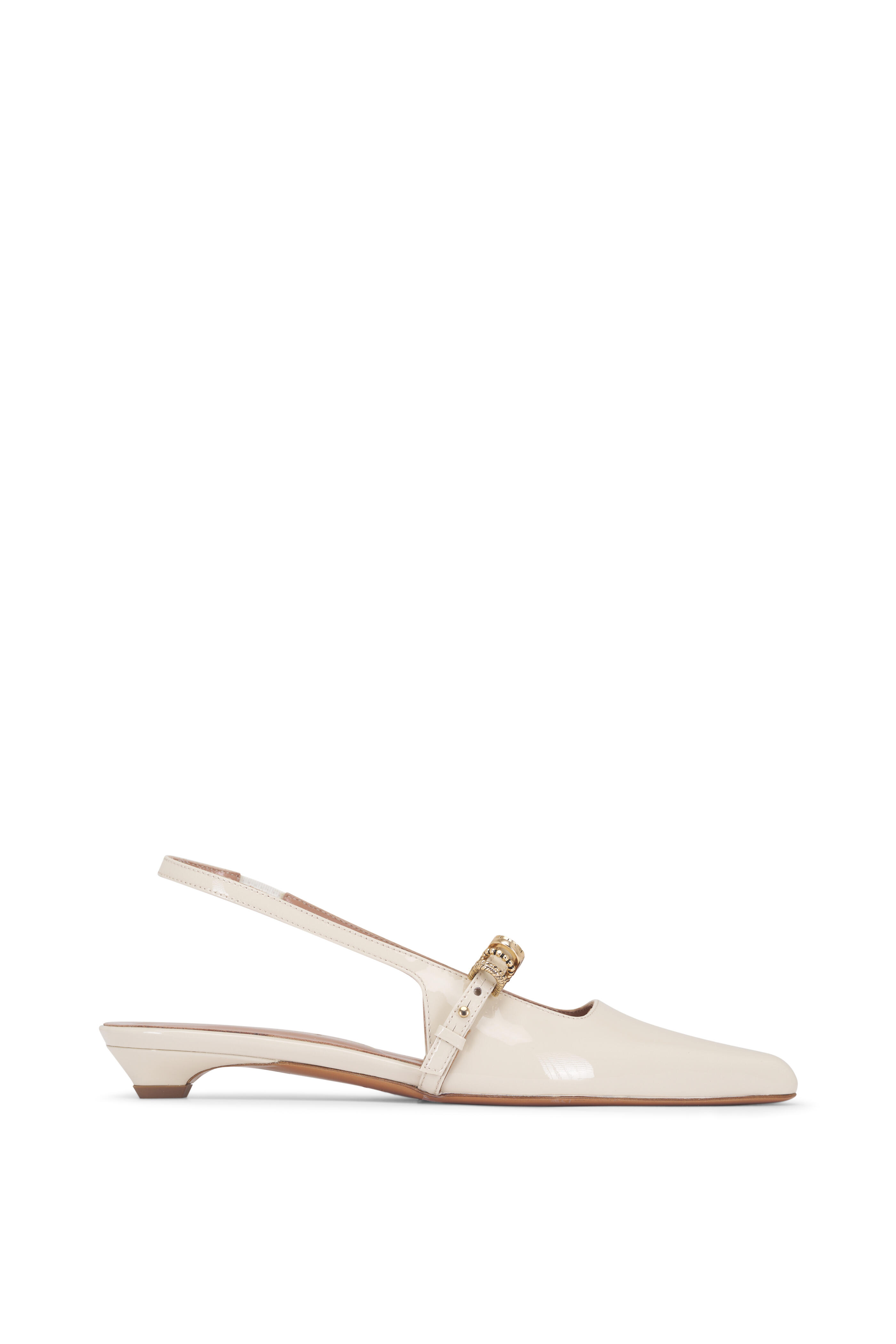 Patent leather upper. Pointed toe with chisel square tip. Slingback, elasticated strap. Leather lining and insole. Leather sole. Strap embellished with mixed texture D-rings. Imported. Heel measurement: 15mm.
