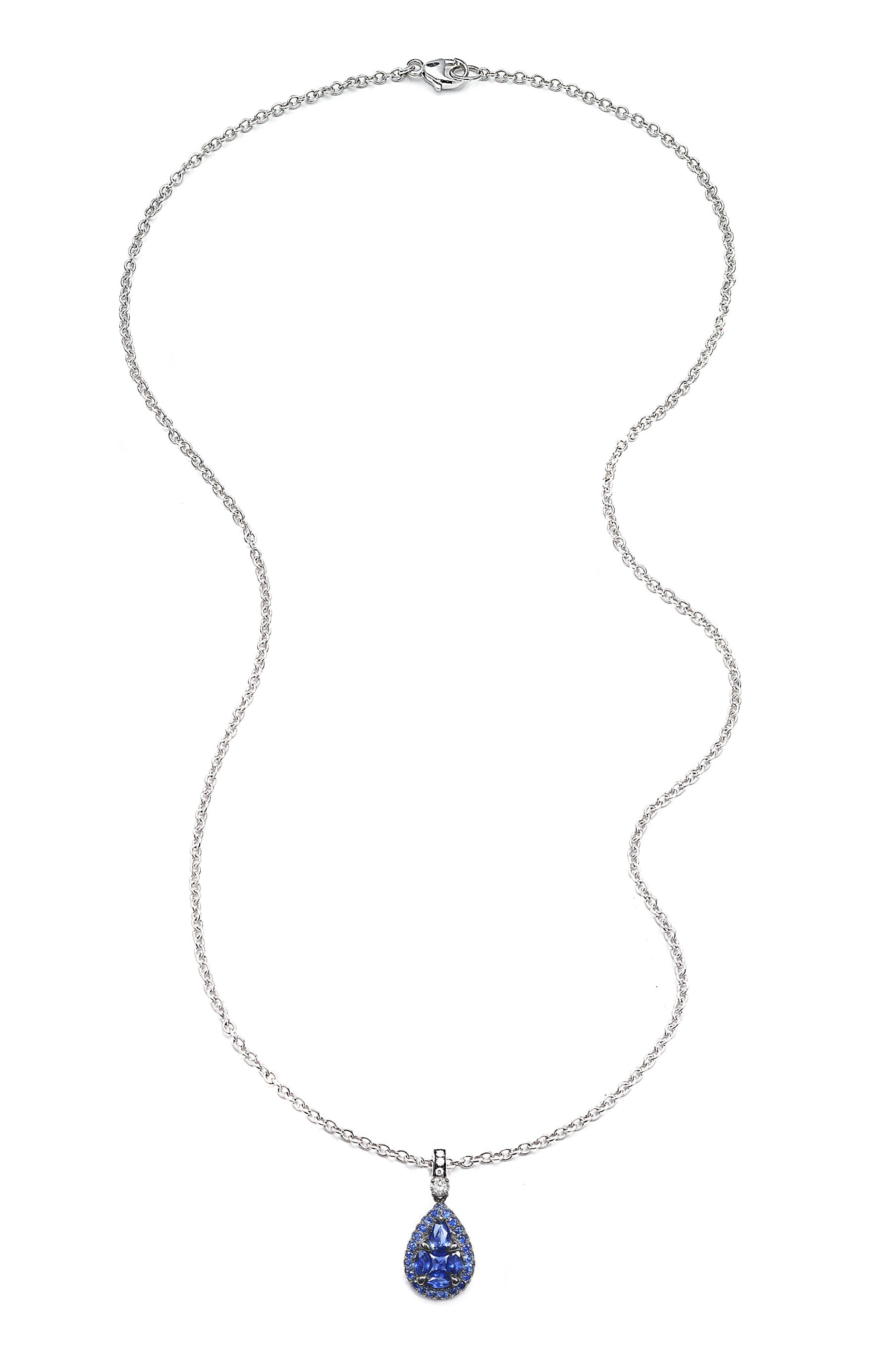 18k white gold. Black rhodium. .084 carat white diamonds. 1.007 carat blue sapphire.