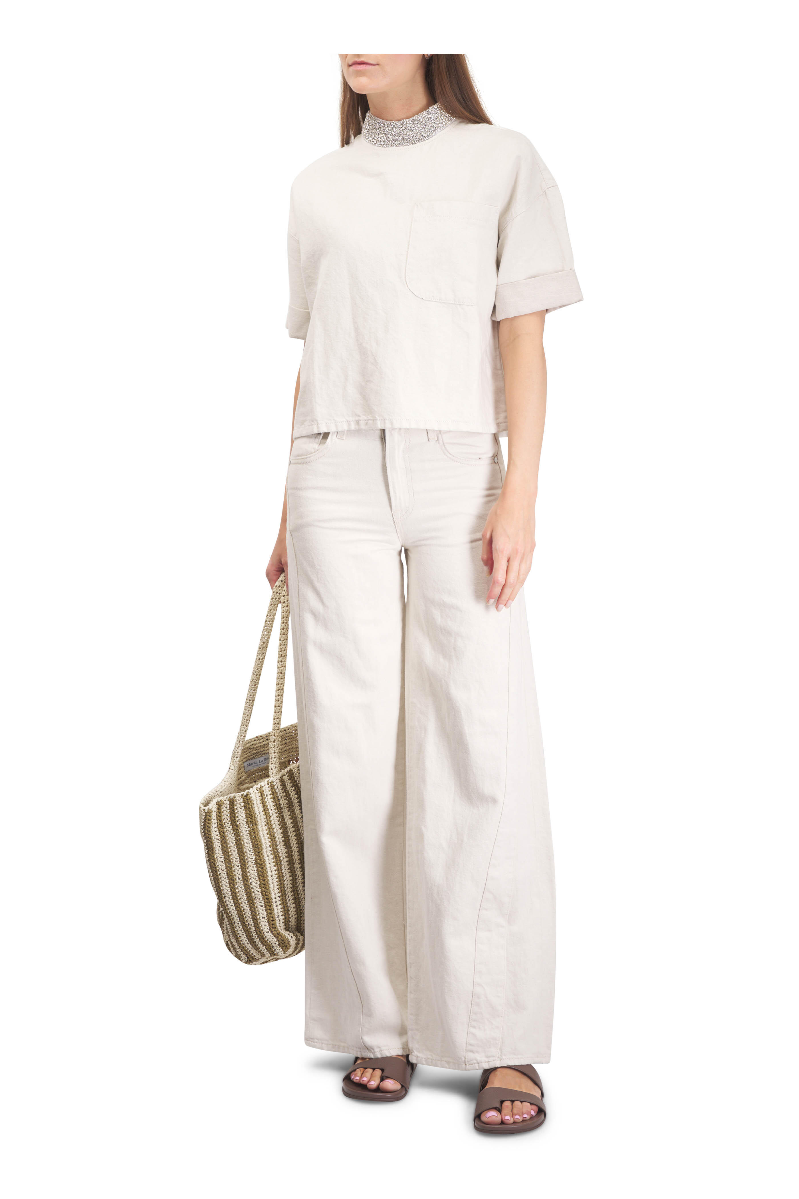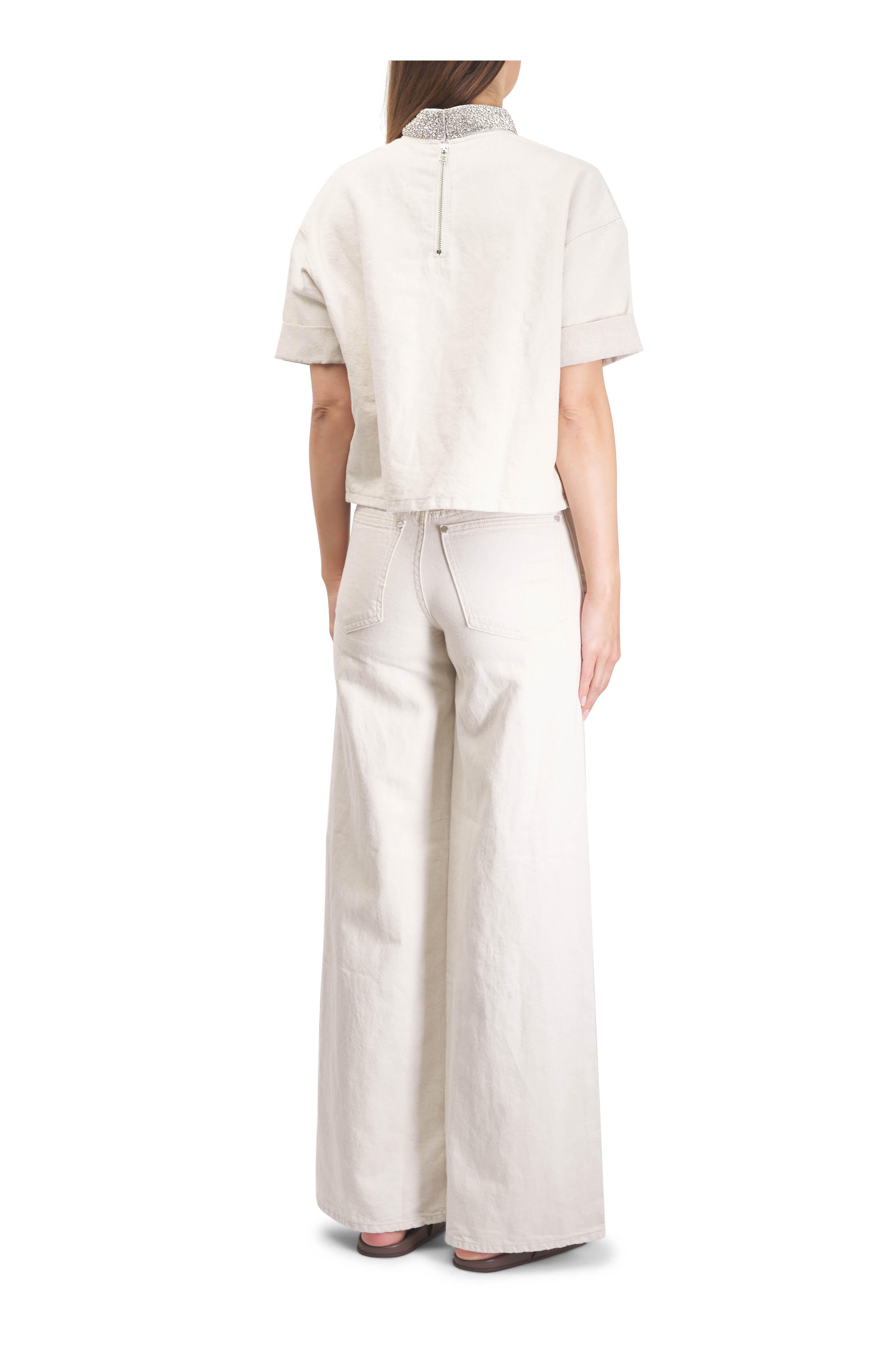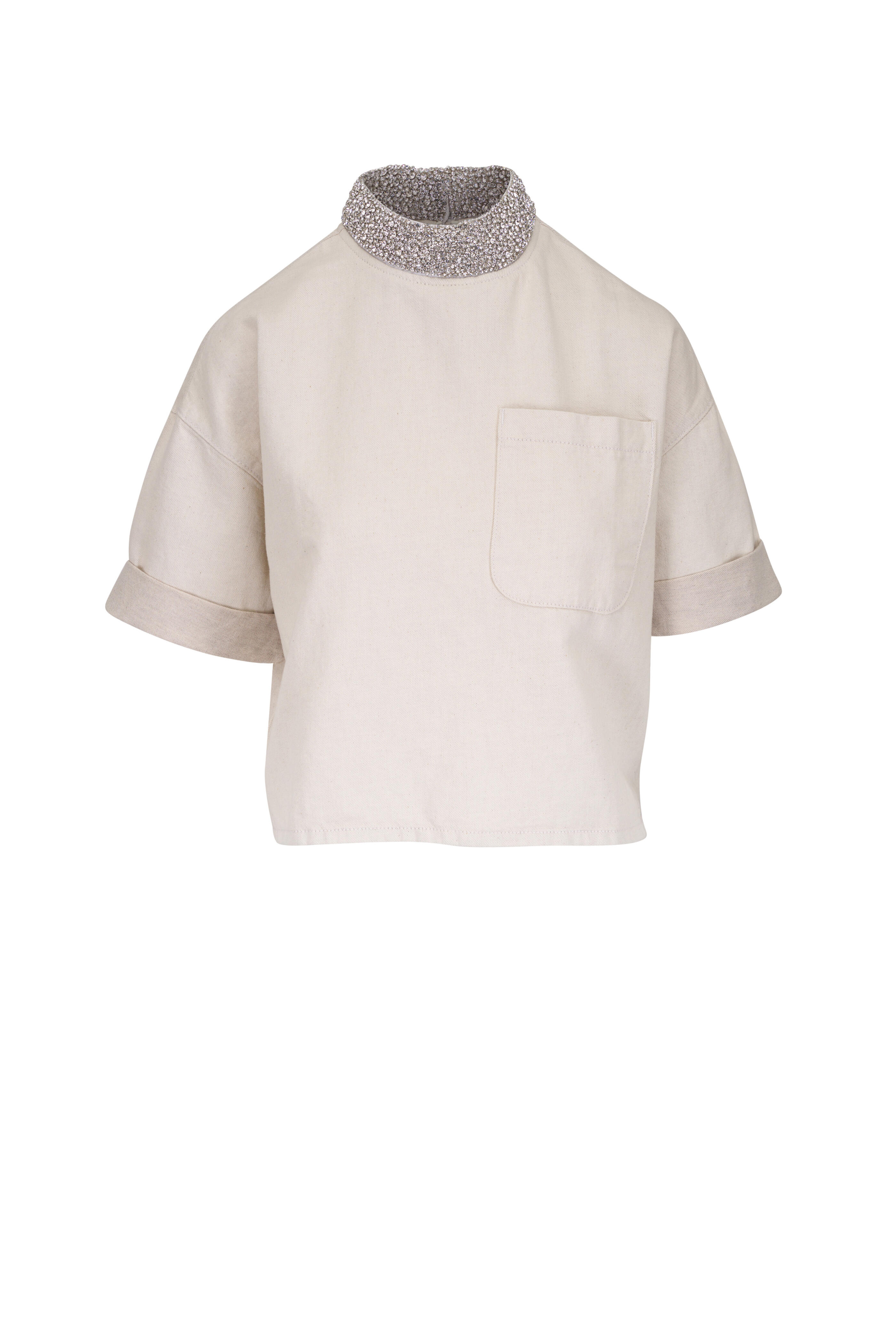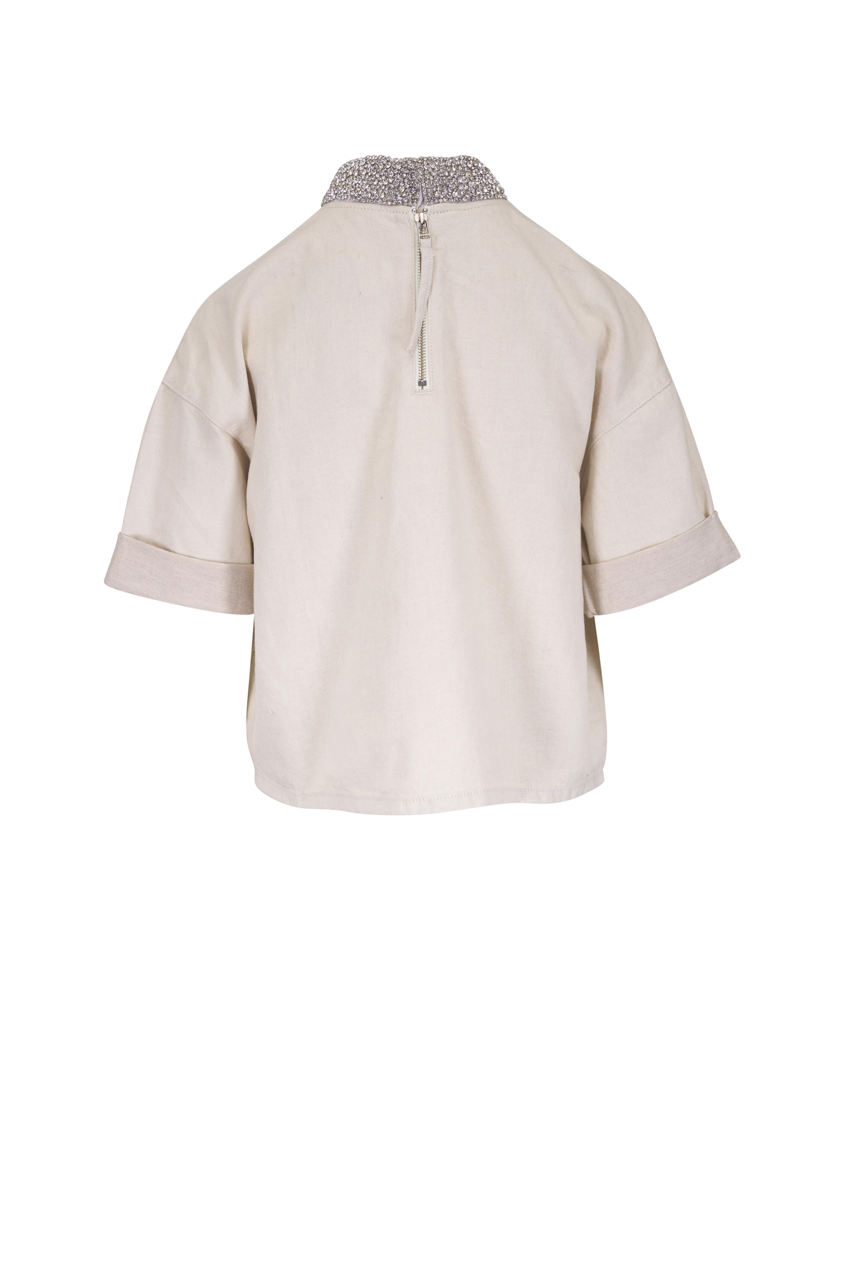 Stand collar; crystal embellished. Chest patch pocket. Back zip. Cuffed short sleeves. Made in USA. 70% cotton, 30% linen. Dry clean.