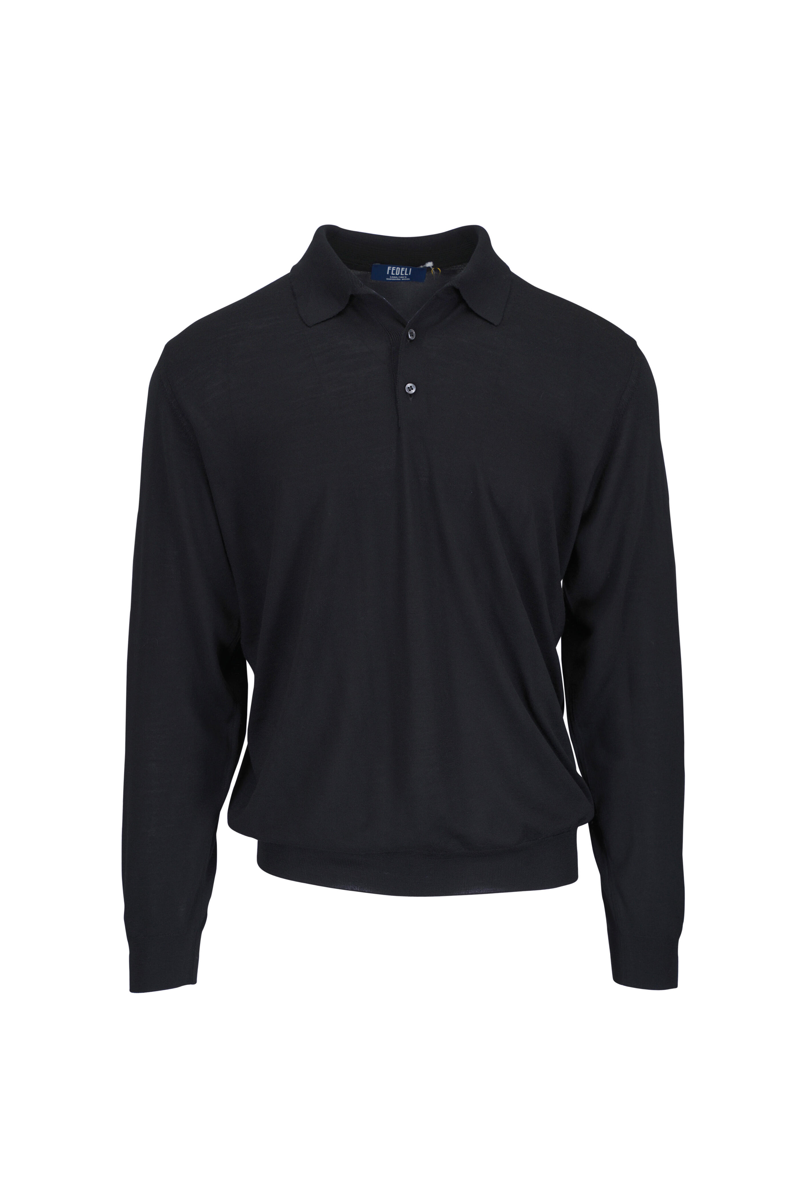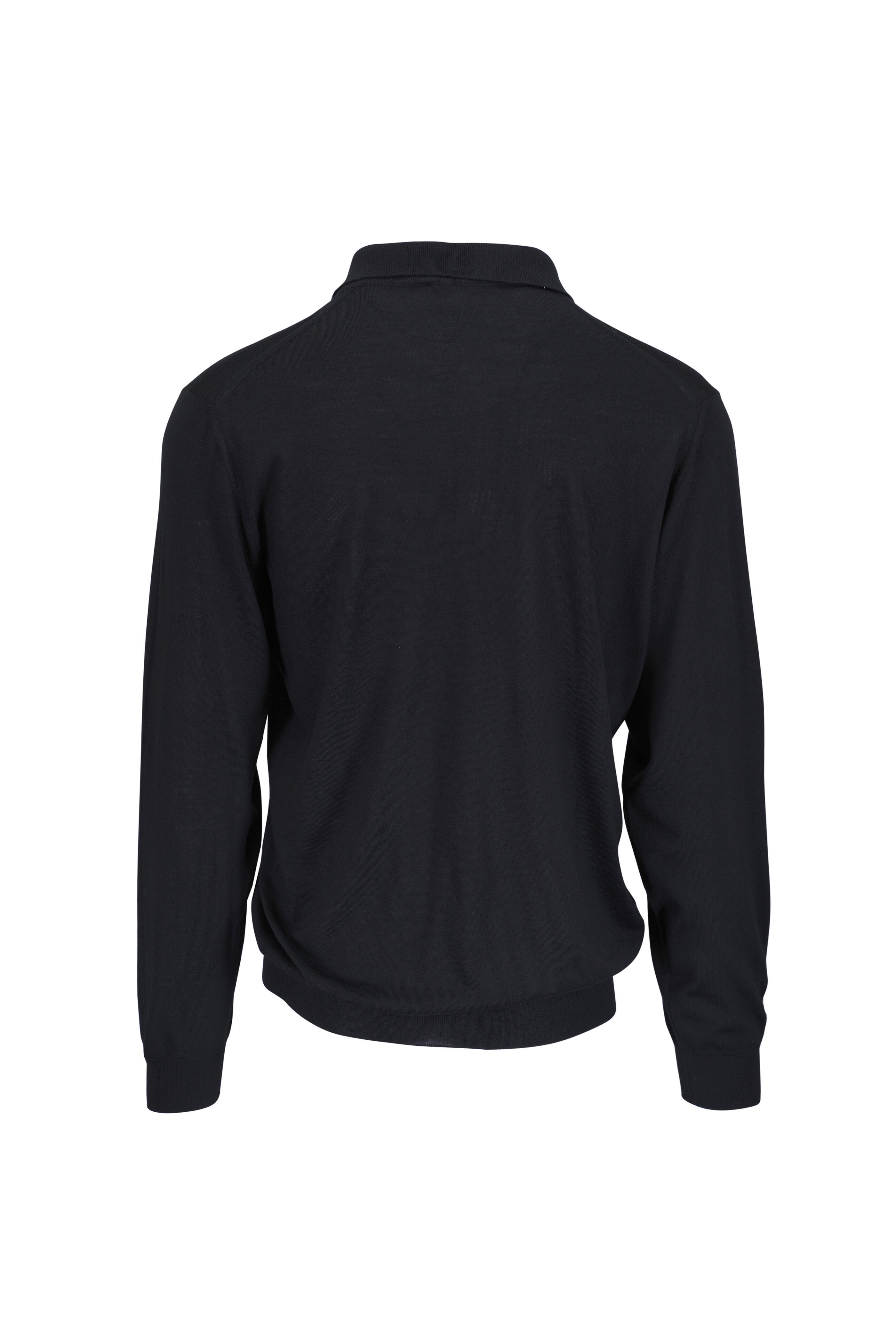 Spread collar. Three button placket. Pullover style. Ribbed trims. Straight hem. Made in Italy. Shoulder to hem 29" (size L). 100% Virgin wool. Hand wash.