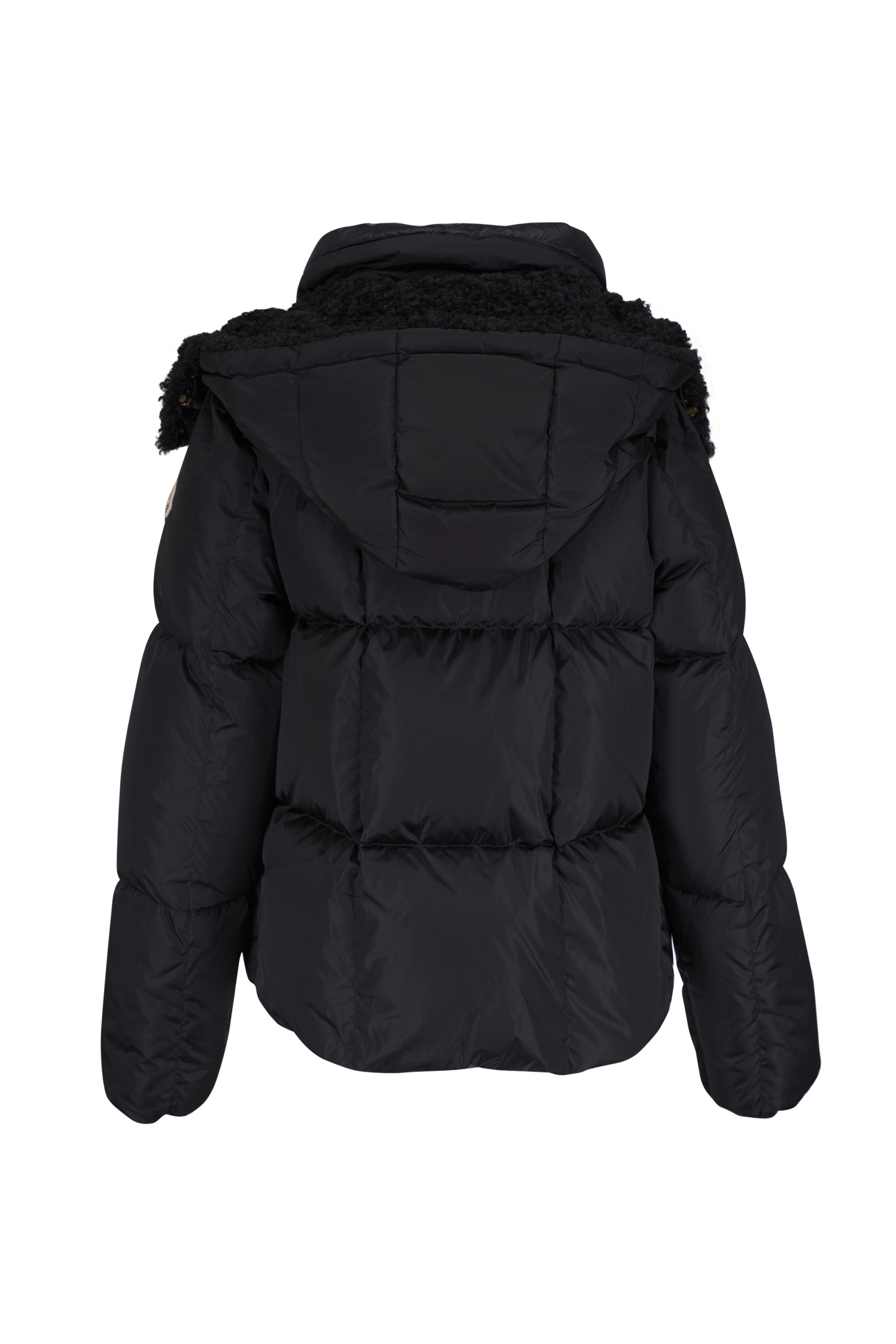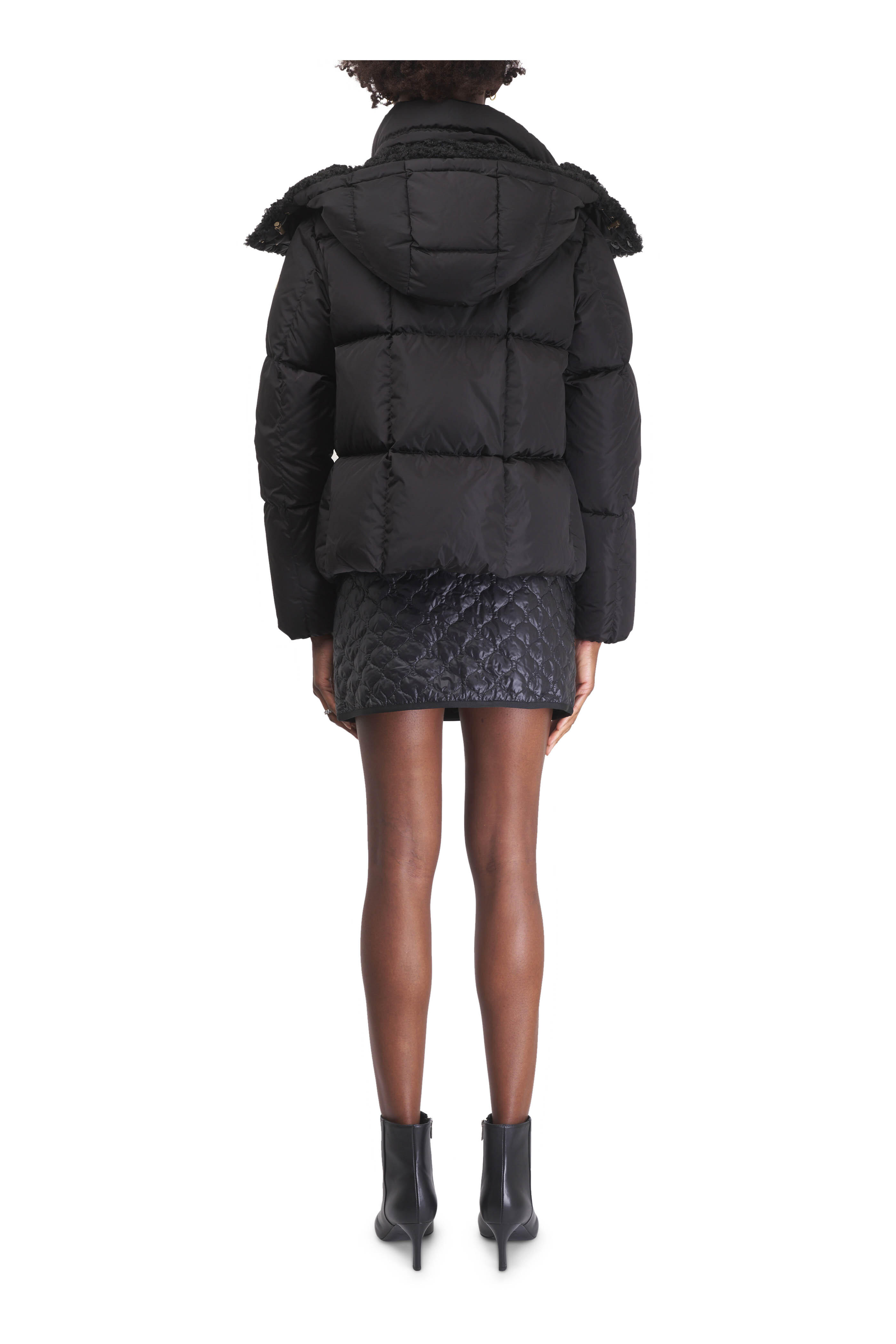 Stand collar; detachable hood with snap buttons, adjustable with elastic drawstring fastening. Front two-way zip closure; concealed front button placket. Double pocket with zipper closure. Elastic cuffs. Straight hem. Imported. Shoulder to hem 23" (size 8). 100% polyamide; lined; Fill: 90% down, 10% feather. Hand wash.