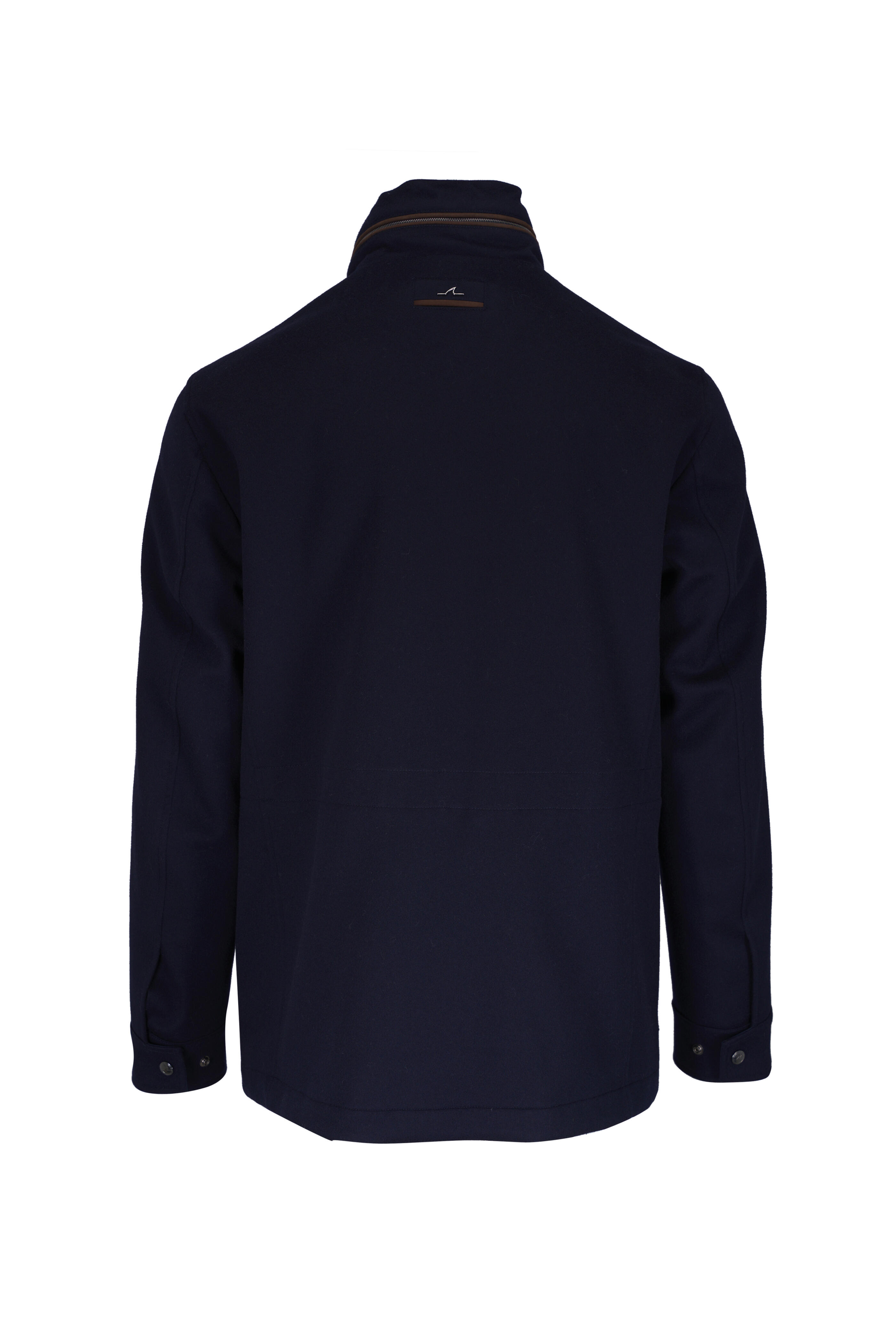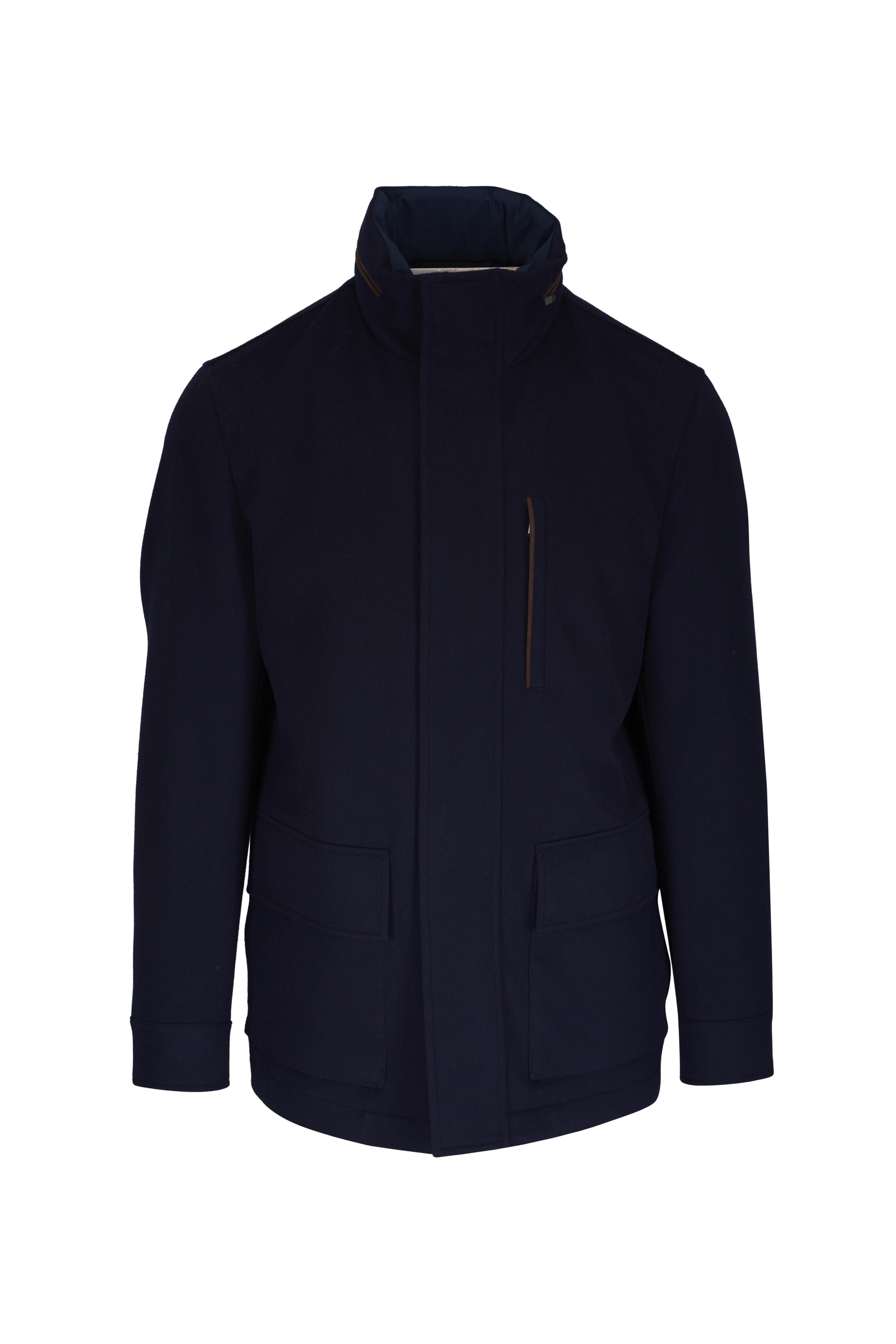 Stand collar; stowaway hood. Concealed two-way front zip, snap button placket. Lower patch pockets; side slip pockets; chest zip pocket. Internal waist drawcord. Single button cuffs. Made in Italy. 100% cashmere. Dry clean.