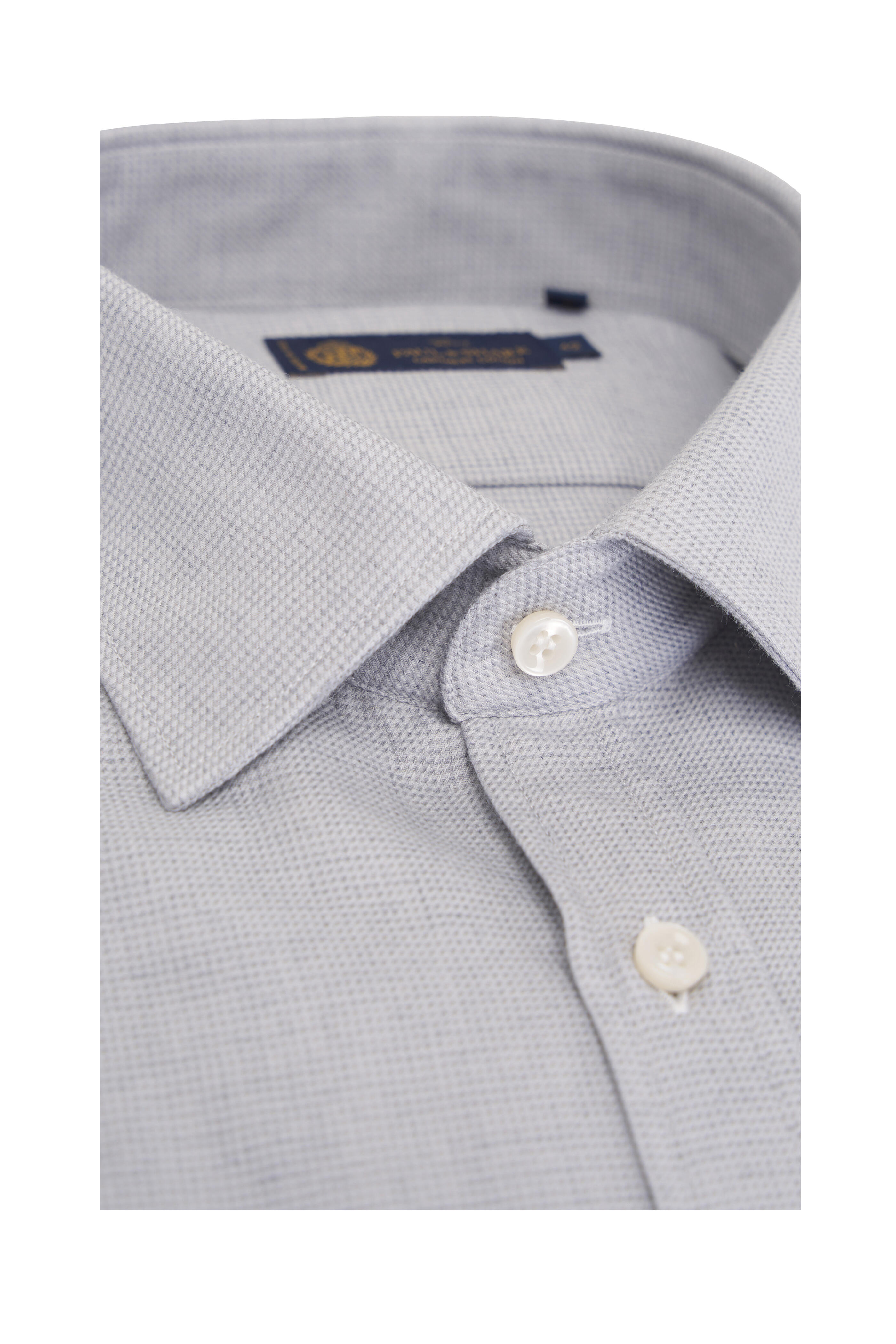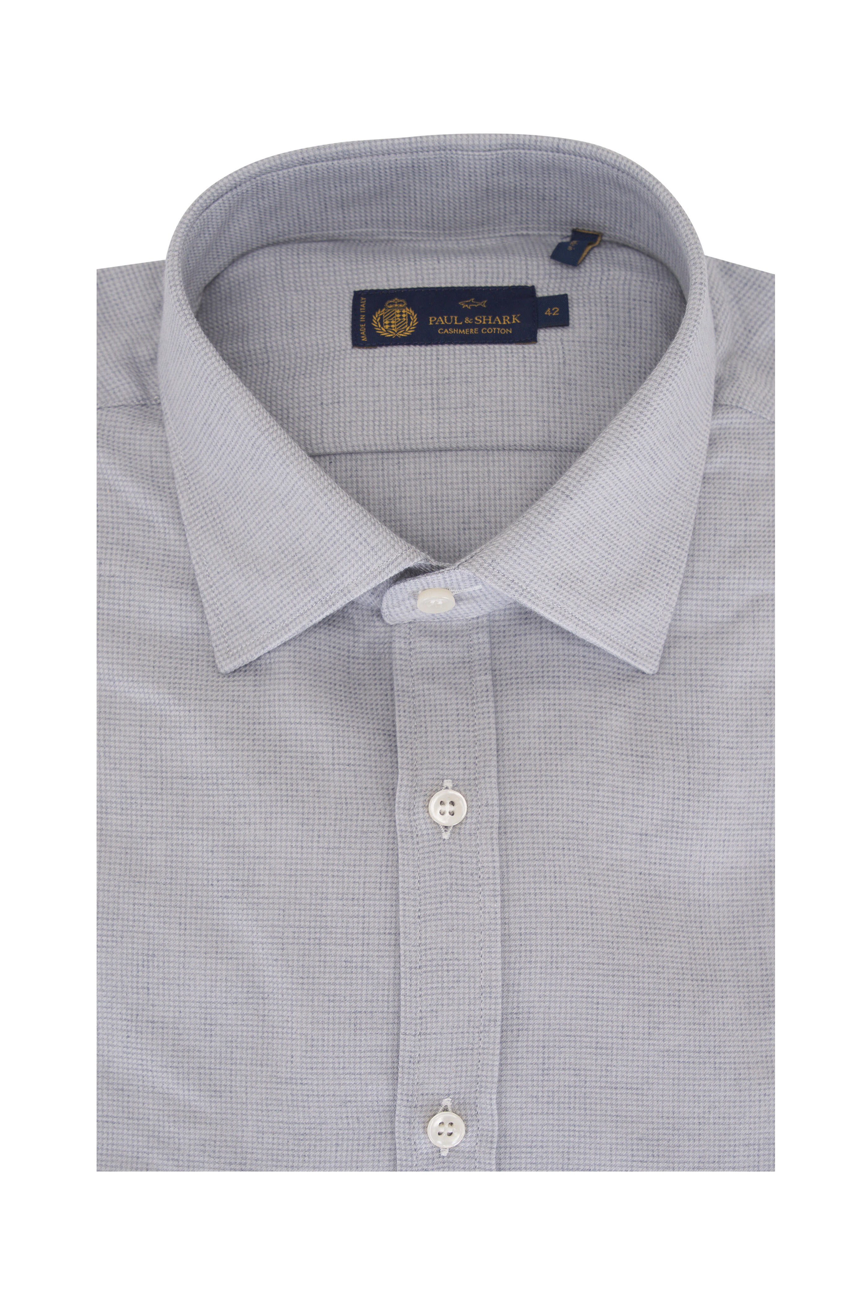 Spread collar. Front button placket. Single button barrel cuffs. Made in Italy. 85% cotton, 15% cashmere. Machine wash.