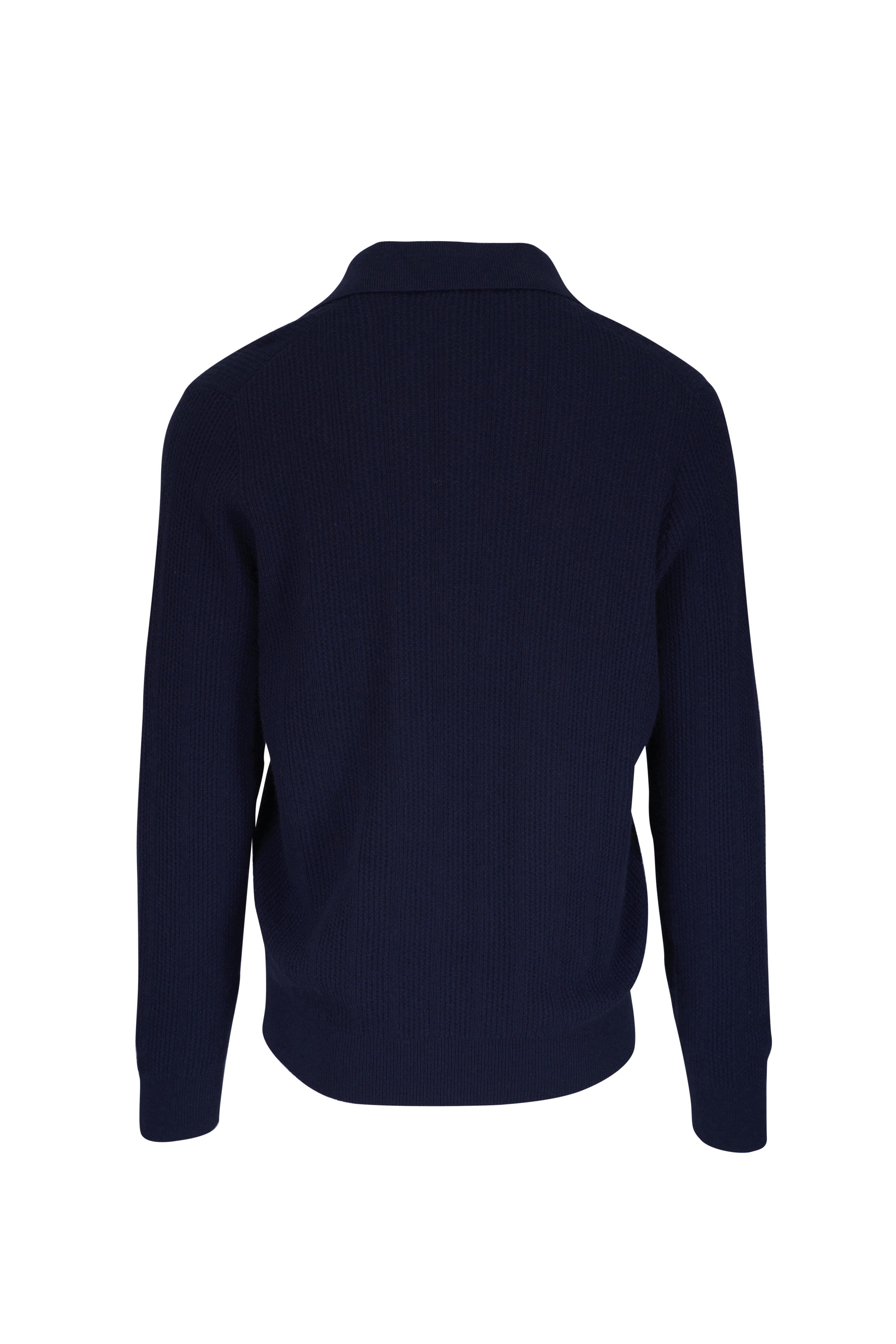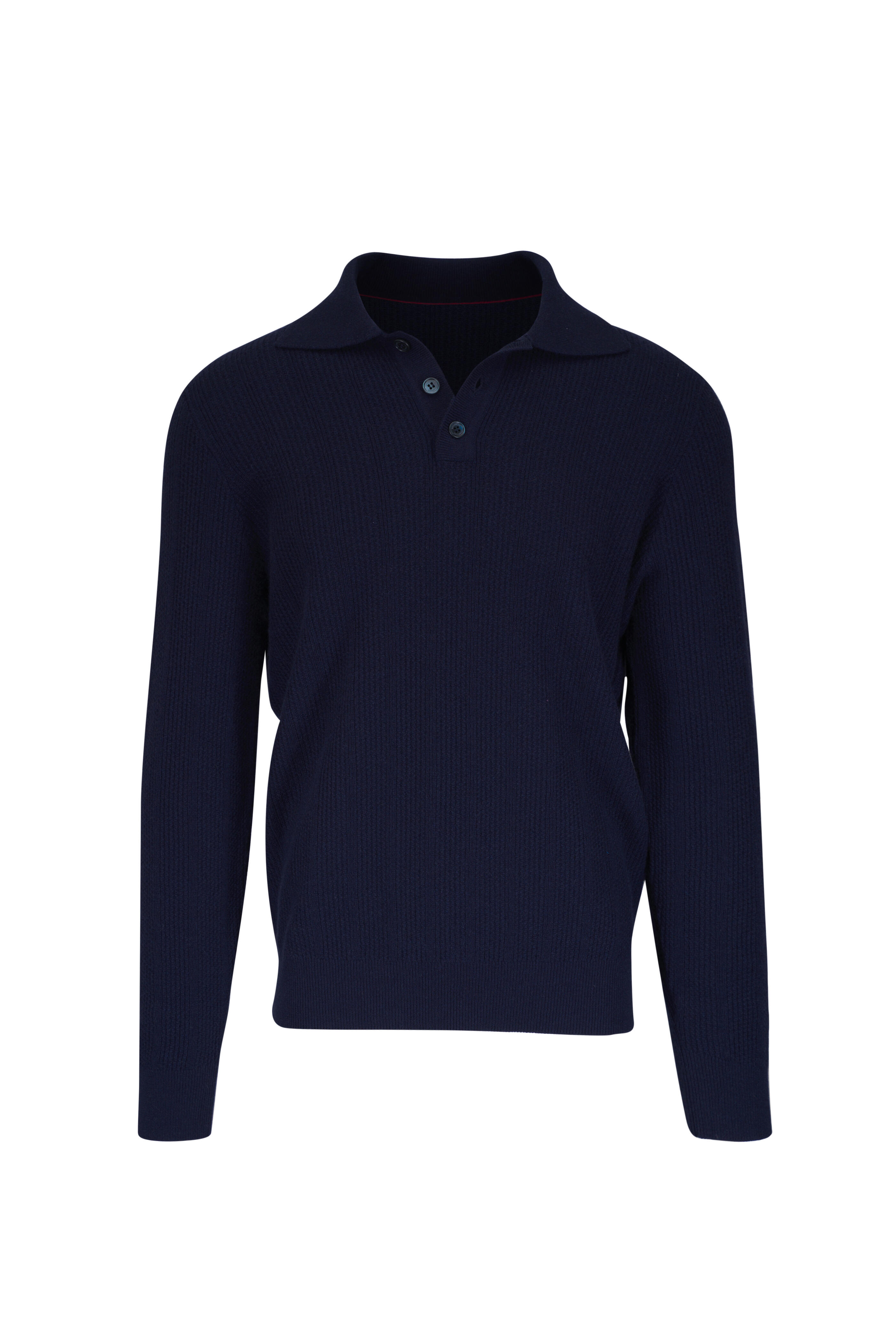 Spread collar. Three button placket. Ribbed trim. Made in Italy. 100% cashmere. Hand wash.