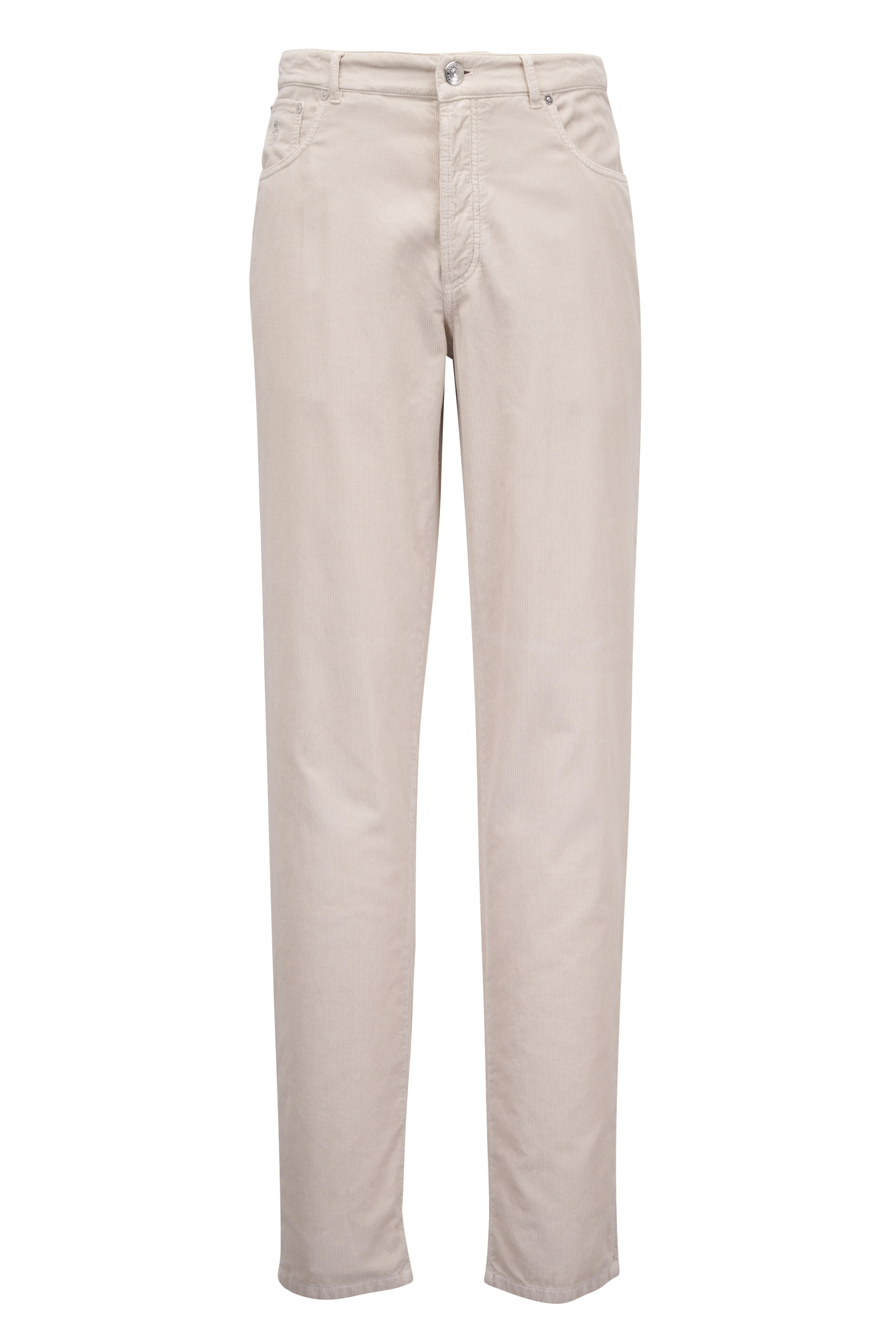 Button fly; button closure. Banded waist; belt loops. Five pocket styling. Made in Italy. 35" Inseam (size 36R). 100% cotton. Machine wash.