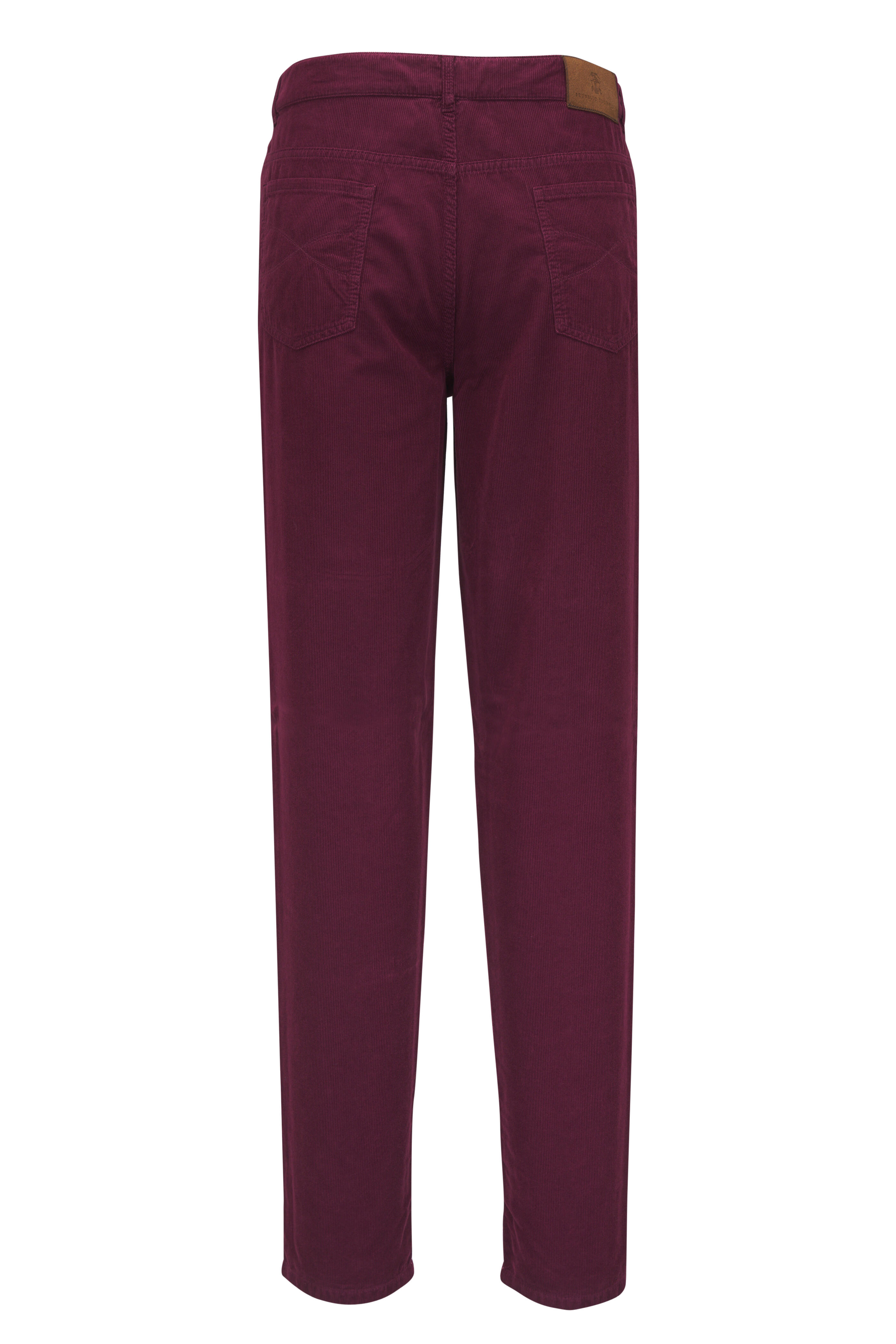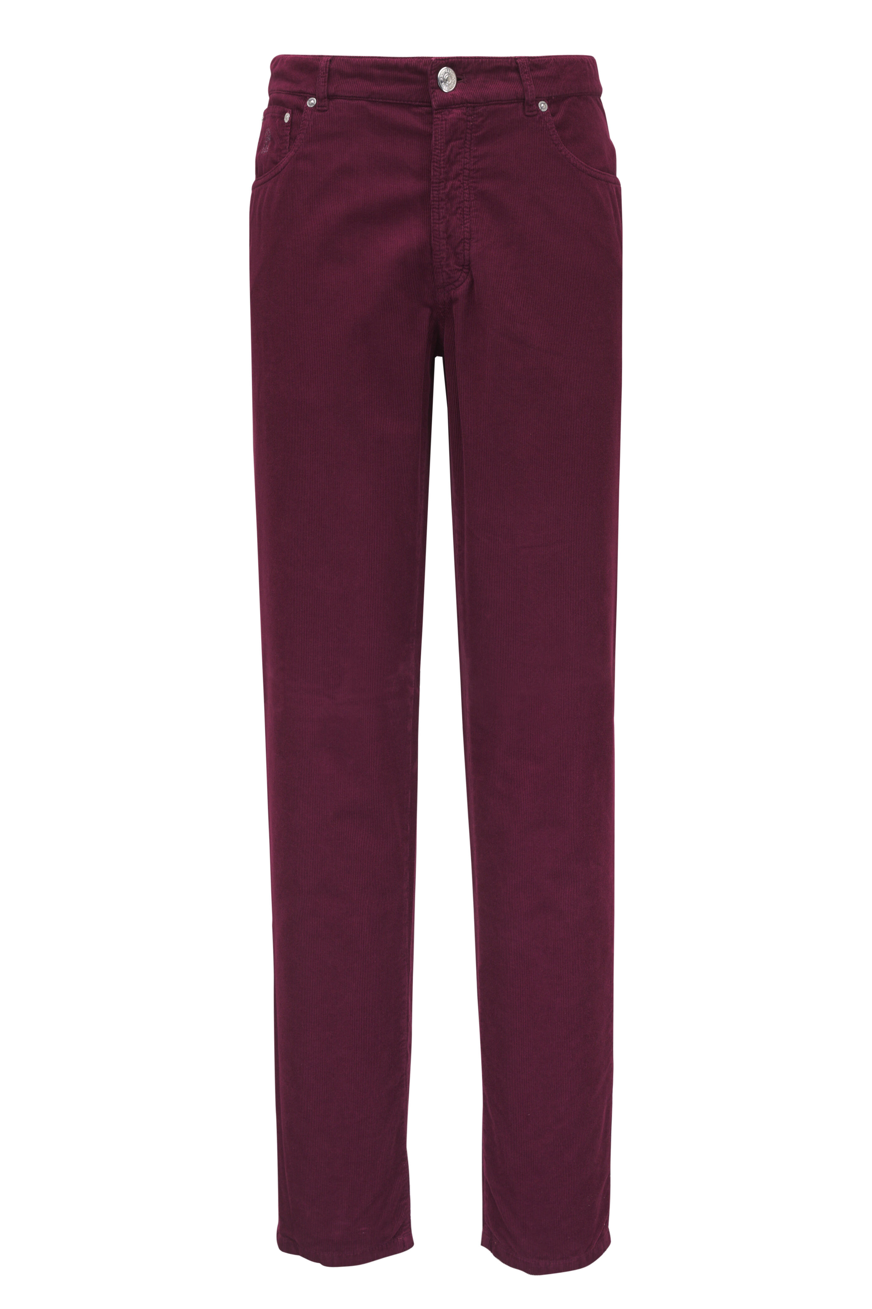 Banded waist; belt loops. Button fly. Five pocket style. Made in Italy. Inseam: 34". 100% cotton. Machine wash.