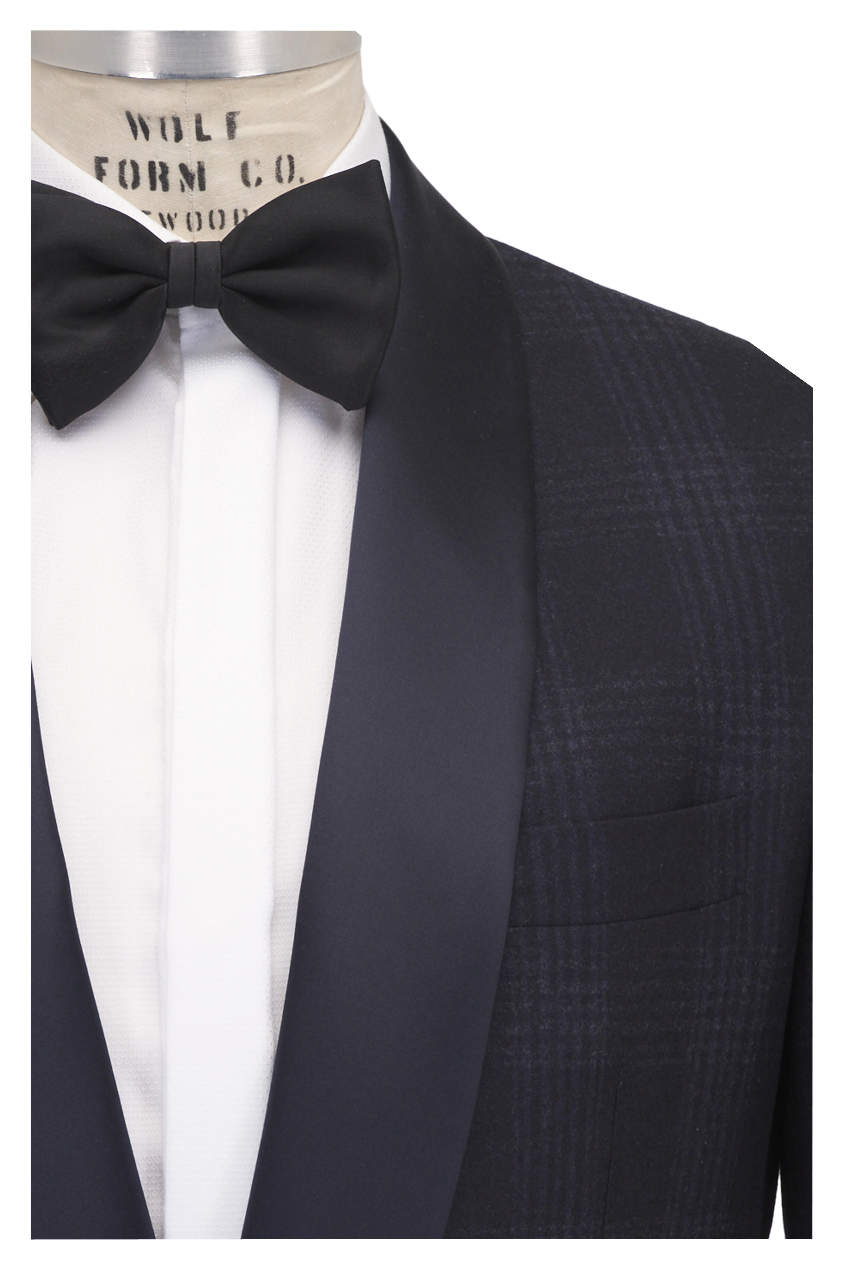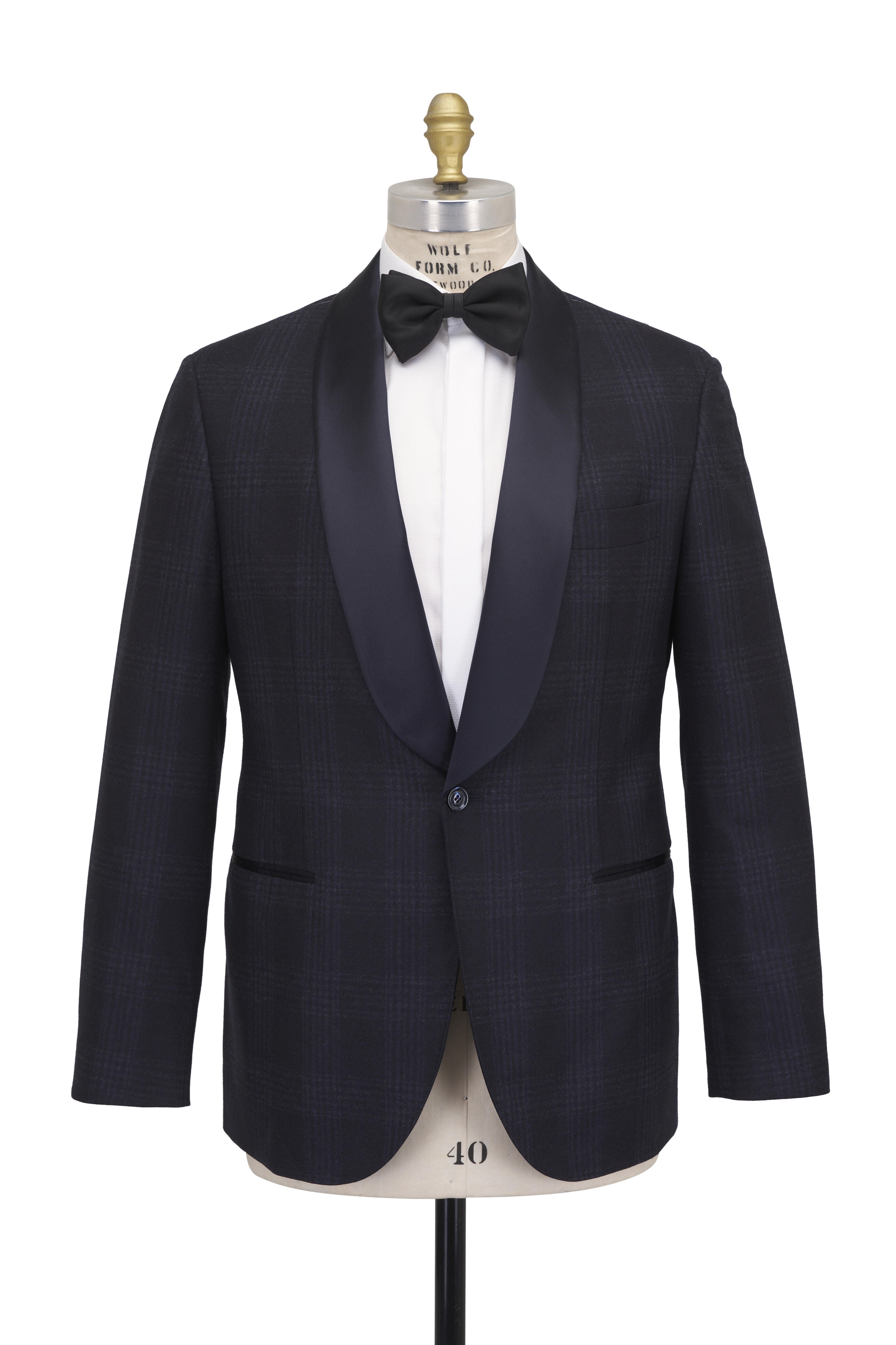 Shawl collar. Single button closure. Chest welt pocket; lower welt pockets; interior slip pockets. No buttons attached. Made in Italy. 89% wool, 6% silk, 5% cashmere; fully lined. Dry clean.