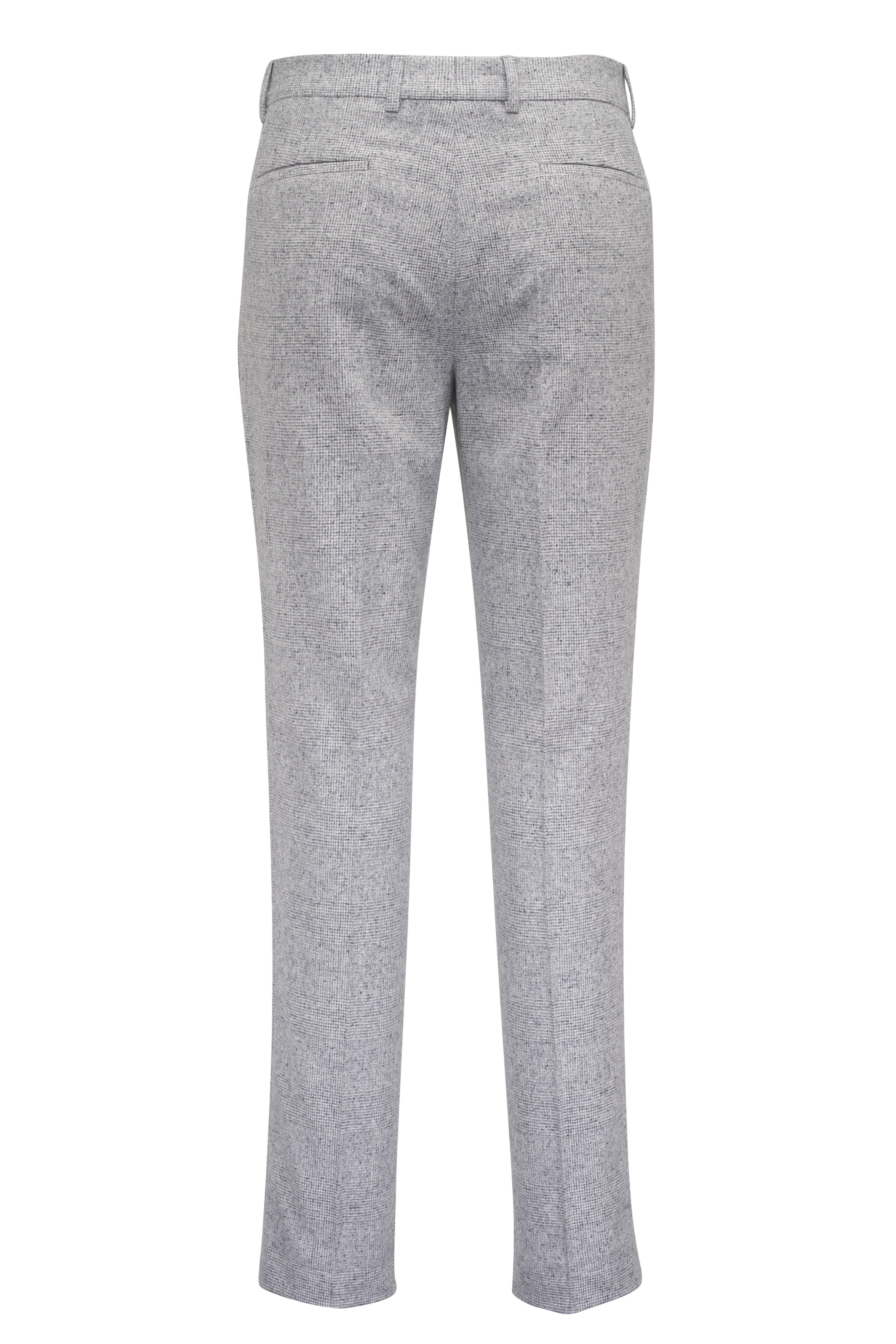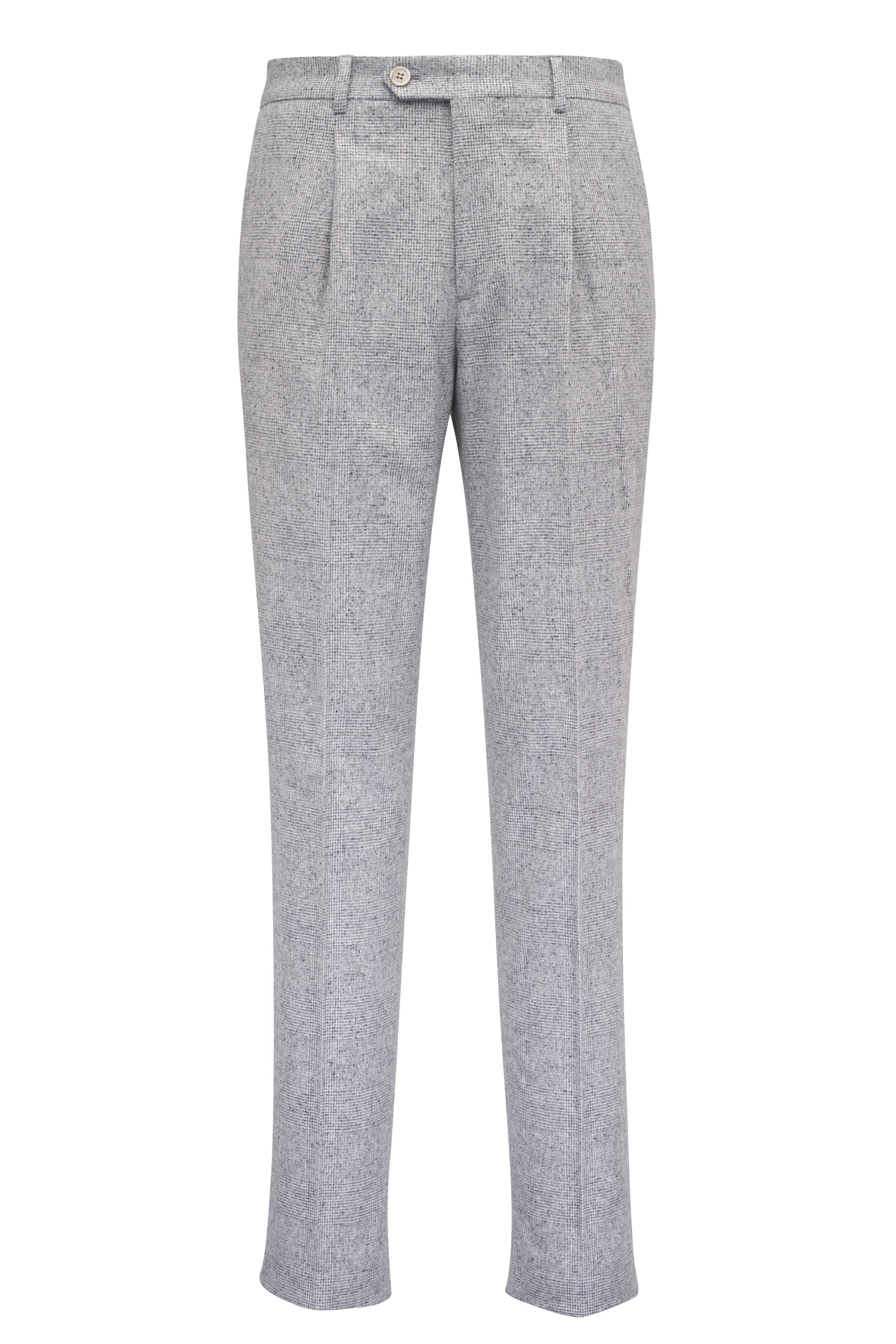 Made in Italy. Jacket: Notched lapels. Three button closure. Chest welt pocket; Lower waist flap pockets; ticket pocket. Unfinished buttonholes. Double back vents. Pants: Banded waist; belt loops. Zip fly; extended button tab. Front slip pockets; coin pocket; back besom pockets. Unfinished hem. 51% silk, 47% wool, 2% cashmere. Dry clean.