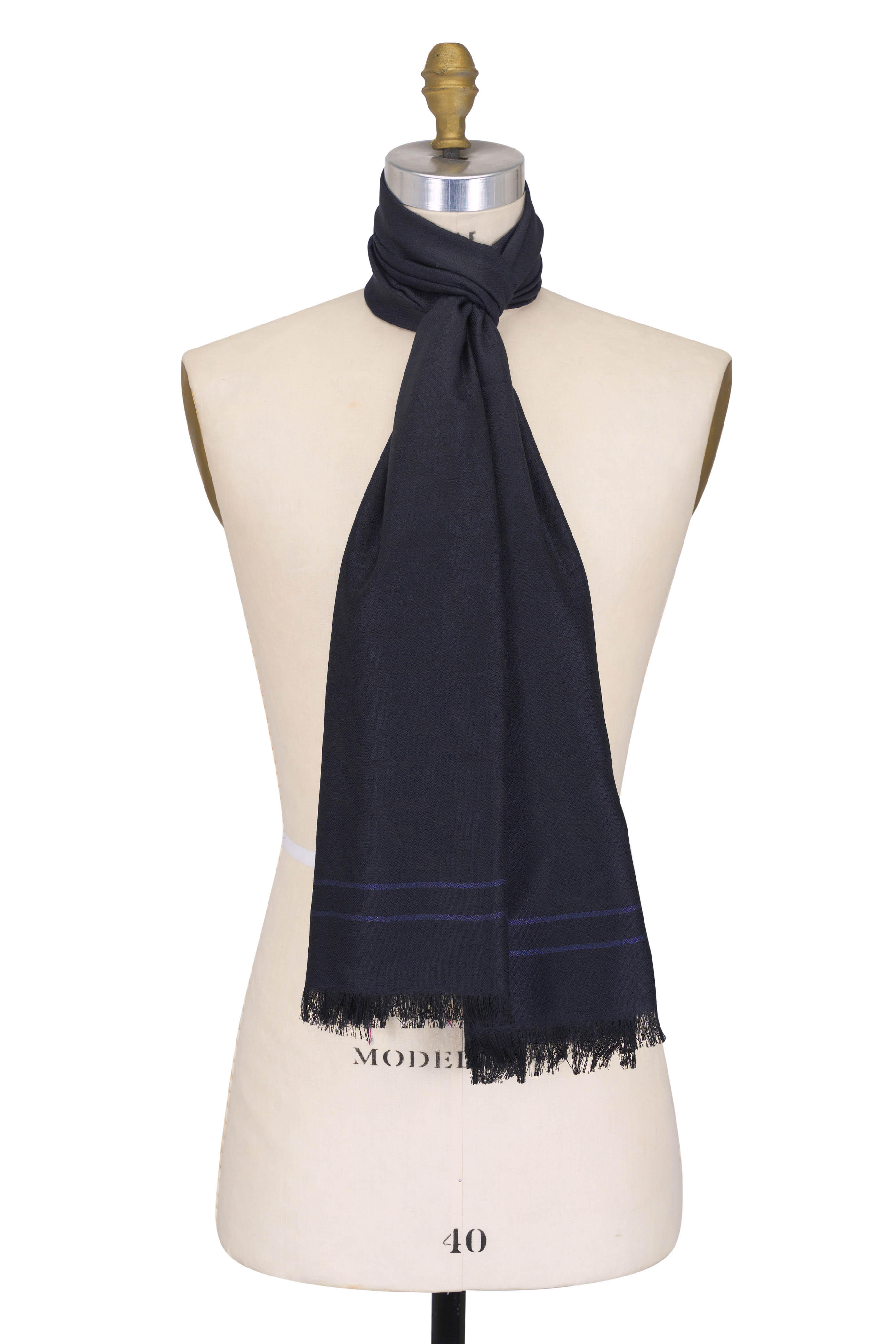 Fringe trim. Made in Italy. 21" x 79". 70% cashmere, 30% silk. Dry clean.